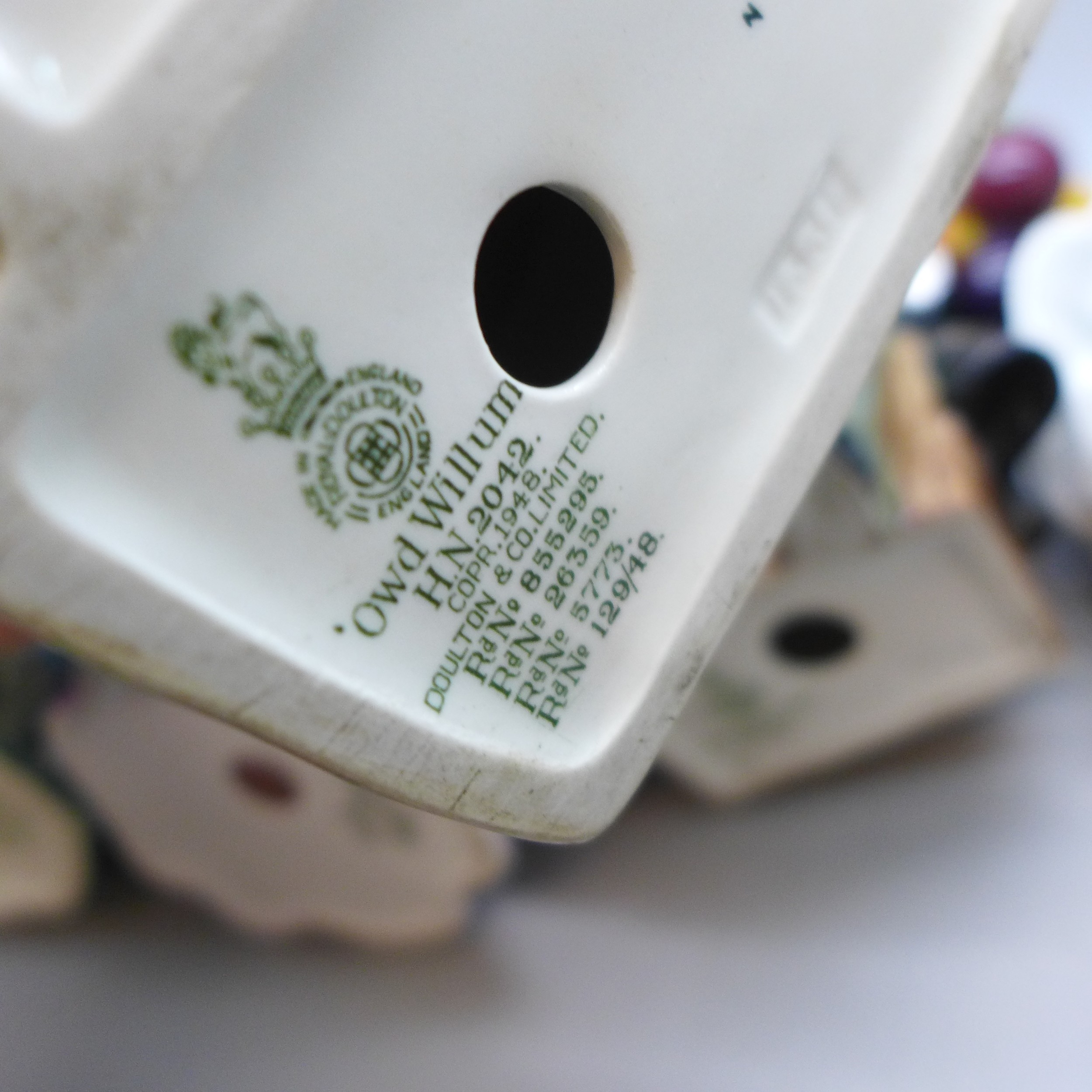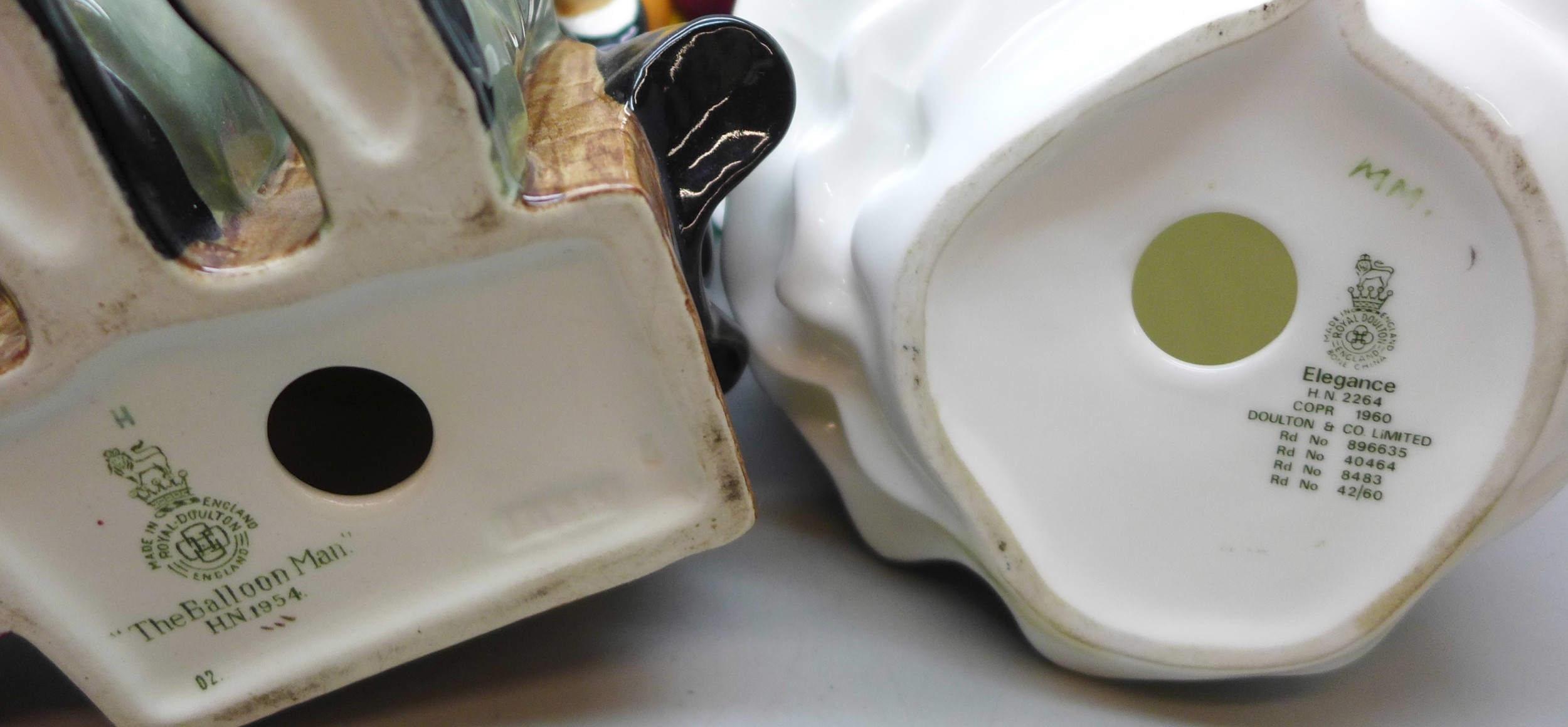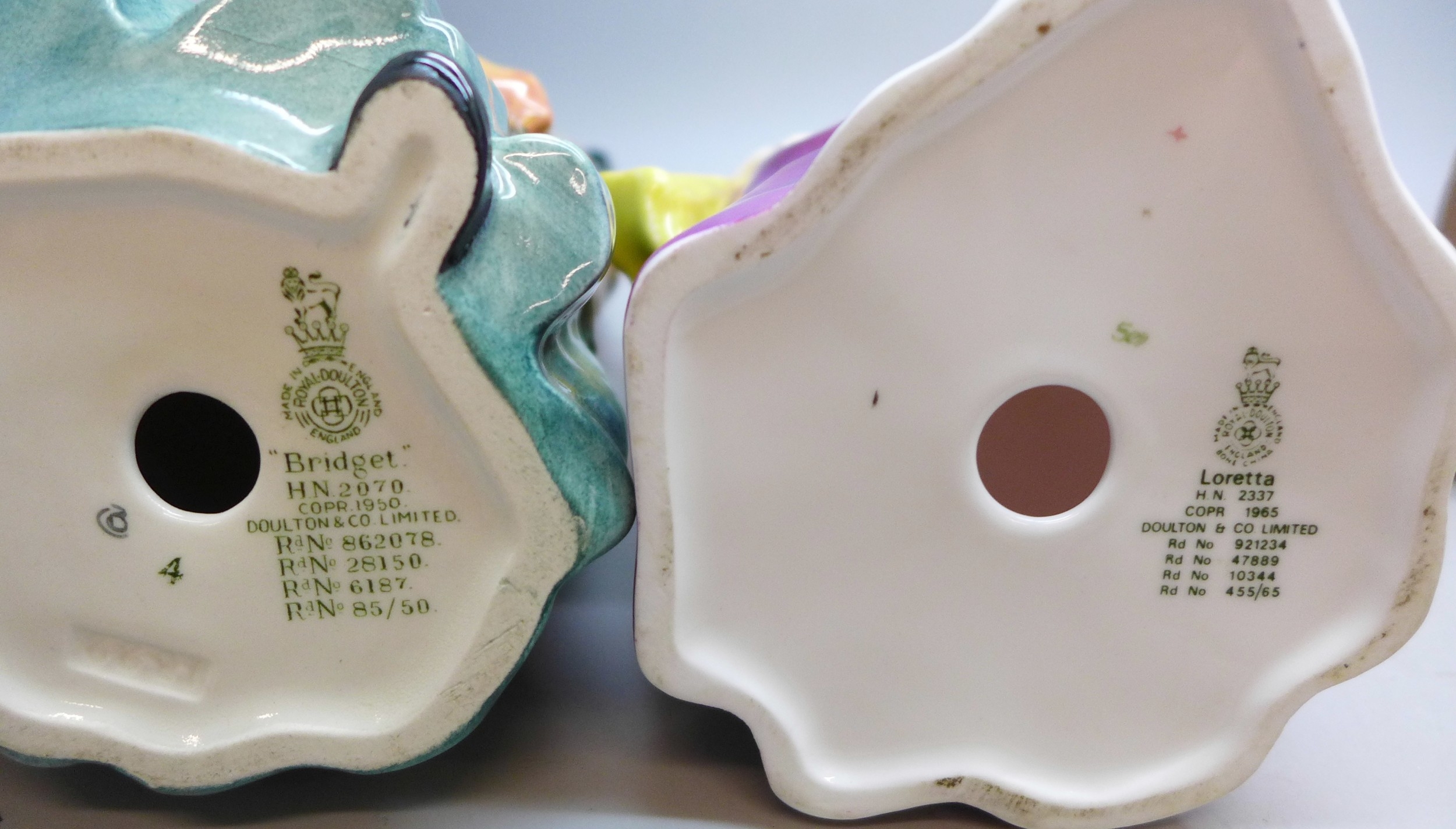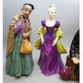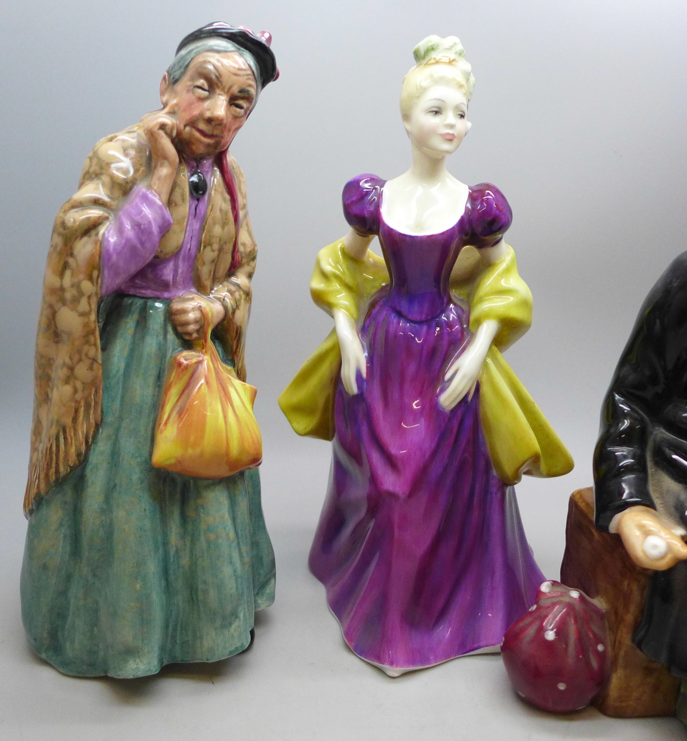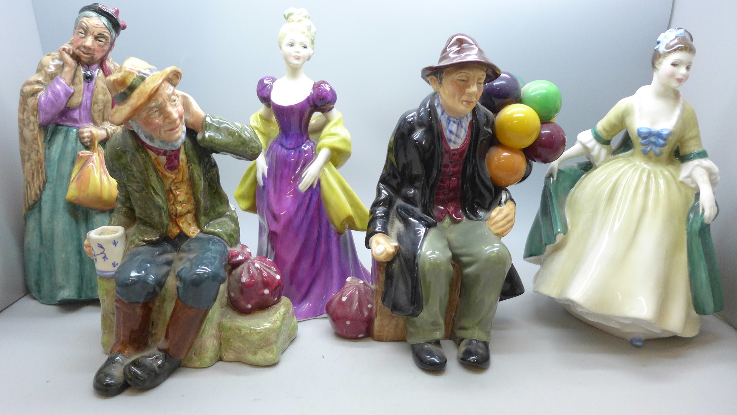A collection of Royal Doulton figures, five in total, to include Owd William, Bridget, The Balloon Man, a/f and Loretta Elegance