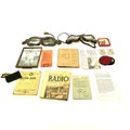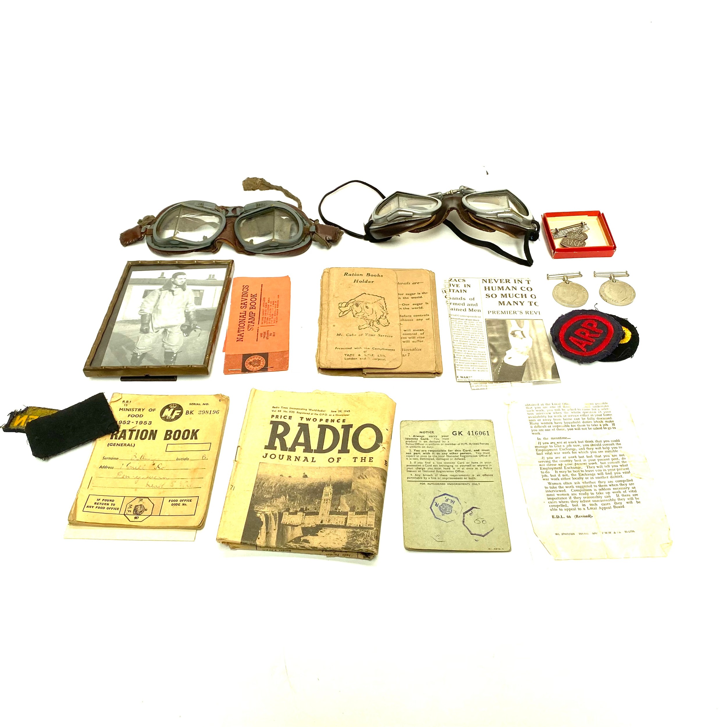Interesting collectors investigative lot. Two pairs of flying google with a picture, Silver ARP badge and ARP patches, War and defence medal and ephemera related to both wars and the family including ration books.