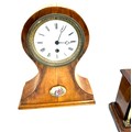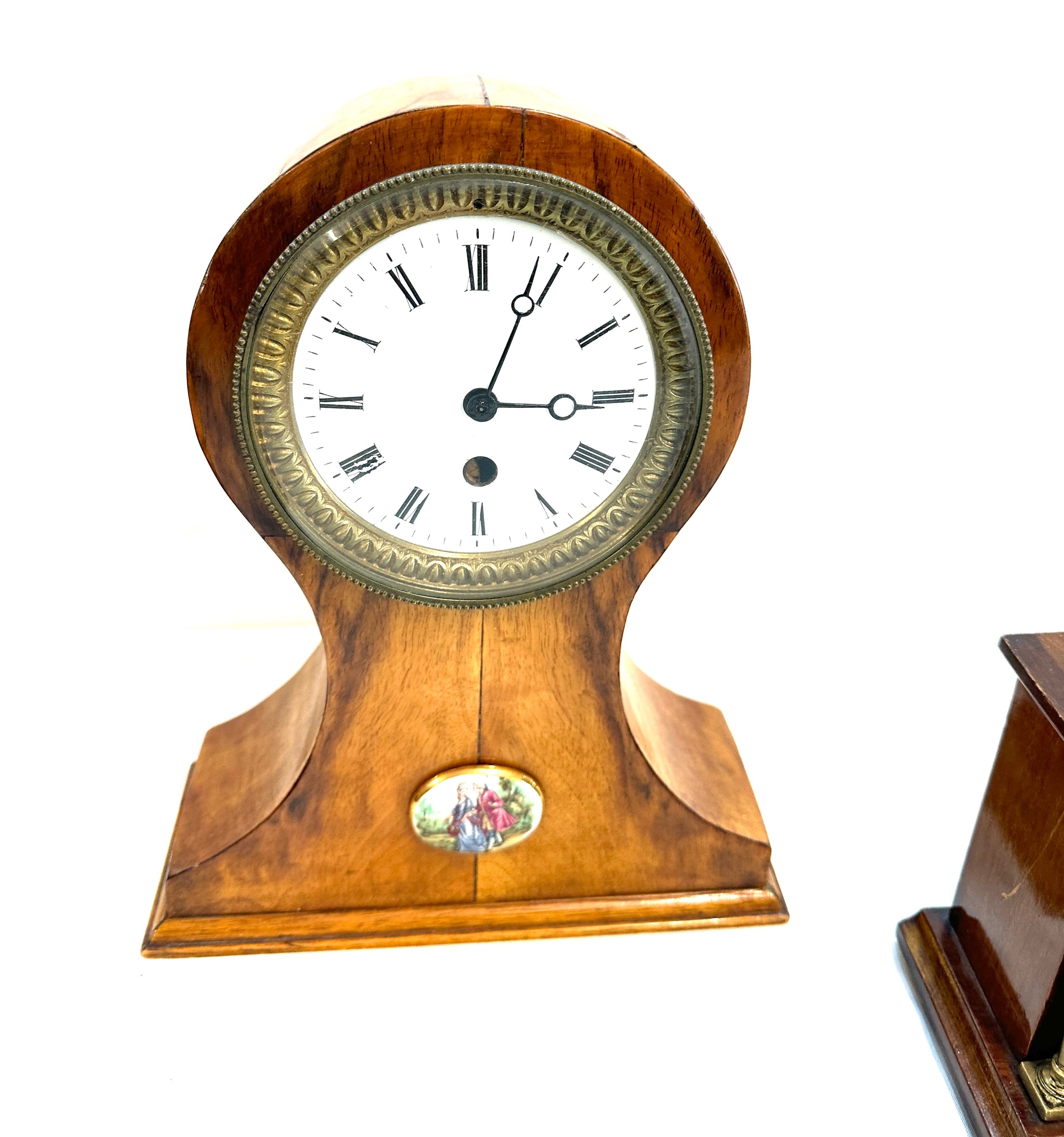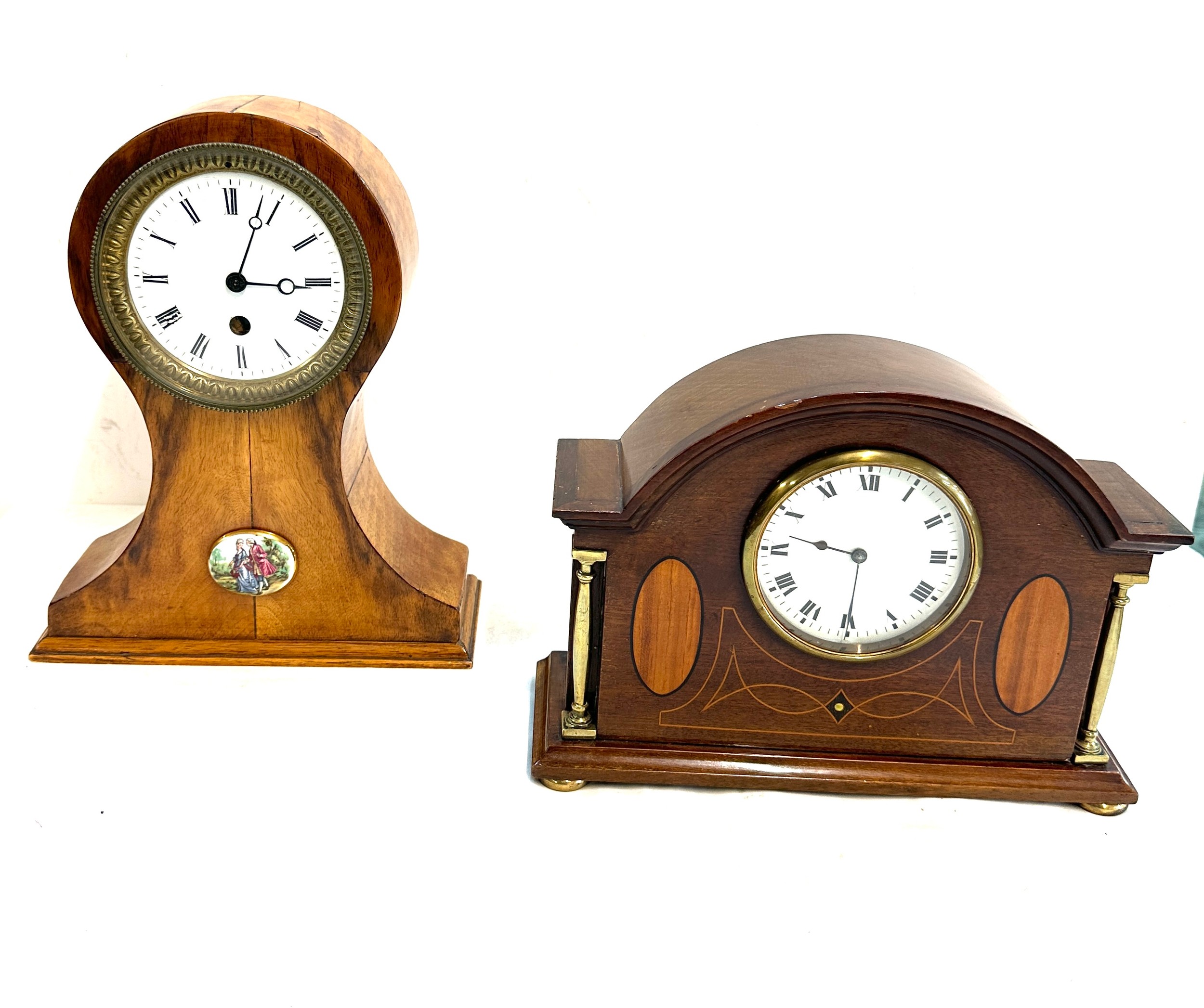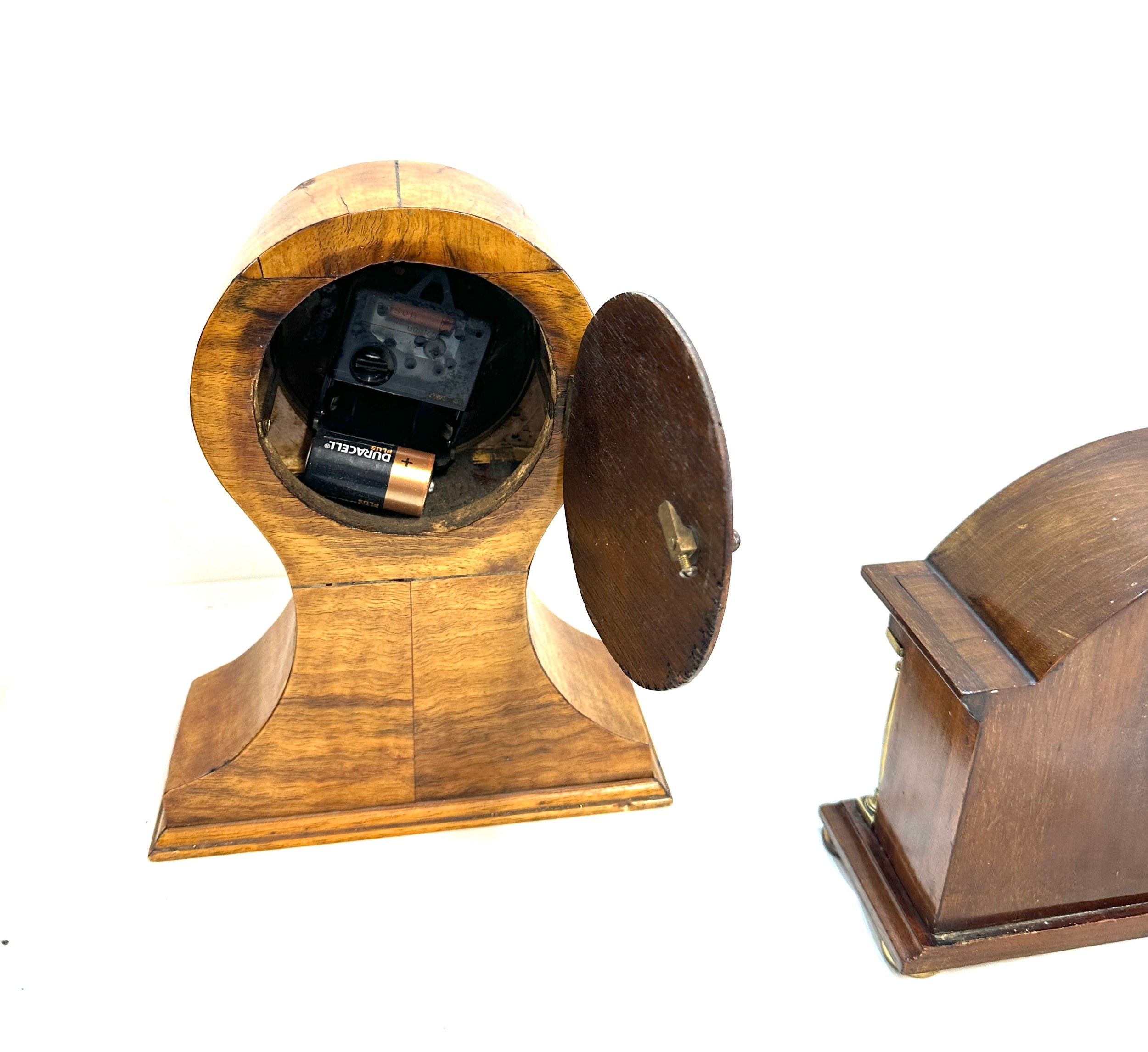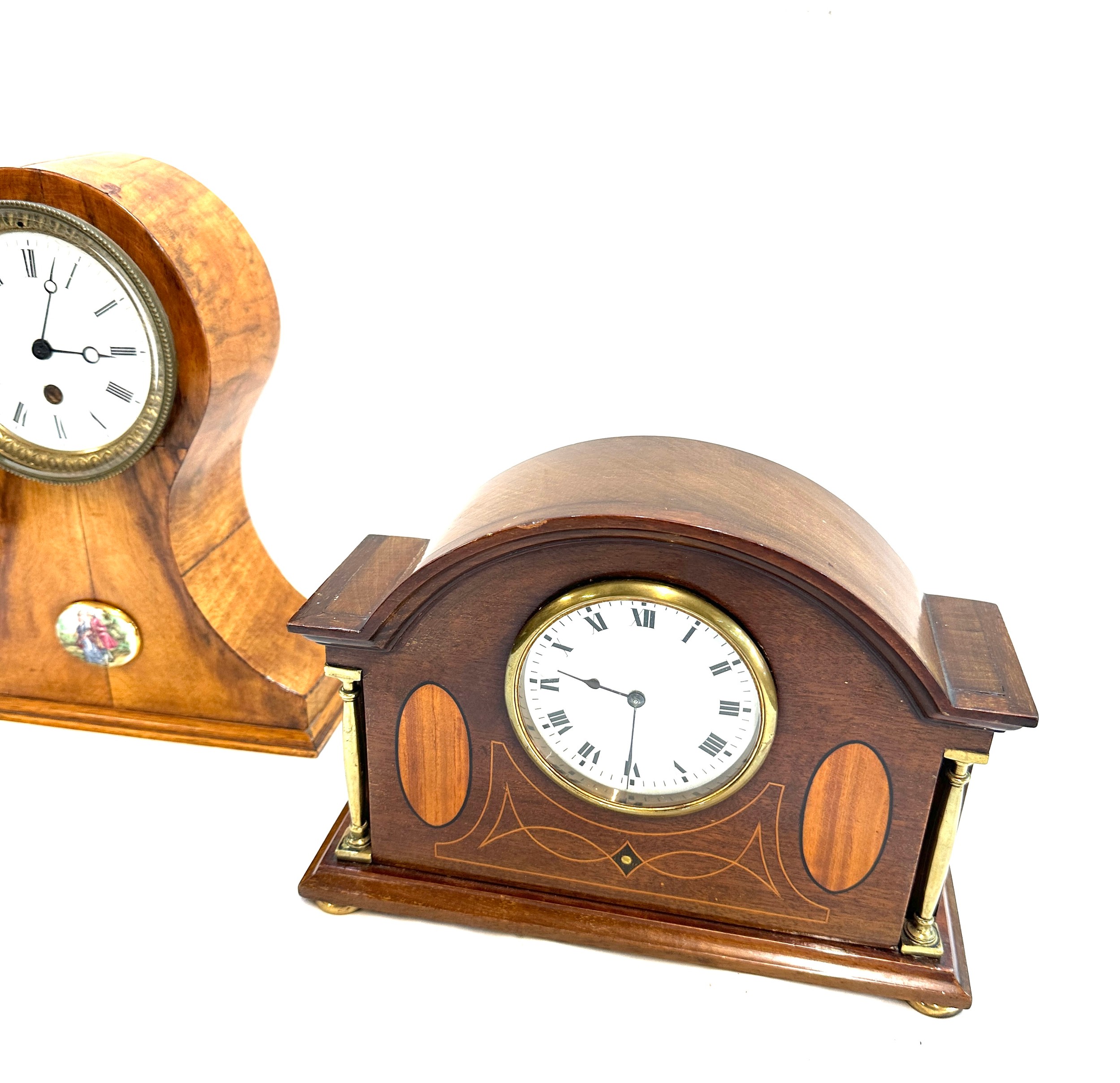 Oak inlaid mantel clock and 1 other battery mantle clock, untested