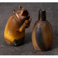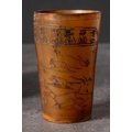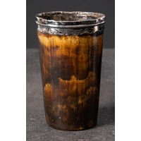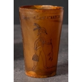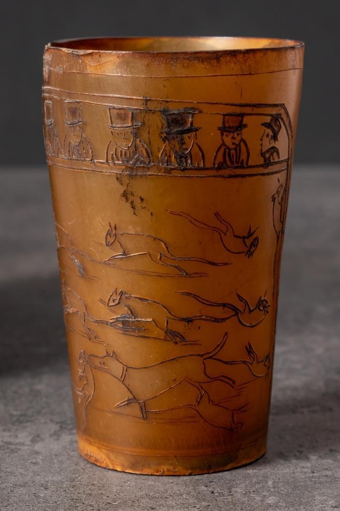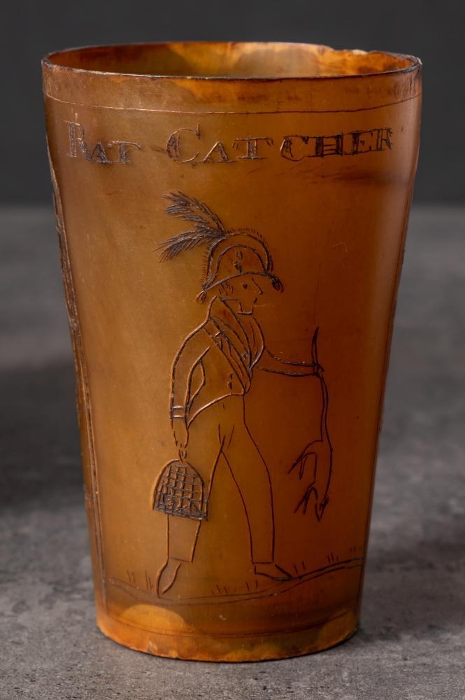 A Georgian horn beaker 'Rat Catcher': decorated with a scene of a group of gentleman watching a dog amongst rats in an arena and inscribed as per title over a portrait of a gentleman in military uniform holding a rat by its tail, 10cm high.