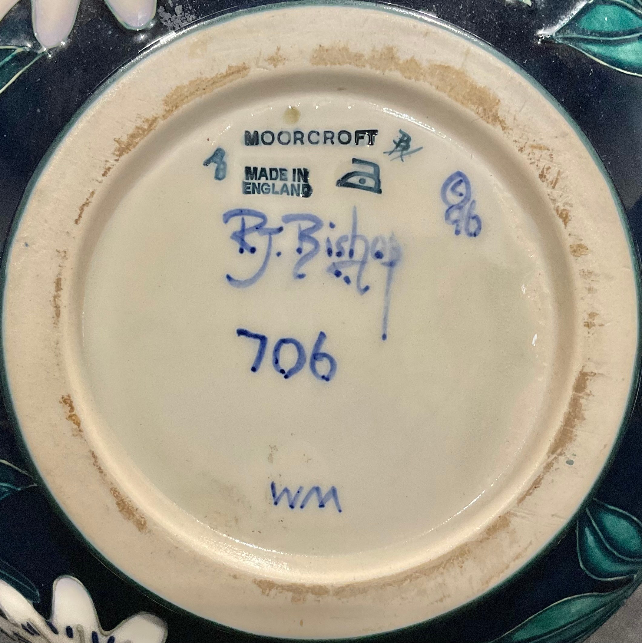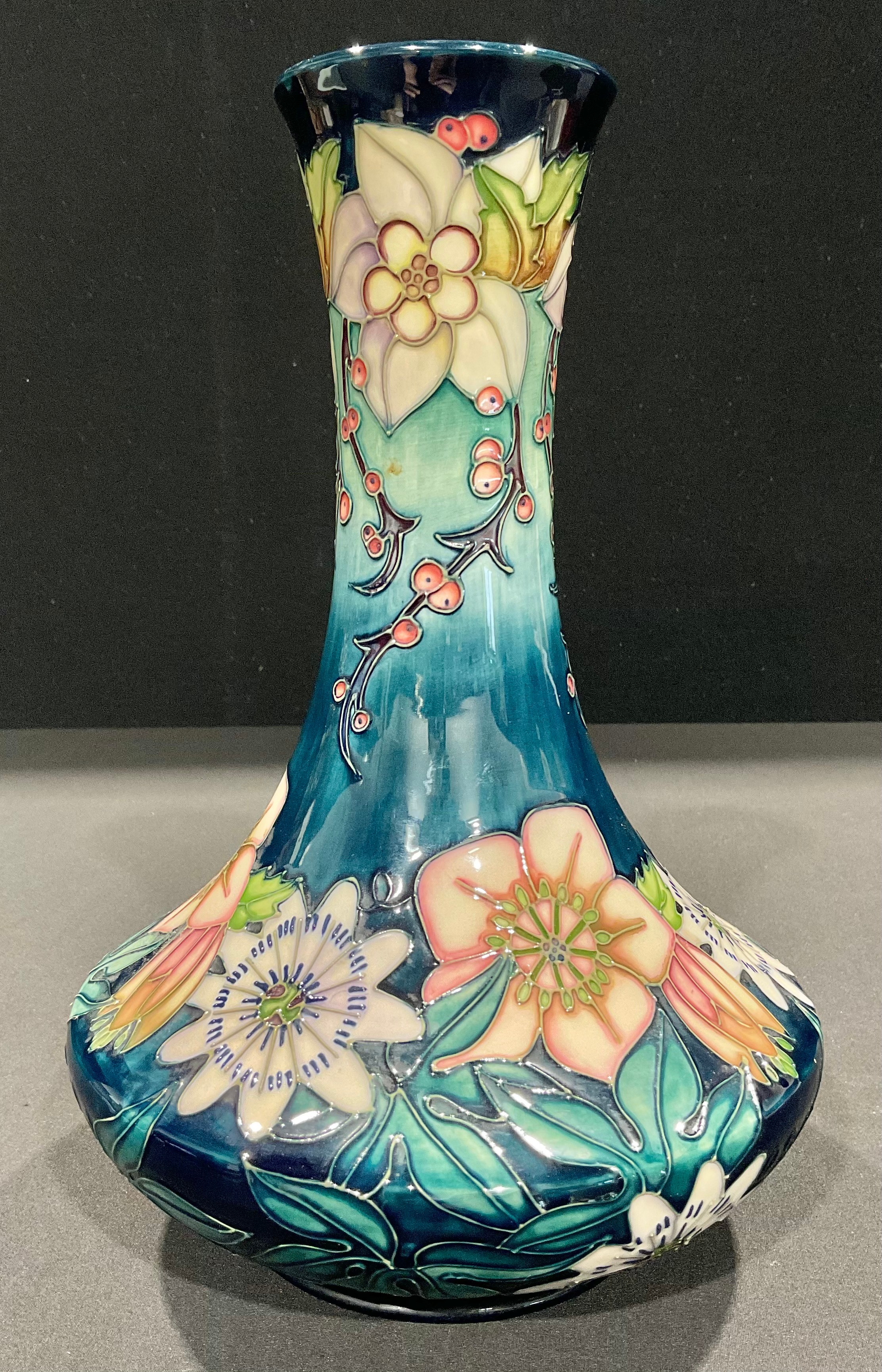 A Moorcroft bottle vase, Carousel pattern, designed by Rachel Bishop, tube lined with flowers on a green ground, in polychrome, 29cm high, impressed and painted marks, signed, c.1996