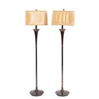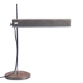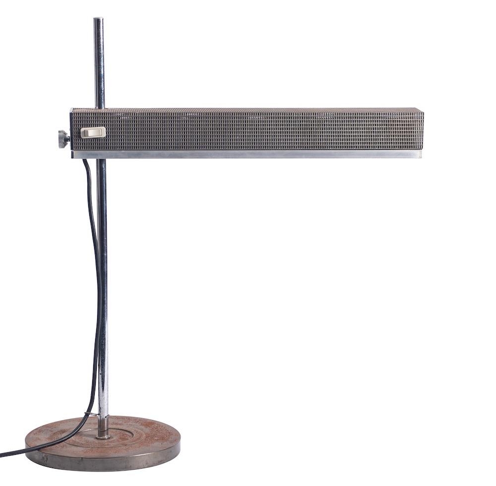 A metal adjustable desk lamp, circa 1960s; the rectangular perforated shade housing three electrical fitments, height adjustable on a chromium plated shaft, on a weighted circular base; 60cm high, 54cm wide