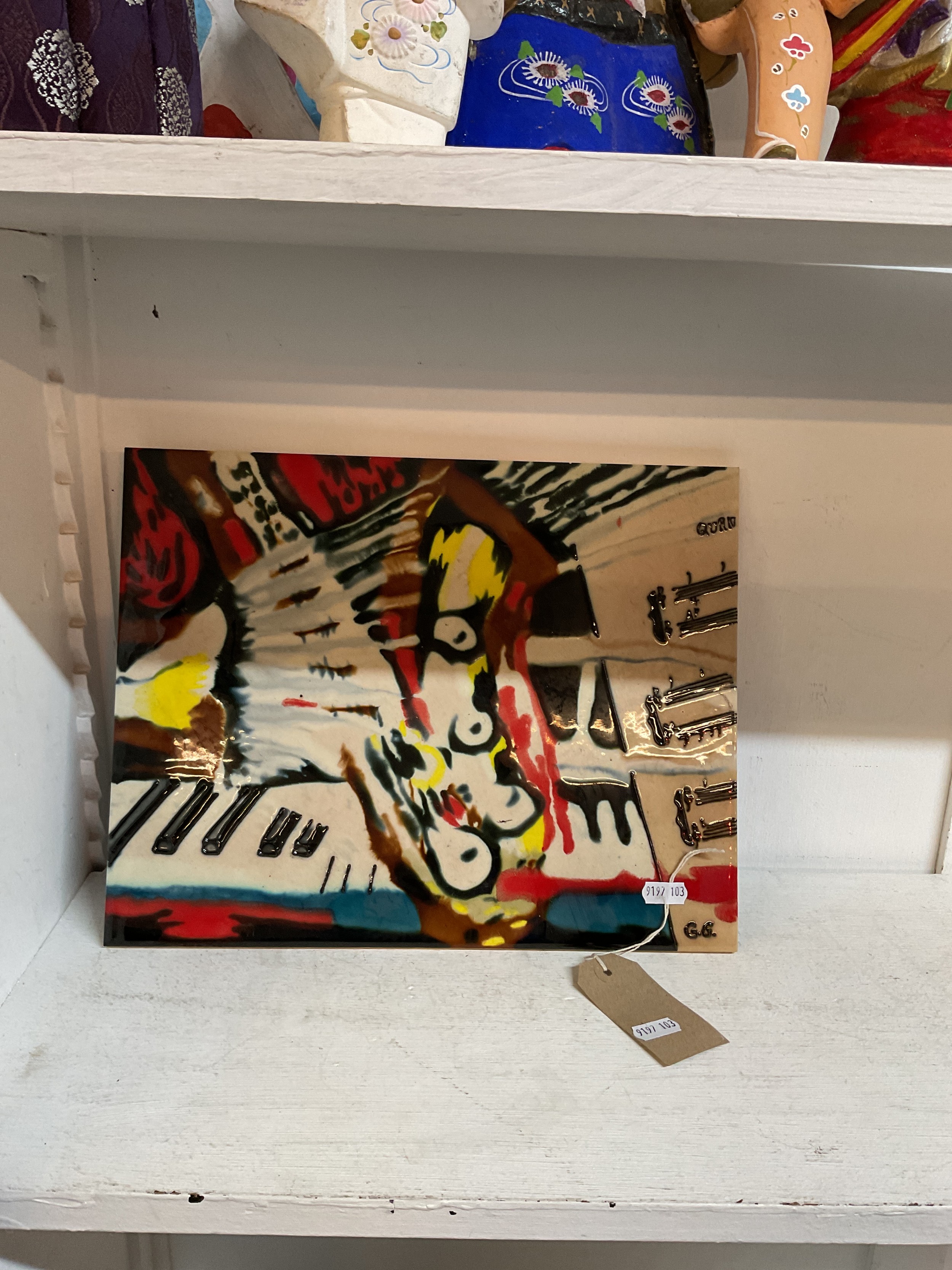 An abstract ceramic tile with piano decoration, signed Quarn