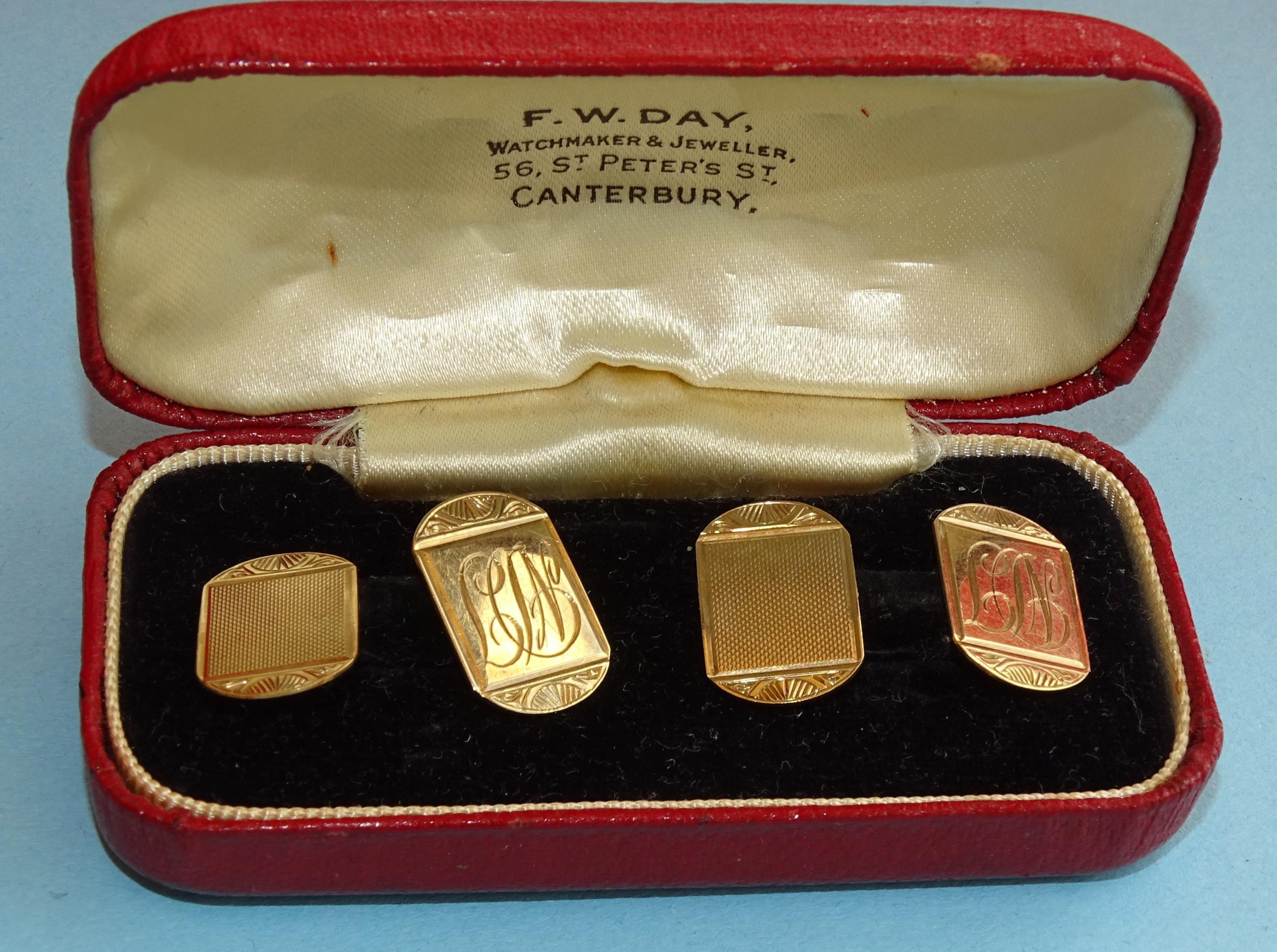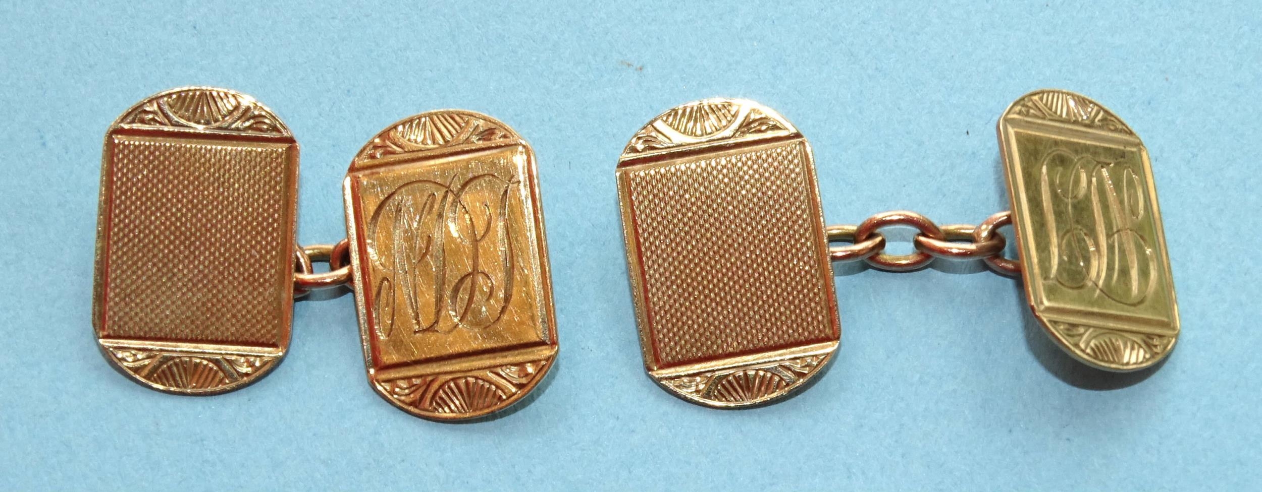 A pair of 9ct gold engine-turned cufflinks, (with engraved initials), 4.3g, (cased).