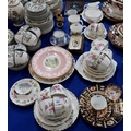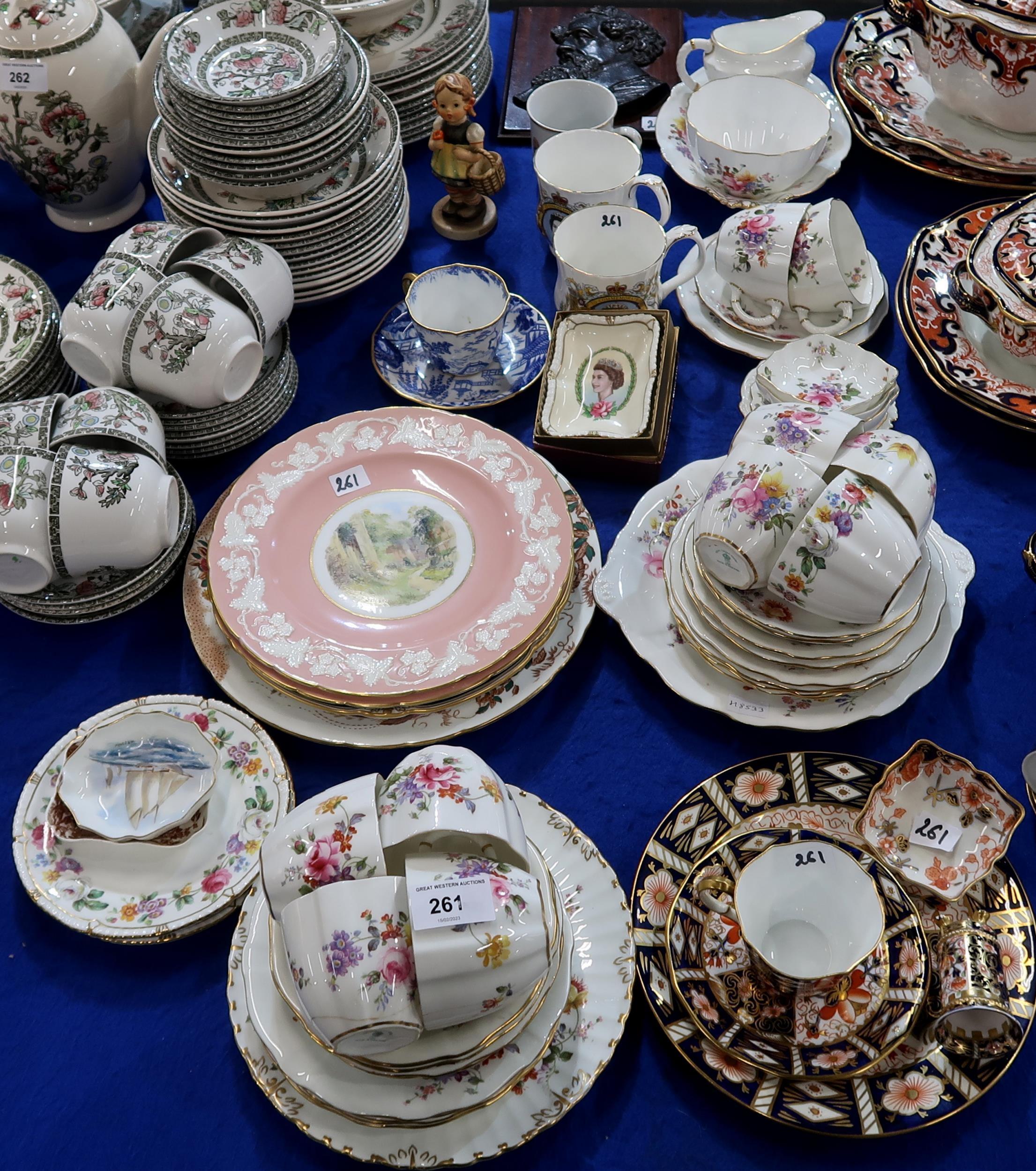 A collection of Royal Crown Derby teawares in Derby Posies pattern, an Imari cup, saucer and plate, other Derby including Chinese Birds plate, two plates painted by W.E.J Dean with High Tor Matlock and Lovers Leap Buxton and other items etc