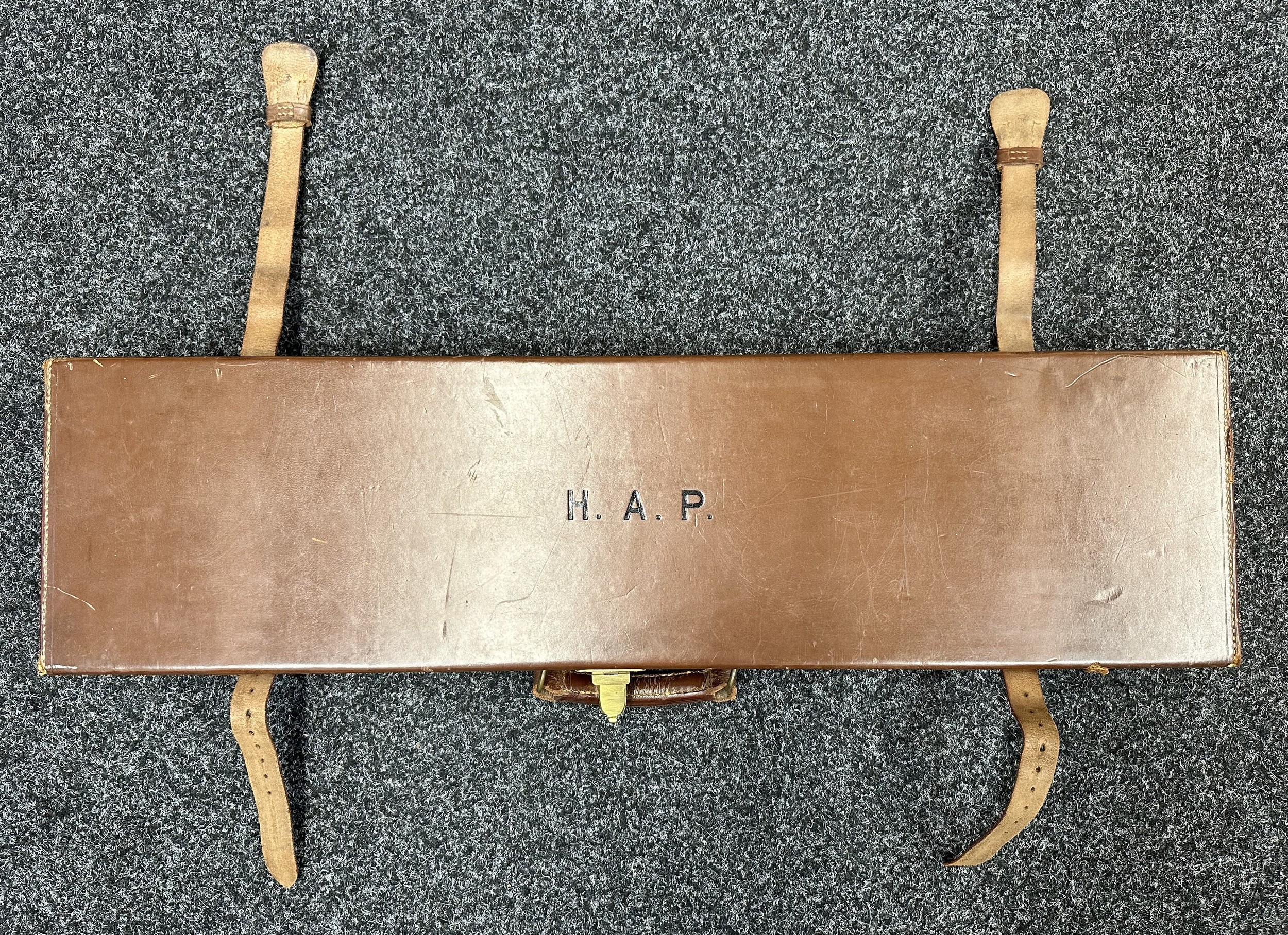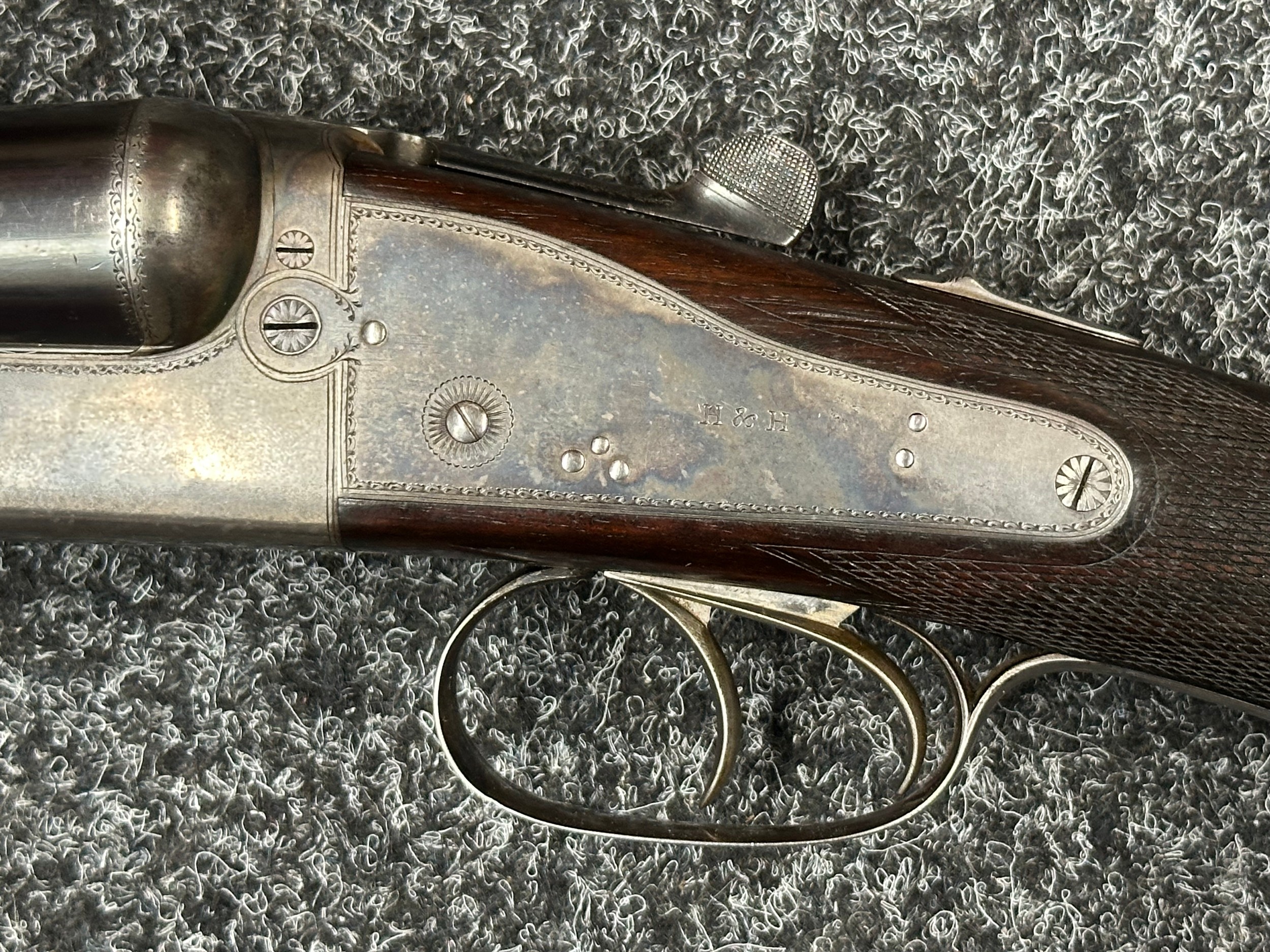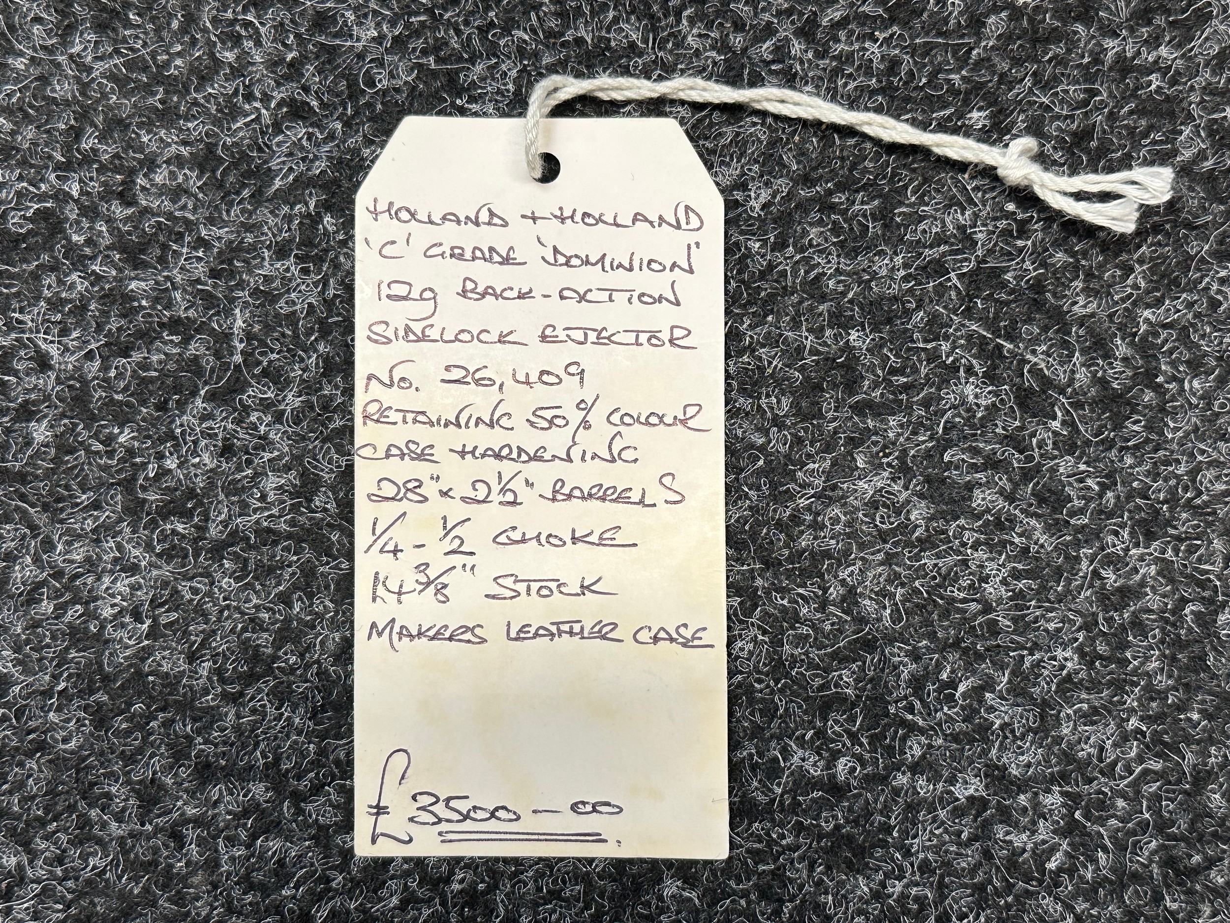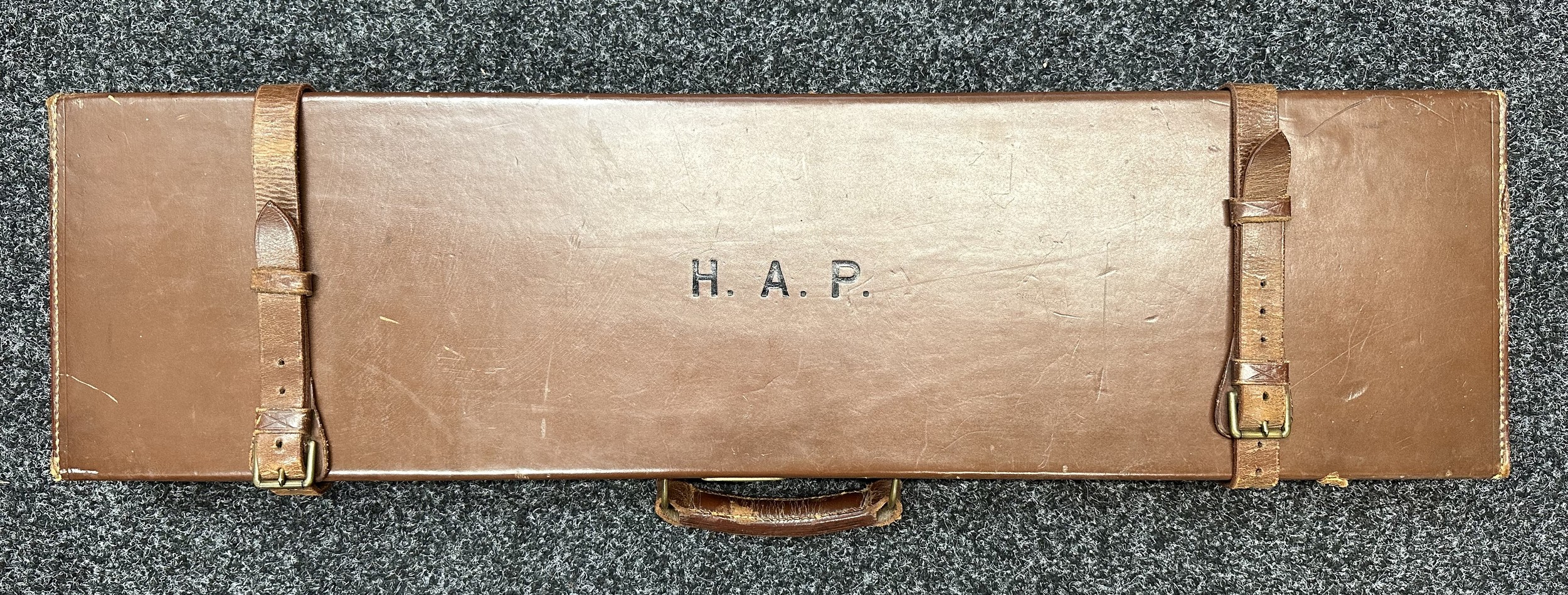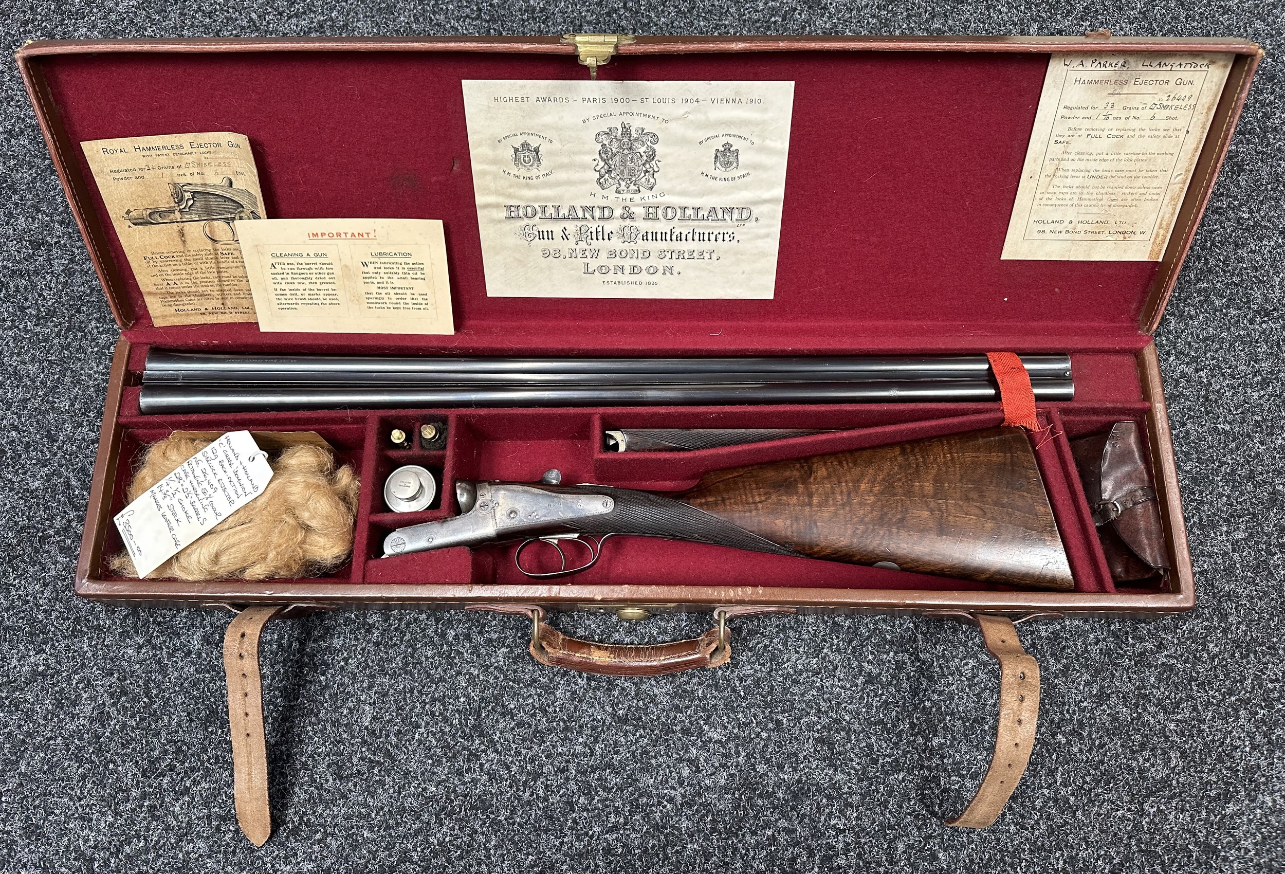 Holland & Holland 12 Bore Double Barrel Shotgun serial number 26409. 715mm long barrels (28 inch x 2 1/2) which are marked "Holland & Holland 98 New Bond Street, London". Top rib is marked "Grade C". Side lock ejector. Chokes Right barrel 1/4 and left barrel 1/2. Locks are both marked "H&H". Retains a good 50% original colour case hardening. Double trigger. Overall length 114.5cm. Stock measures 14 3/8ths of a inch. Complete in leather transit case with Holland & Holland makers lables to lid. Case contains maker marked oil bottle, unmarked wooden cleaning rods, bore brushes, H&H instruction card, etc. Lid to case is impressed with owners initials "HAP". No key to case. NOTE: Buyer must hold a valid Shotgun Certificate or be a Registered Firearms Dealer.