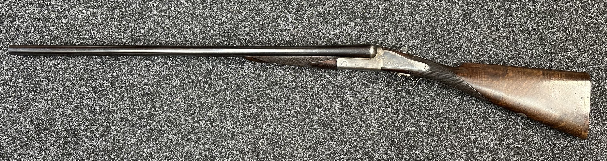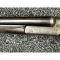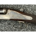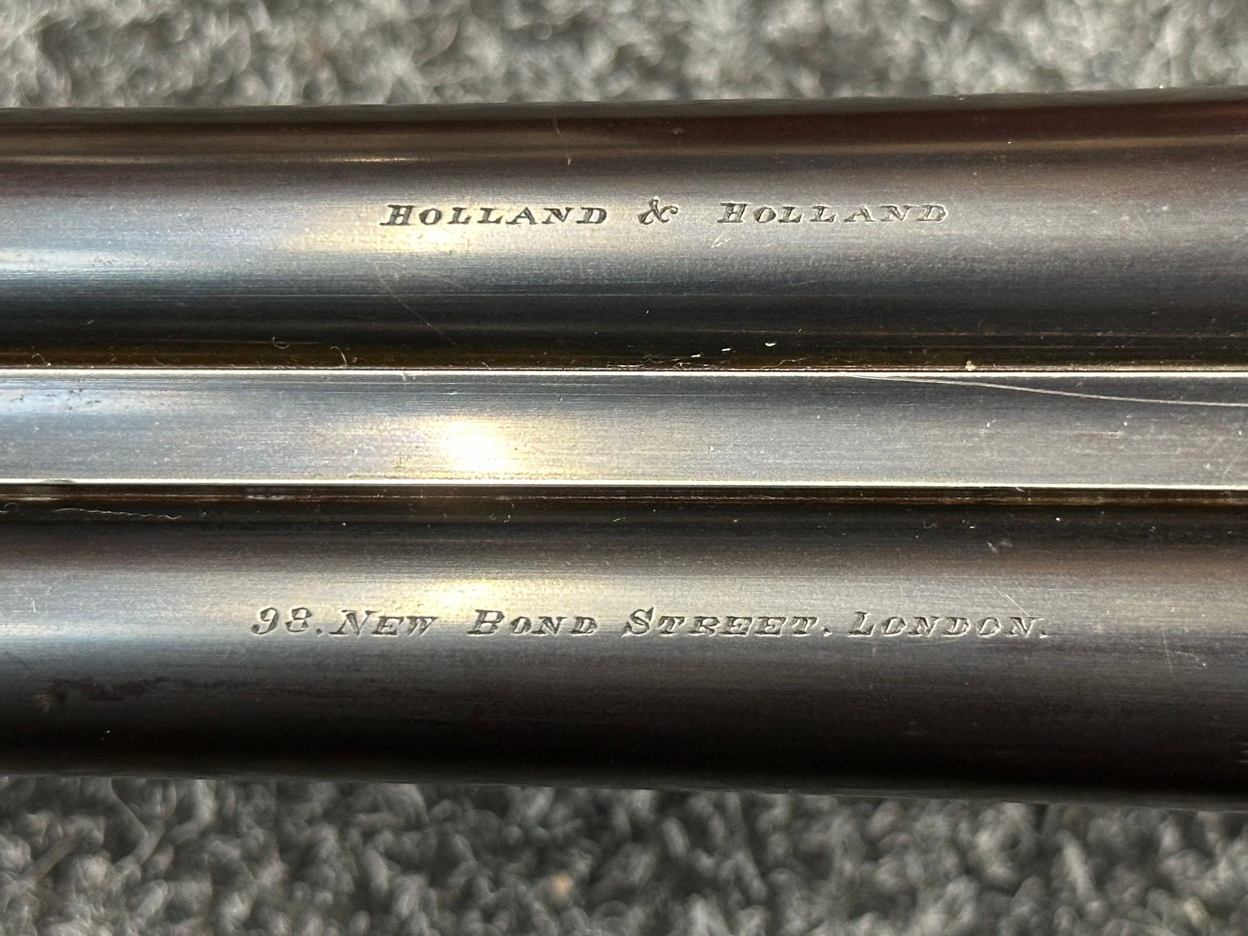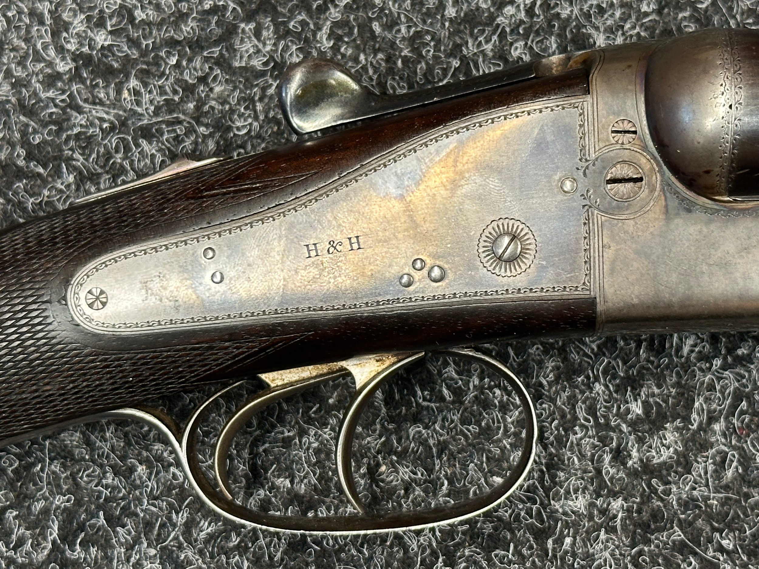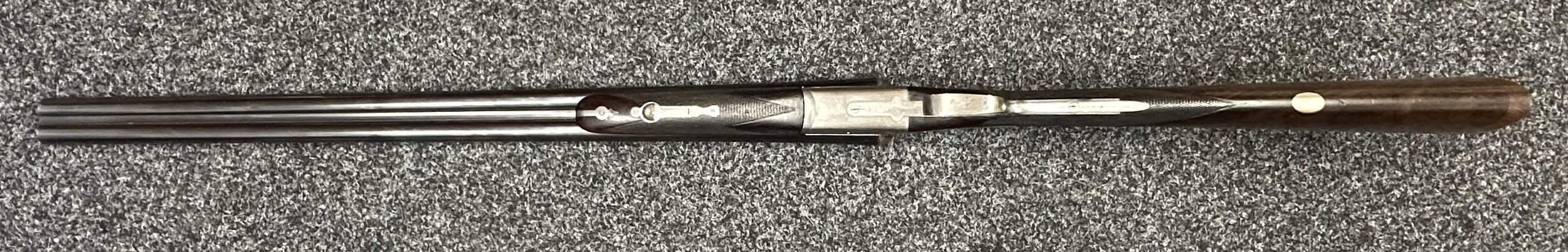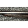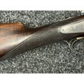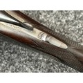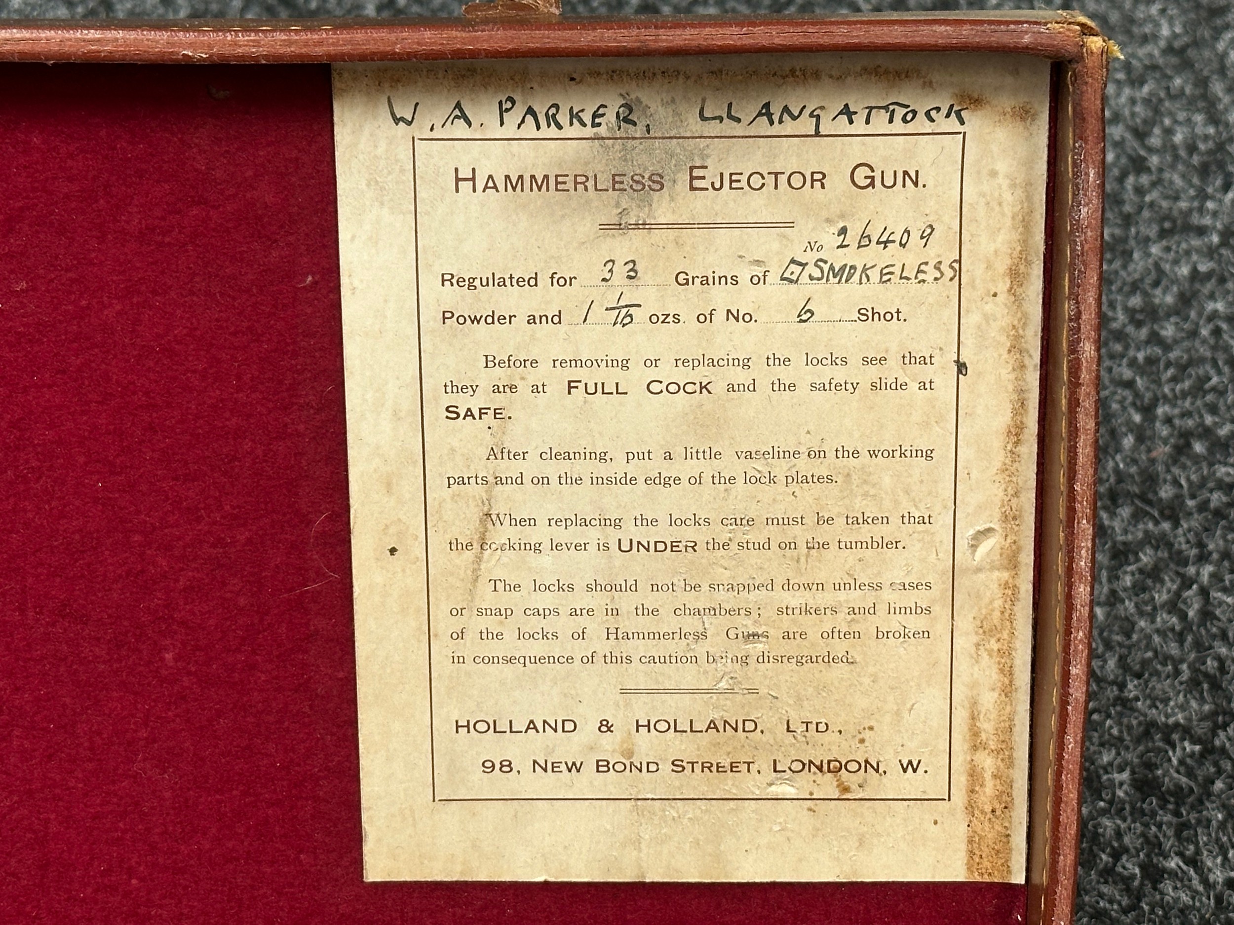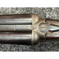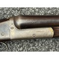 Holland & Holland 12 Bore Double Barrel Shotgun serial number 26409. 715mm long barrels (28 inch x 2 1/2) which are marked "Holland & Holland 98 New Bond Street, London". Top rib is marked "Grade C". Side lock ejector. Chokes Right barrel 1/4 and left barrel 1/2. Locks are both marked "H&H". Retains a good 50% original colour case hardening. Double trigger. Overall length 114.5cm. Stock measures 14 3/8ths of a inch. Complete in leather transit case with Holland & Holland makers lables to lid. Case contains maker marked oil bottle, unmarked wooden cleaning rods, bore brushes, H&H instruction card, etc. Lid to case is impressed with owners initials "HAP". No key to case. NOTE: Buyer must hold a valid Shotgun Certificate or be a Registered Firearms Dealer.