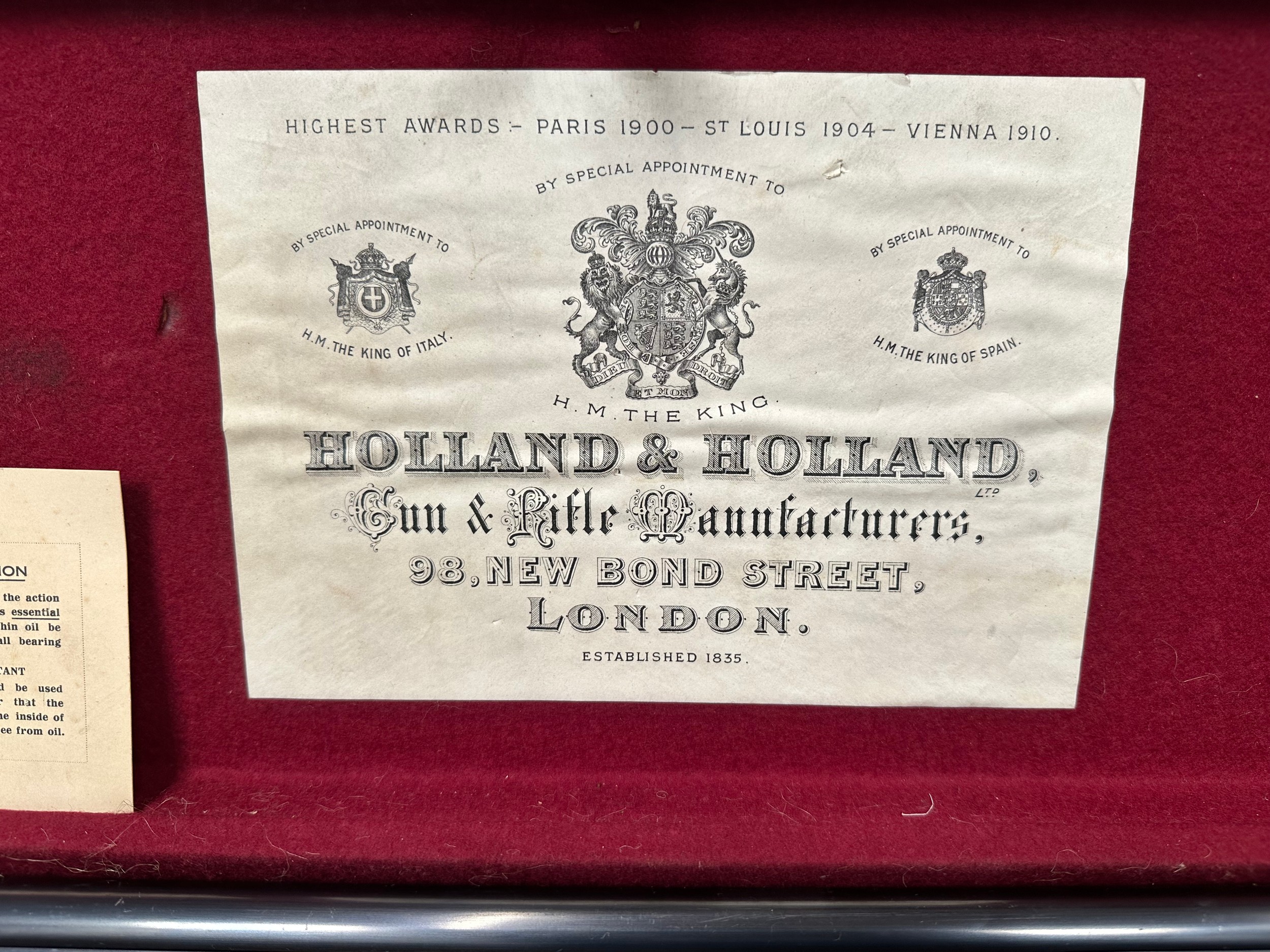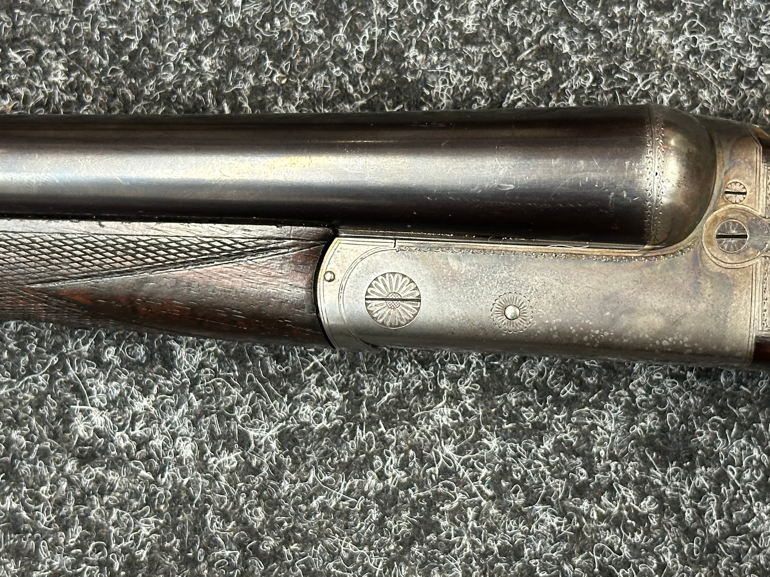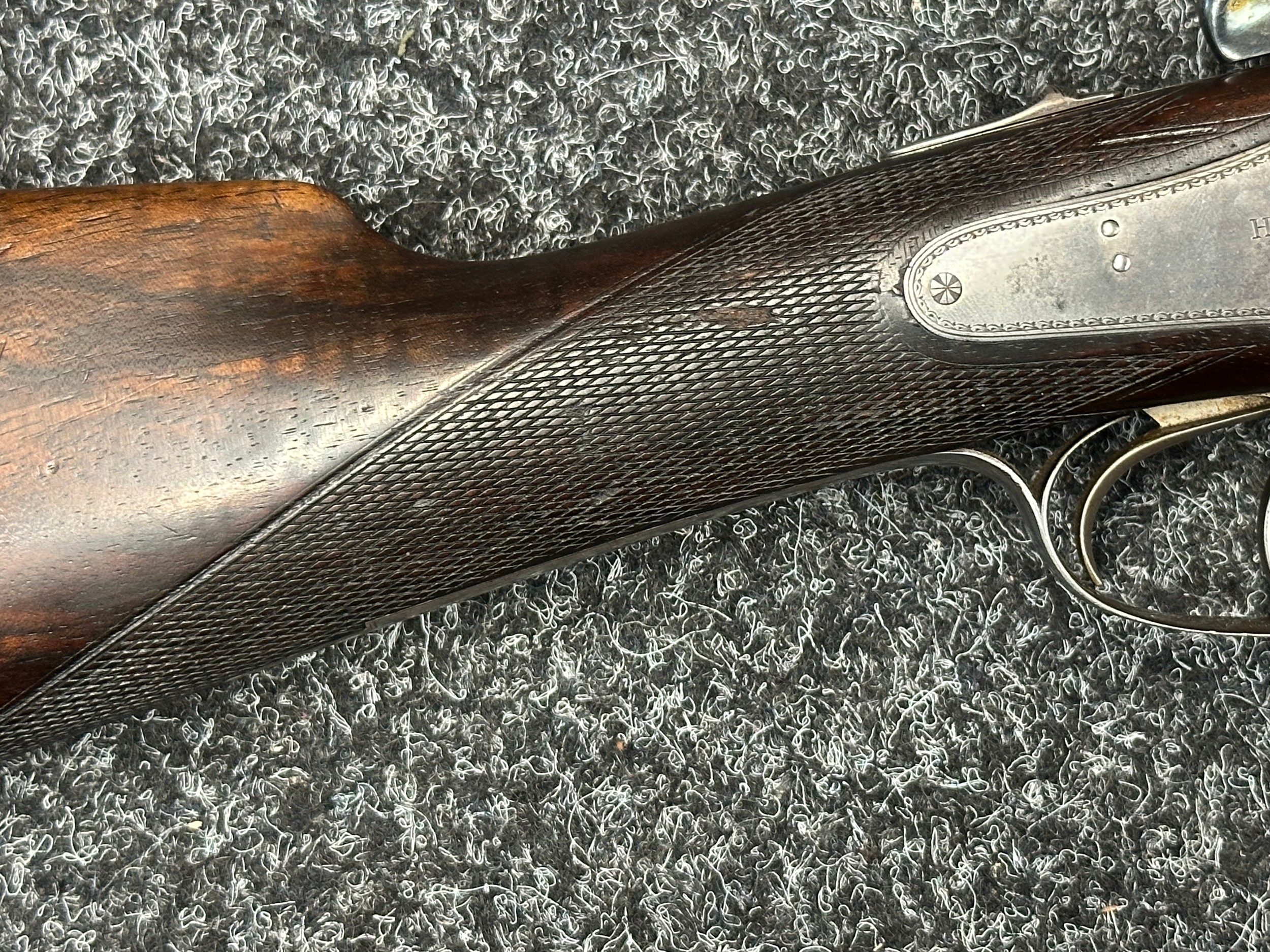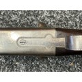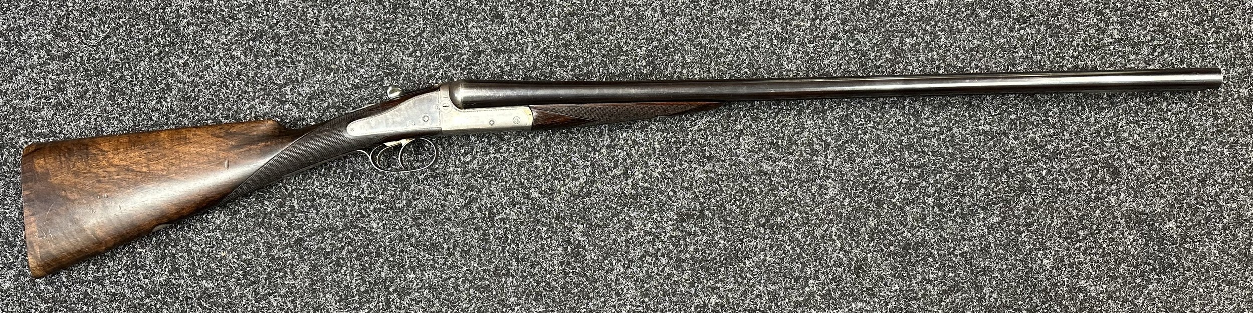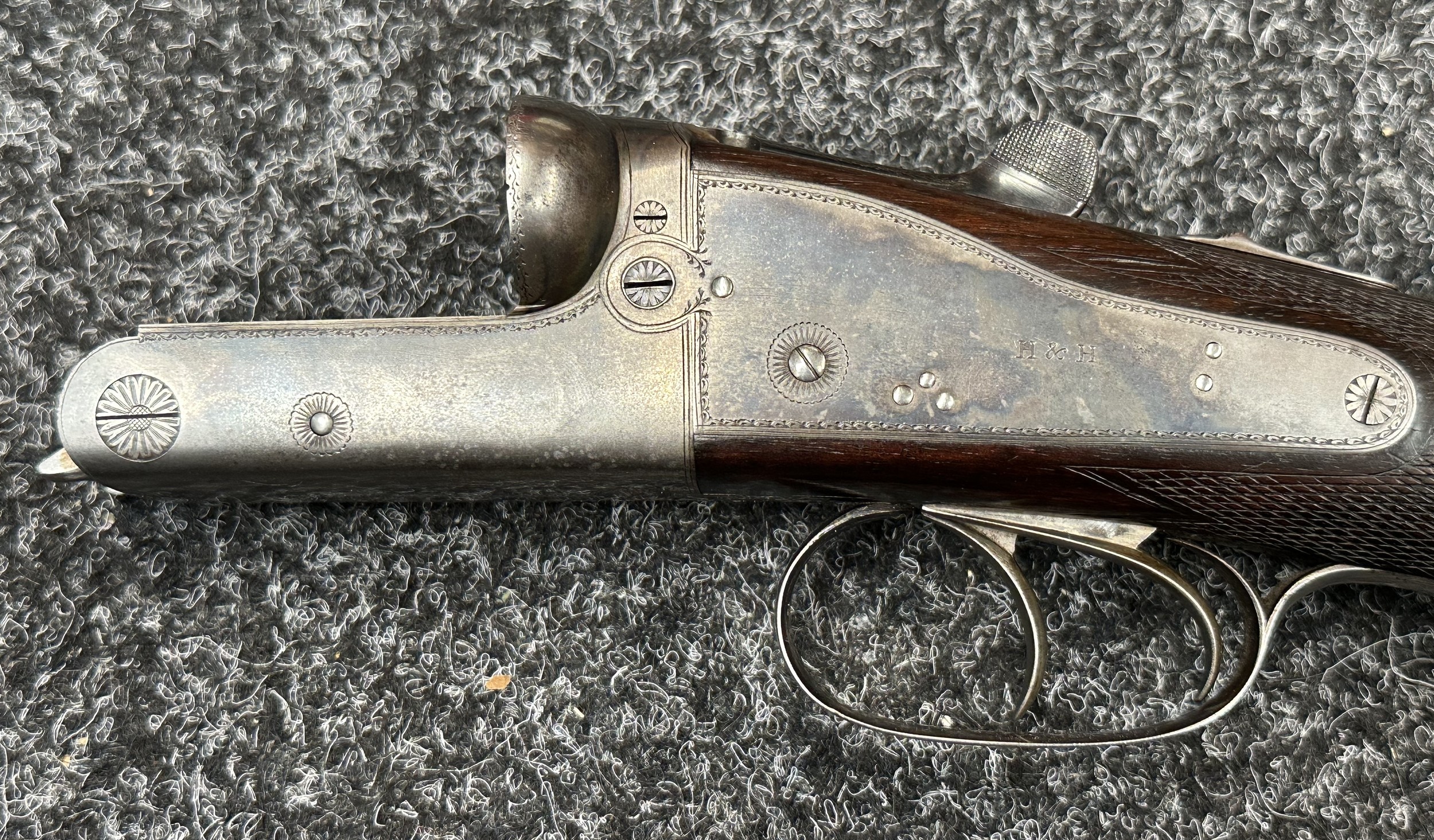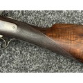 Holland & Holland 12 Bore Double Barrel Shotgun serial number 26409. 715mm long barrels (28 inch x 2 1/2) which are marked "Holland & Holland 98 New Bond Street, London". Top rib is marked "Grade C". Side lock ejector. Chokes Right barrel 1/4 and left barrel 1/2. Locks are both marked "H&H". Retains a good 50% original colour case hardening. Double trigger. Overall length 114.5cm. Stock measures 14 3/8ths of a inch. Complete in leather transit case with Holland & Holland makers lables to lid. Case contains maker marked oil bottle, unmarked wooden cleaning rods, bore brushes, H&H instruction card, etc. Lid to case is impressed with owners initials "HAP". No key to case. NOTE: Buyer must hold a valid Shotgun Certificate or be a Registered Firearms Dealer.