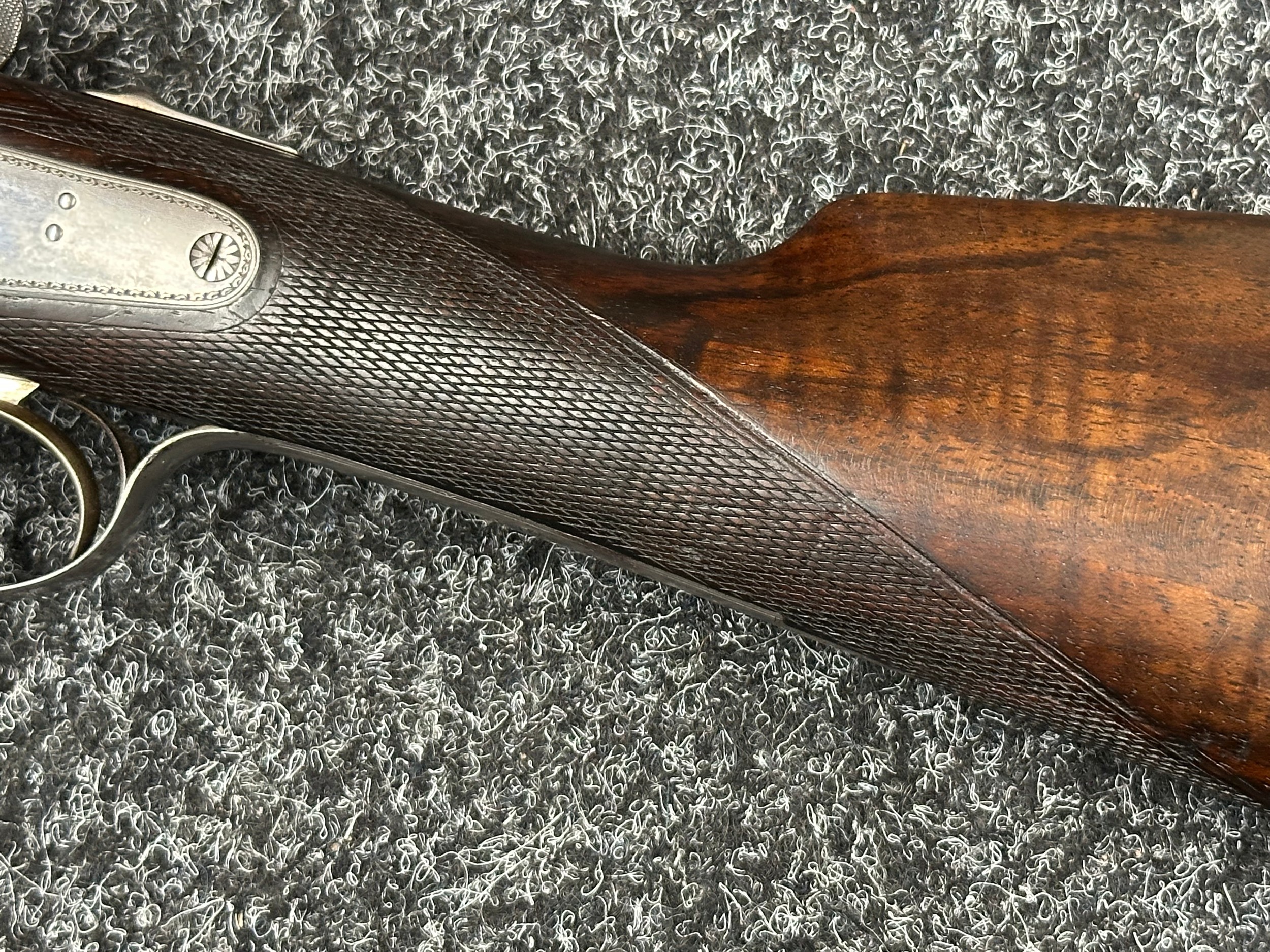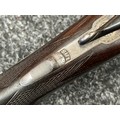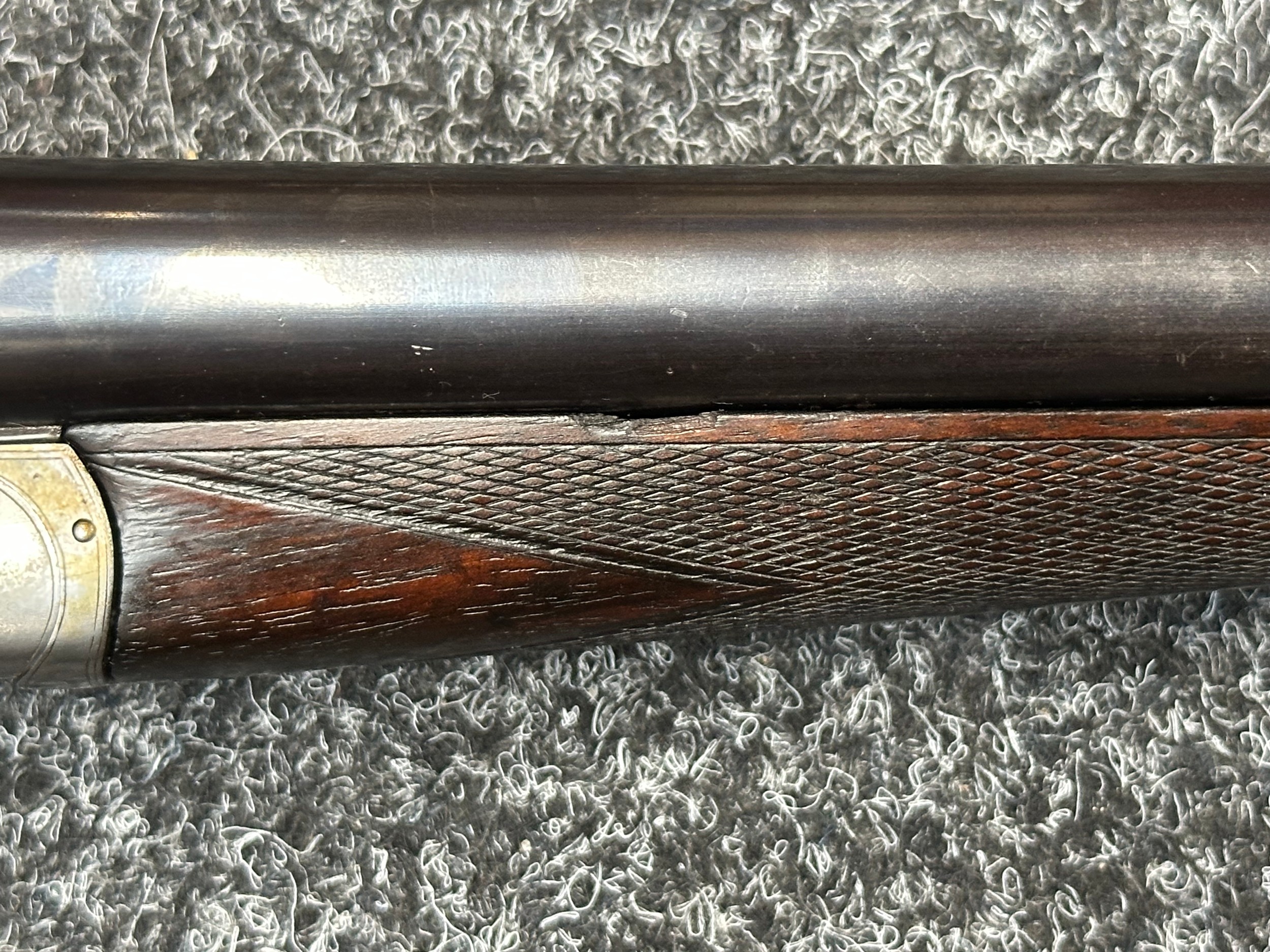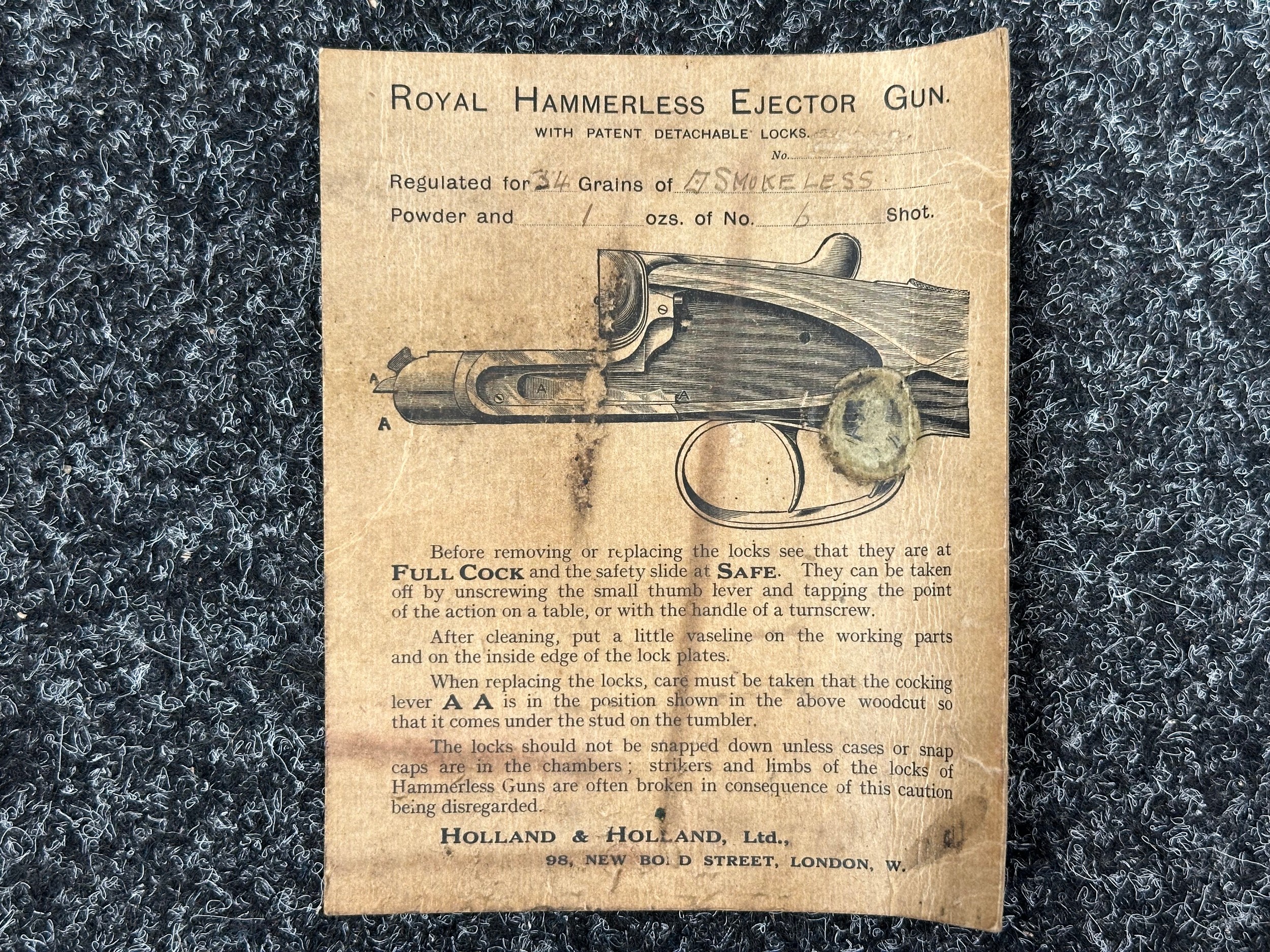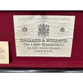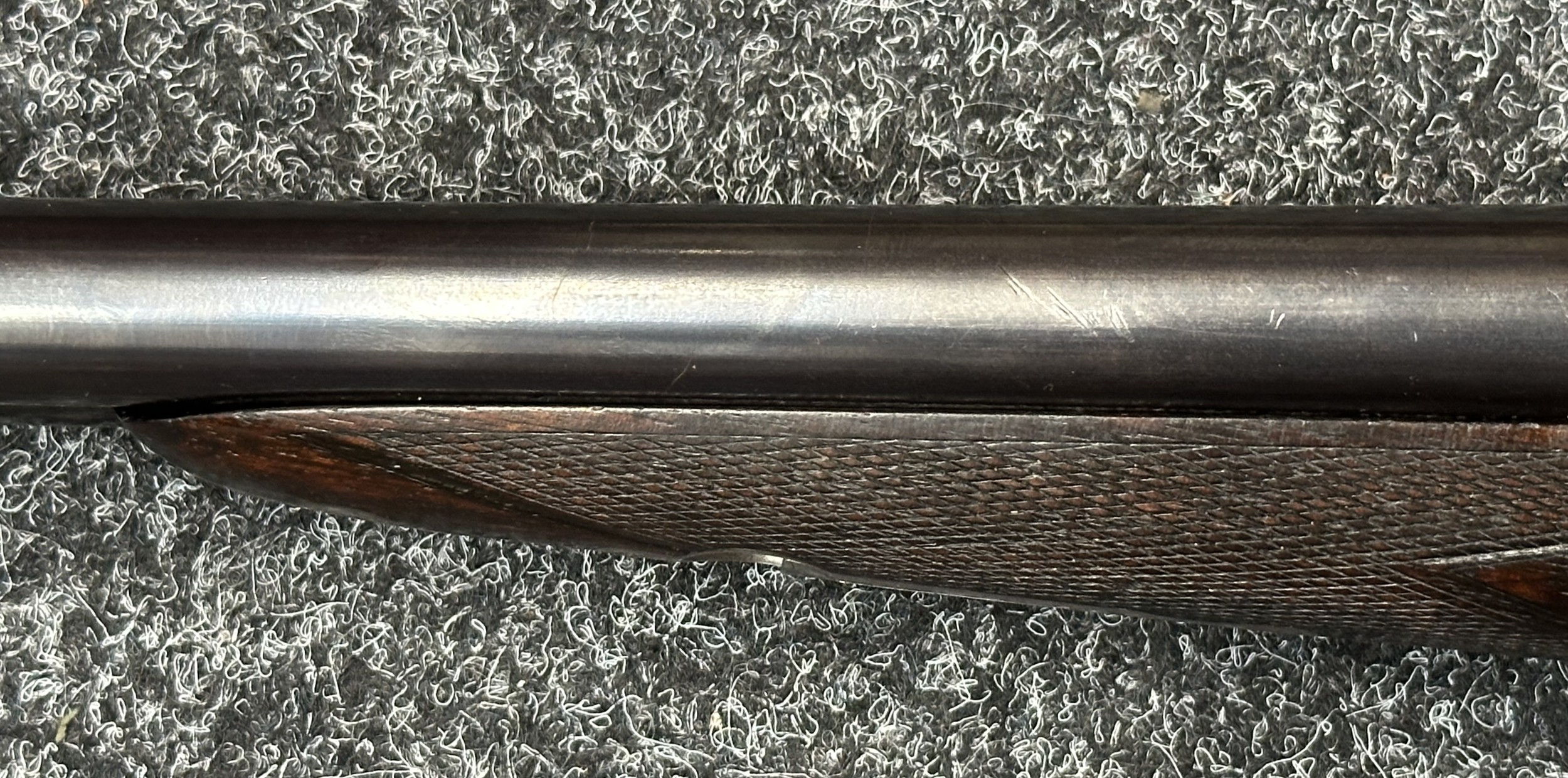 Holland & Holland 12 Bore Double Barrel Shotgun serial number 26409. 715mm long barrels (28 inch x 2 1/2) which are marked "Holland & Holland 98 New Bond Street, London". Top rib is marked "Grade C". Side lock ejector. Chokes Right barrel 1/4 and left barrel 1/2. Locks are both marked "H&H". Retains a good 50% original colour case hardening. Double trigger. Overall length 114.5cm. Stock measures 14 3/8ths of a inch. Complete in leather transit case with Holland & Holland makers lables to lid. Case contains maker marked oil bottle, unmarked wooden cleaning rods, bore brushes, H&H instruction card, etc. Lid to case is impressed with owners initials "HAP". No key to case. NOTE: Buyer must hold a valid Shotgun Certificate or be a Registered Firearms Dealer.