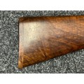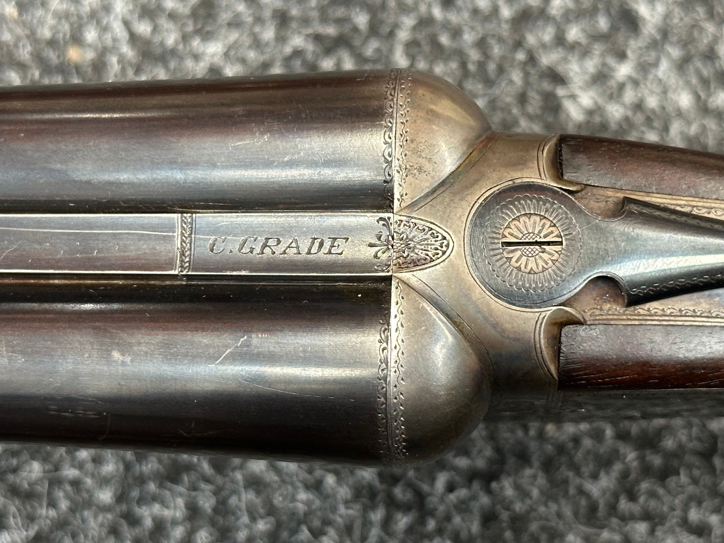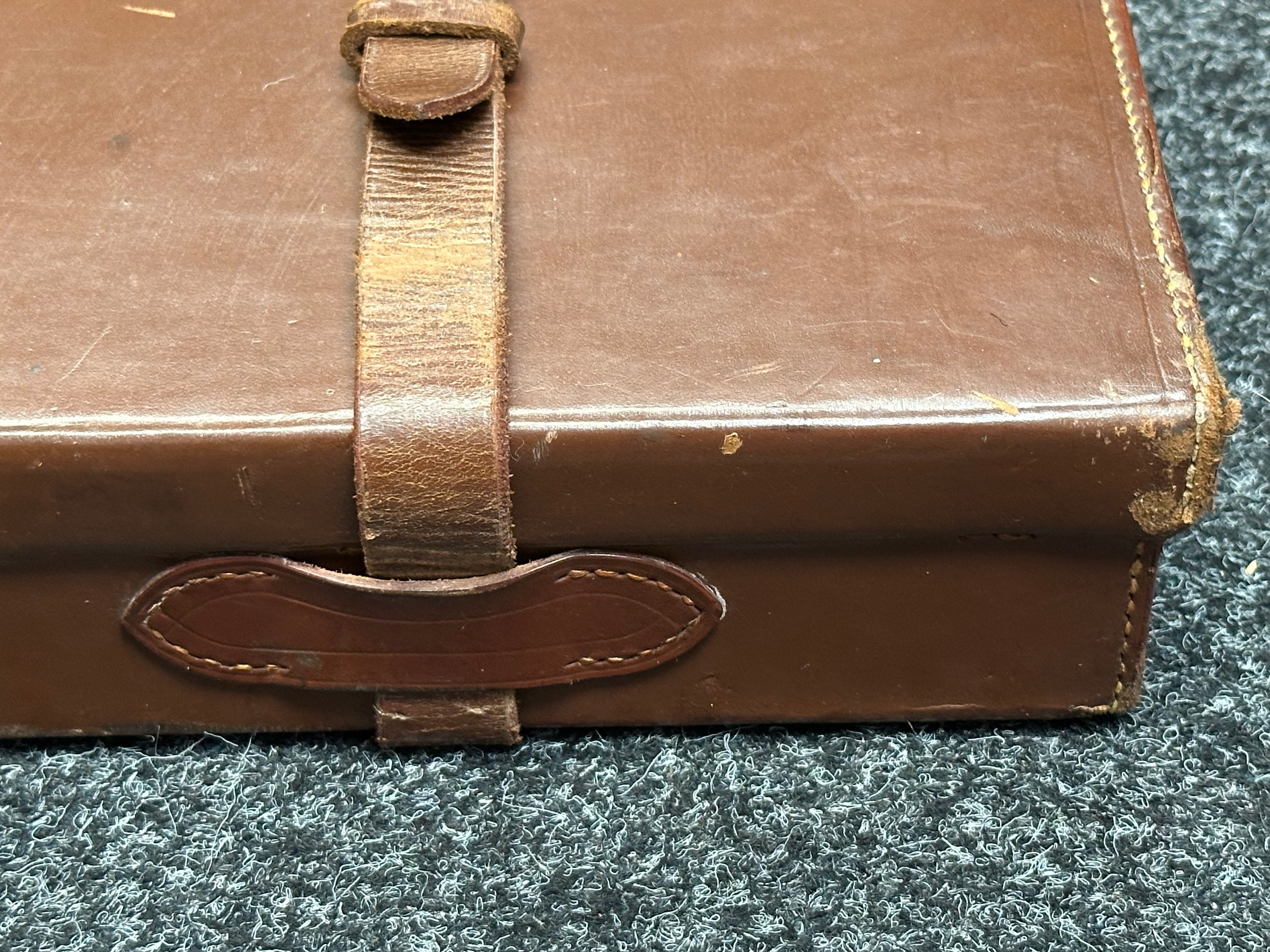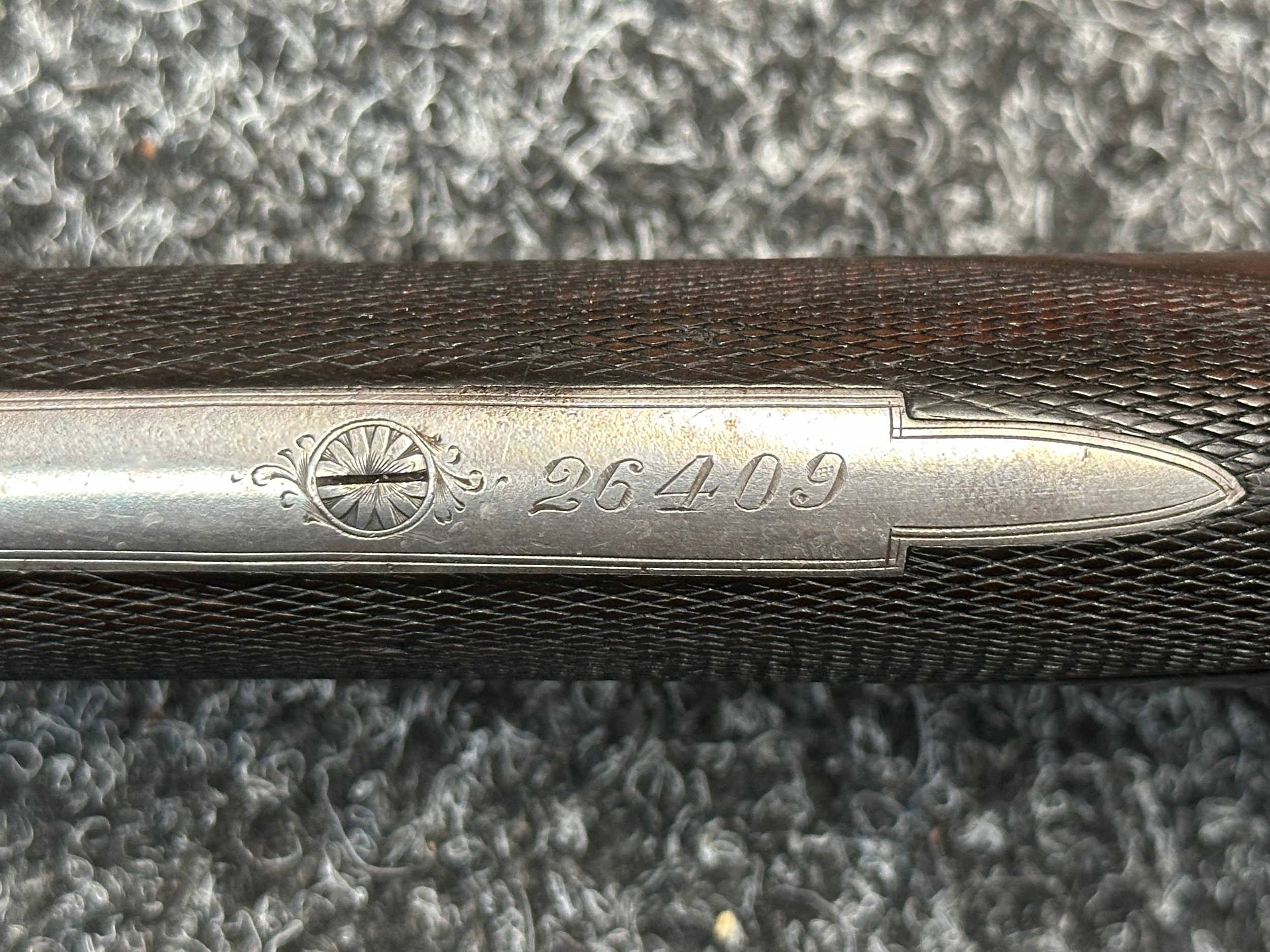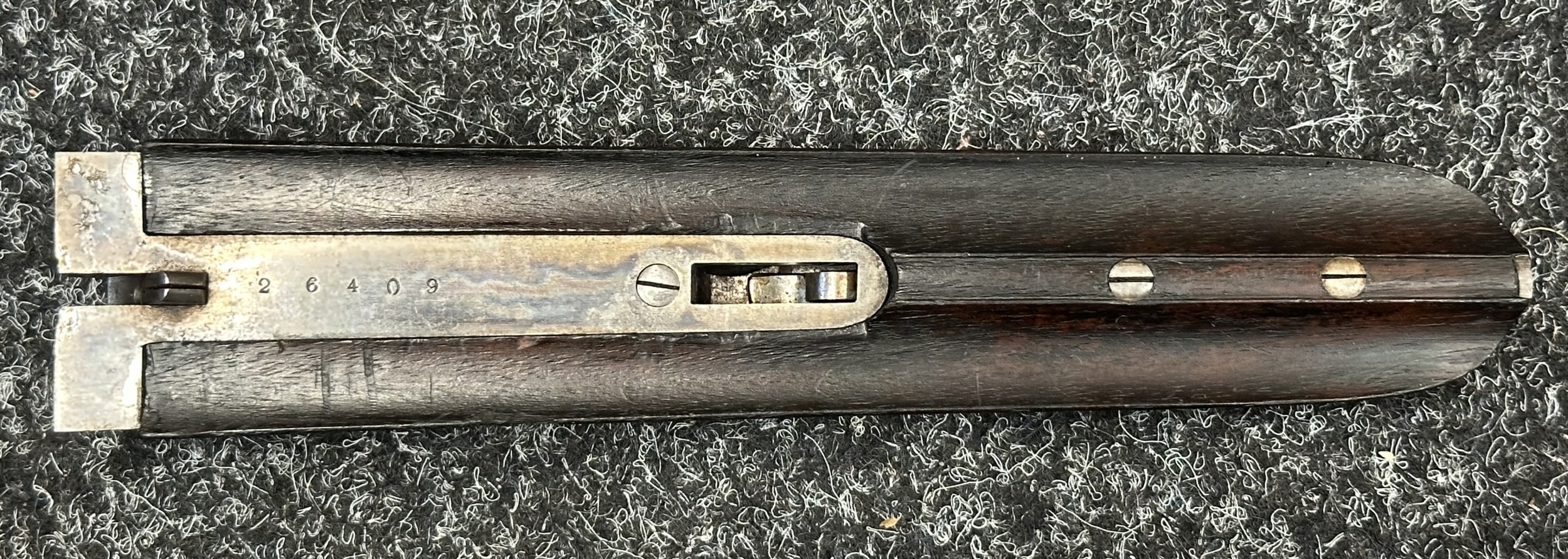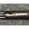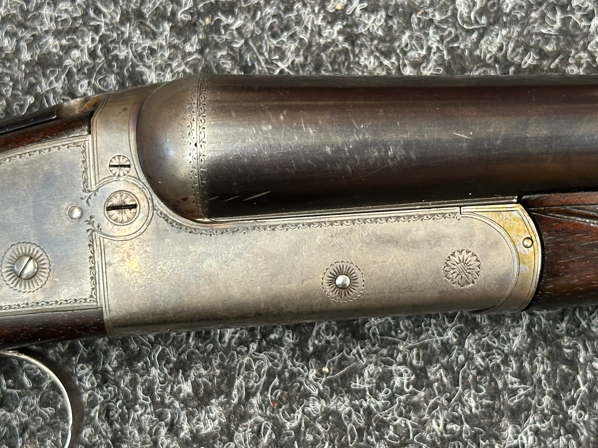 Holland & Holland 12 Bore Double Barrel Shotgun serial number 26409. 715mm long barrels (28 inch x 2 1/2) which are marked "Holland & Holland 98 New Bond Street, London". Top rib is marked "Grade C". Side lock ejector. Chokes Right barrel 1/4 and left barrel 1/2. Locks are both marked "H&H". Retains a good 50% original colour case hardening. Double trigger. Overall length 114.5cm. Stock measures 14 3/8ths of a inch. Complete in leather transit case with Holland & Holland makers lables to lid. Case contains maker marked oil bottle, unmarked wooden cleaning rods, bore brushes, H&H instruction card, etc. Lid to case is impressed with owners initials "HAP". No key to case. NOTE: Buyer must hold a valid Shotgun Certificate or be a Registered Firearms Dealer.