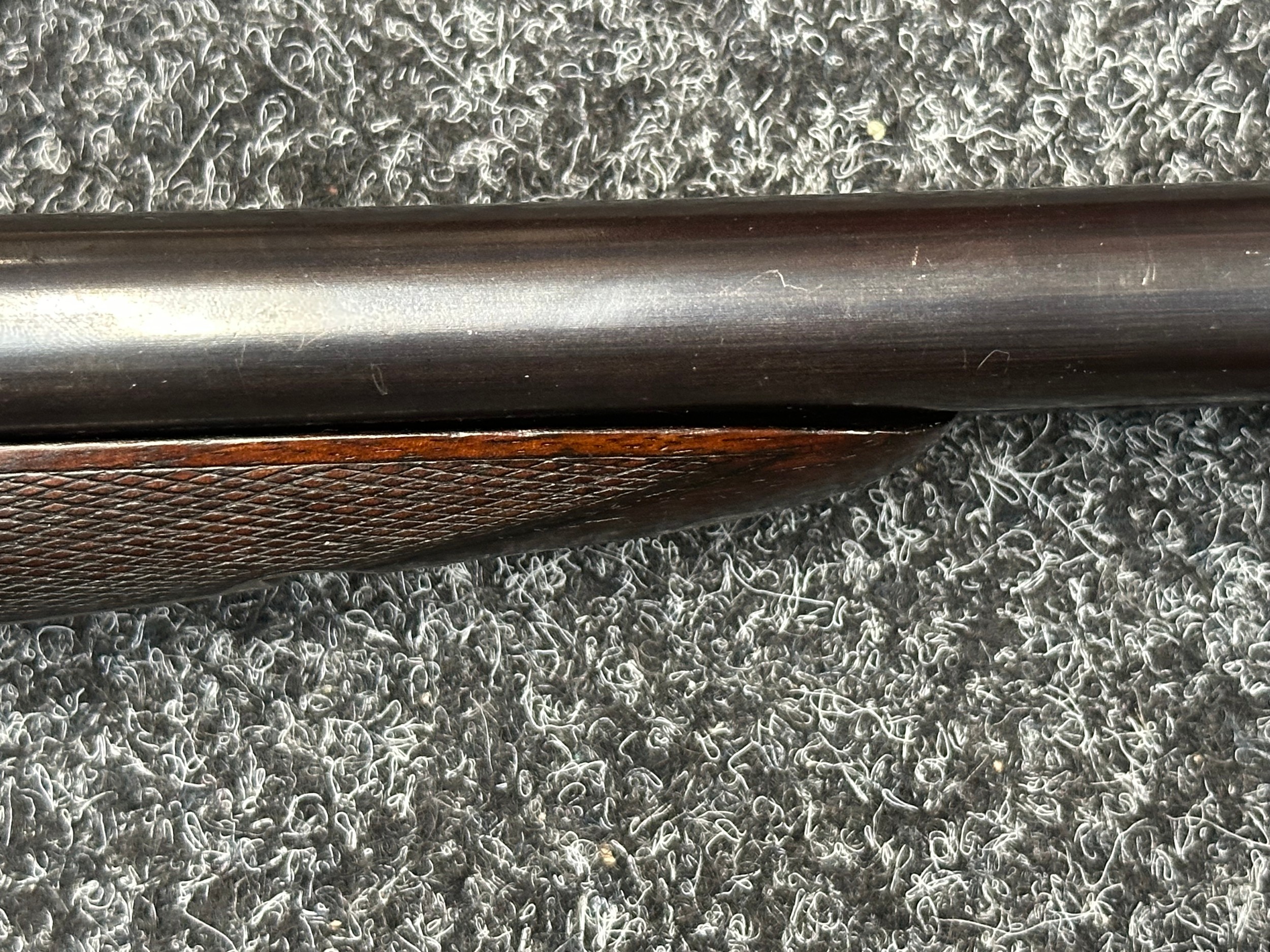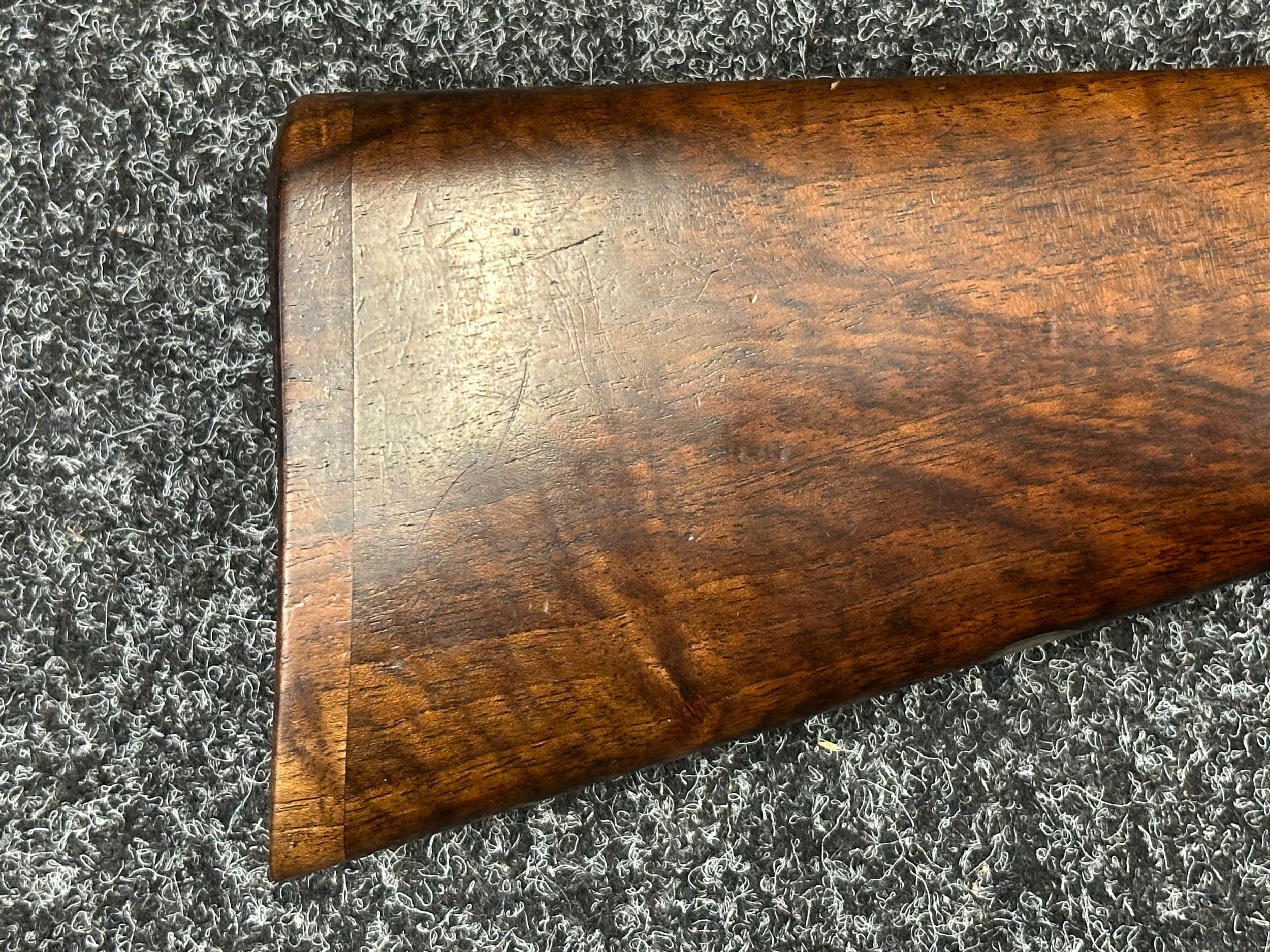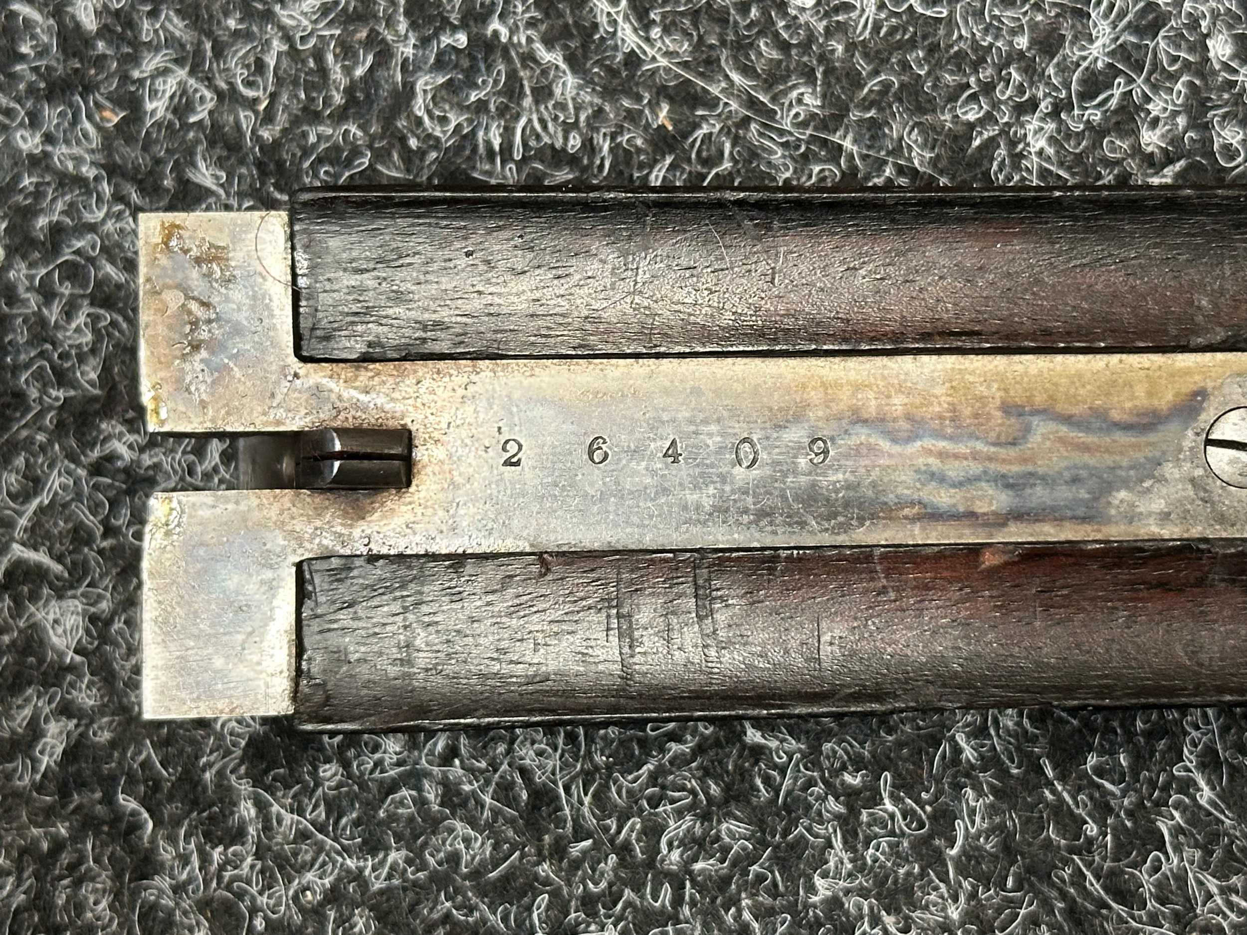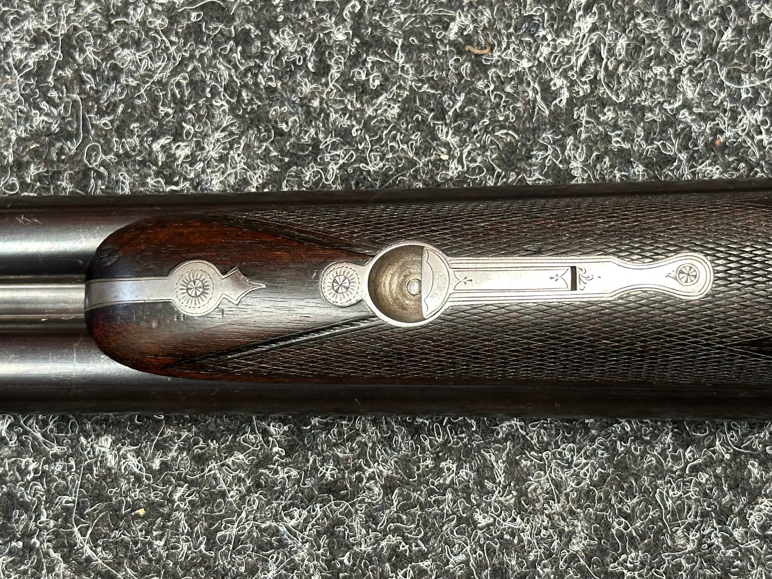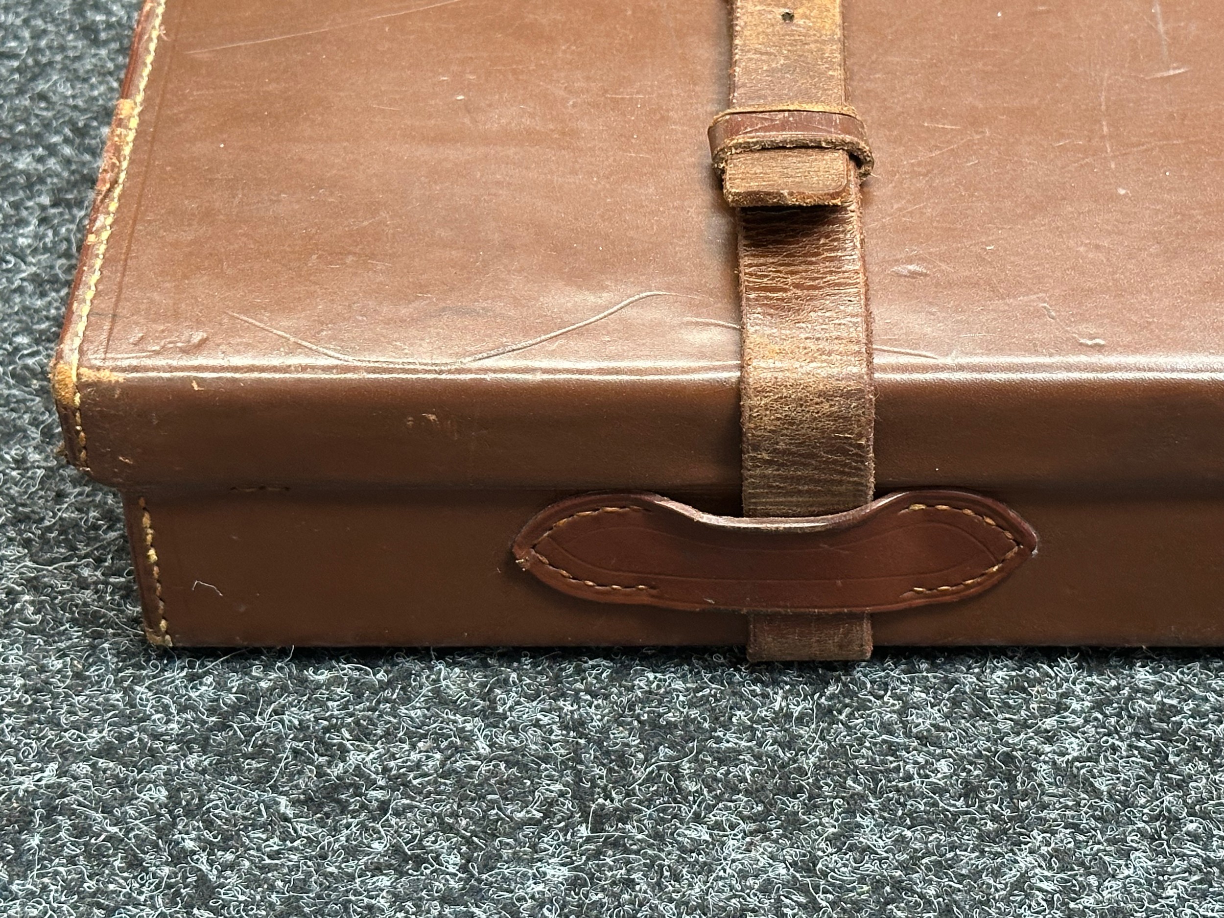 Holland & Holland 12 Bore Double Barrel Shotgun serial number 26409. 715mm long barrels (28 inch x 2 1/2) which are marked "Holland & Holland 98 New Bond Street, London". Top rib is marked "Grade C". Side lock ejector. Chokes Right barrel 1/4 and left barrel 1/2. Locks are both marked "H&H". Retains a good 50% original colour case hardening. Double trigger. Overall length 114.5cm. Stock measures 14 3/8ths of a inch. Complete in leather transit case with Holland & Holland makers lables to lid. Case contains maker marked oil bottle, unmarked wooden cleaning rods, bore brushes, H&H instruction card, etc. Lid to case is impressed with owners initials "HAP". No key to case. NOTE: Buyer must hold a valid Shotgun Certificate or be a Registered Firearms Dealer.