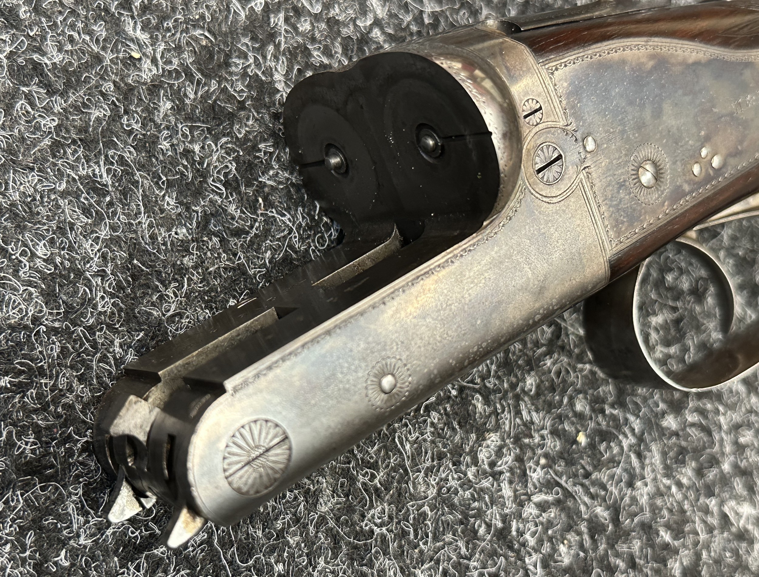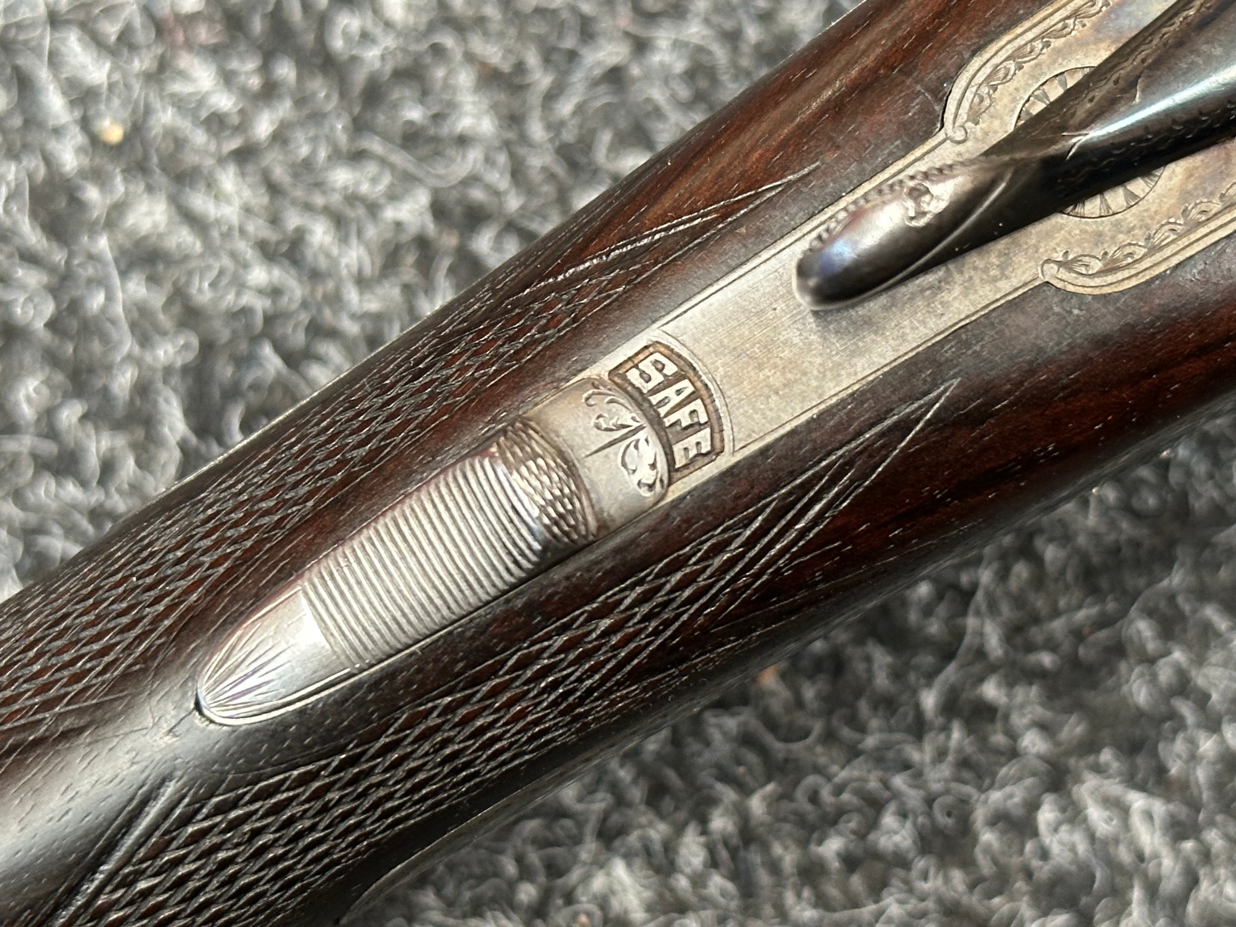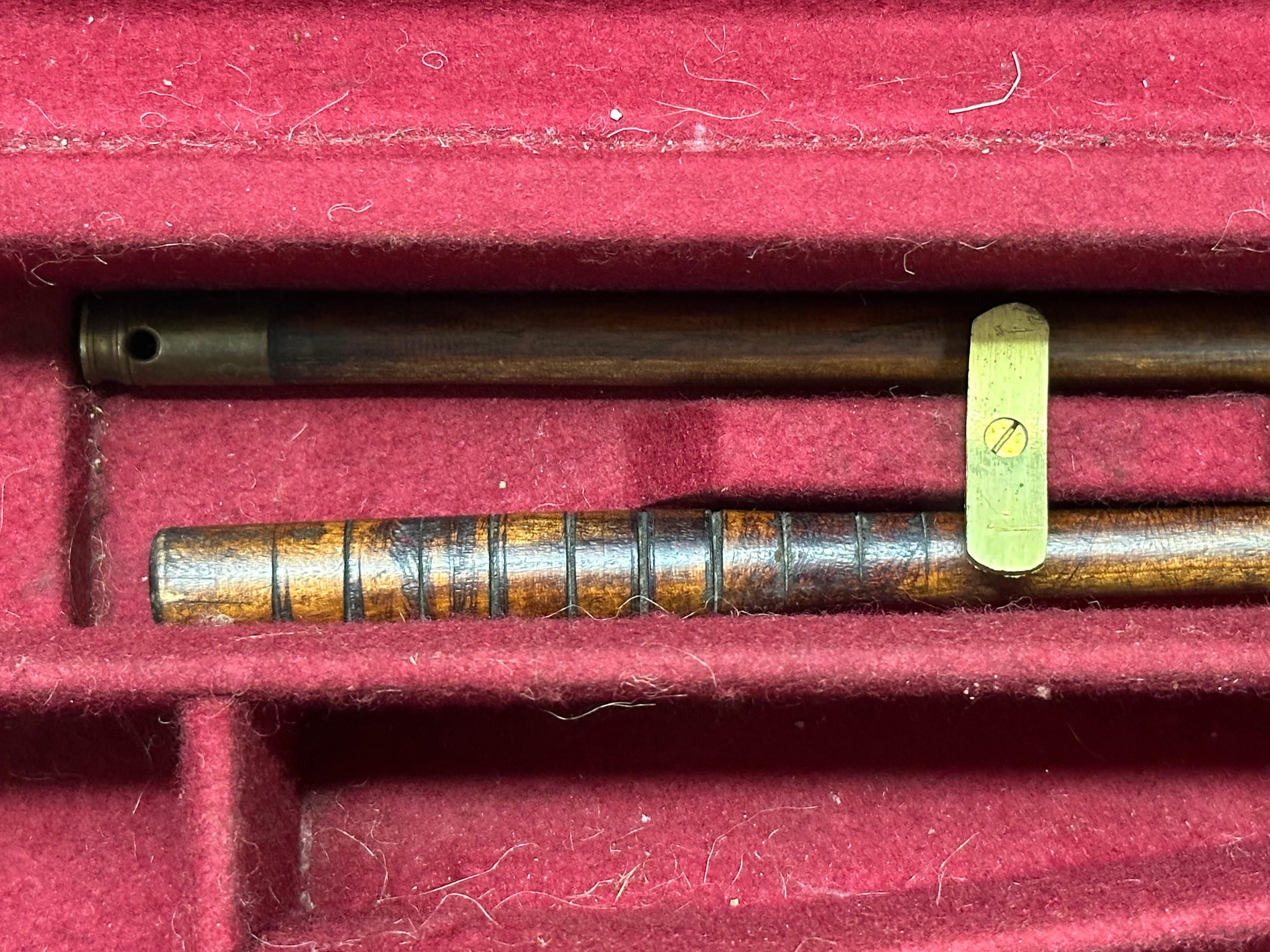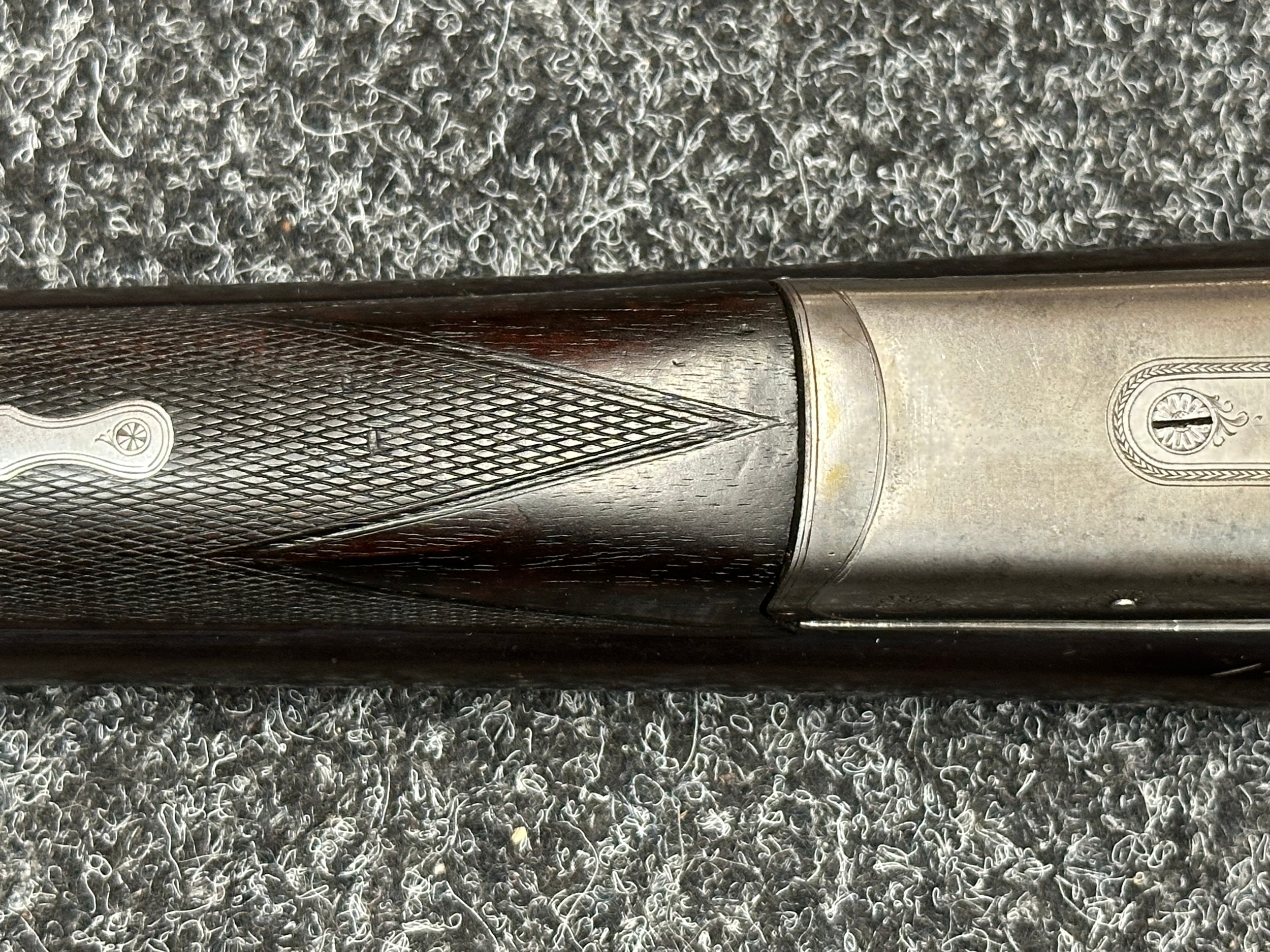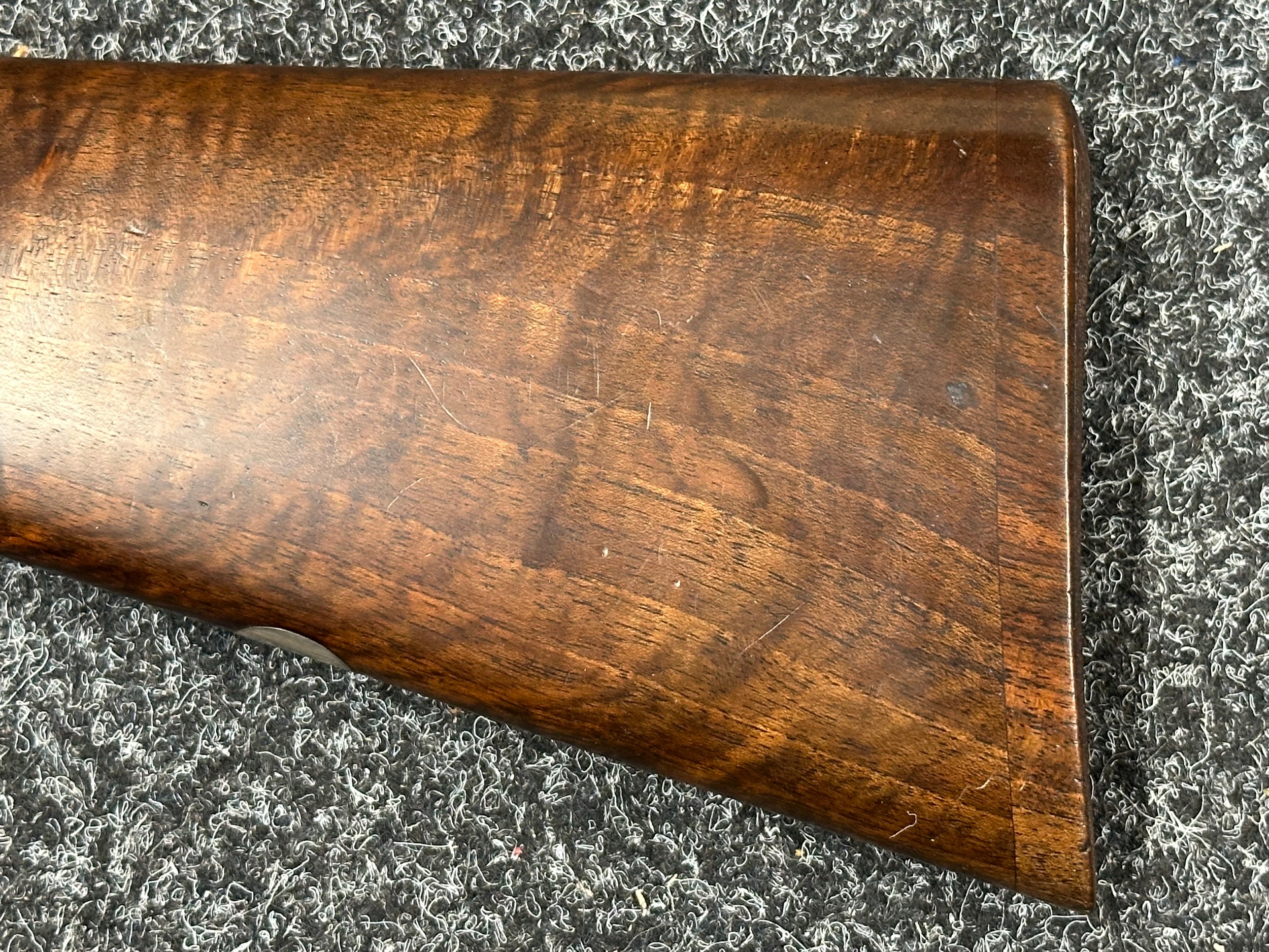 Holland & Holland 12 Bore Double Barrel Shotgun serial number 26409. 715mm long barrels (28 inch x 2 1/2) which are marked "Holland & Holland 98 New Bond Street, London". Top rib is marked "Grade C". Side lock ejector. Chokes Right barrel 1/4 and left barrel 1/2. Locks are both marked "H&H". Retains a good 50% original colour case hardening. Double trigger. Overall length 114.5cm. Stock measures 14 3/8ths of a inch. Complete in leather transit case with Holland & Holland makers lables to lid. Case contains maker marked oil bottle, unmarked wooden cleaning rods, bore brushes, H&H instruction card, etc. Lid to case is impressed with owners initials "HAP". No key to case. NOTE: Buyer must hold a valid Shotgun Certificate or be a Registered Firearms Dealer.