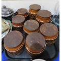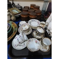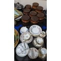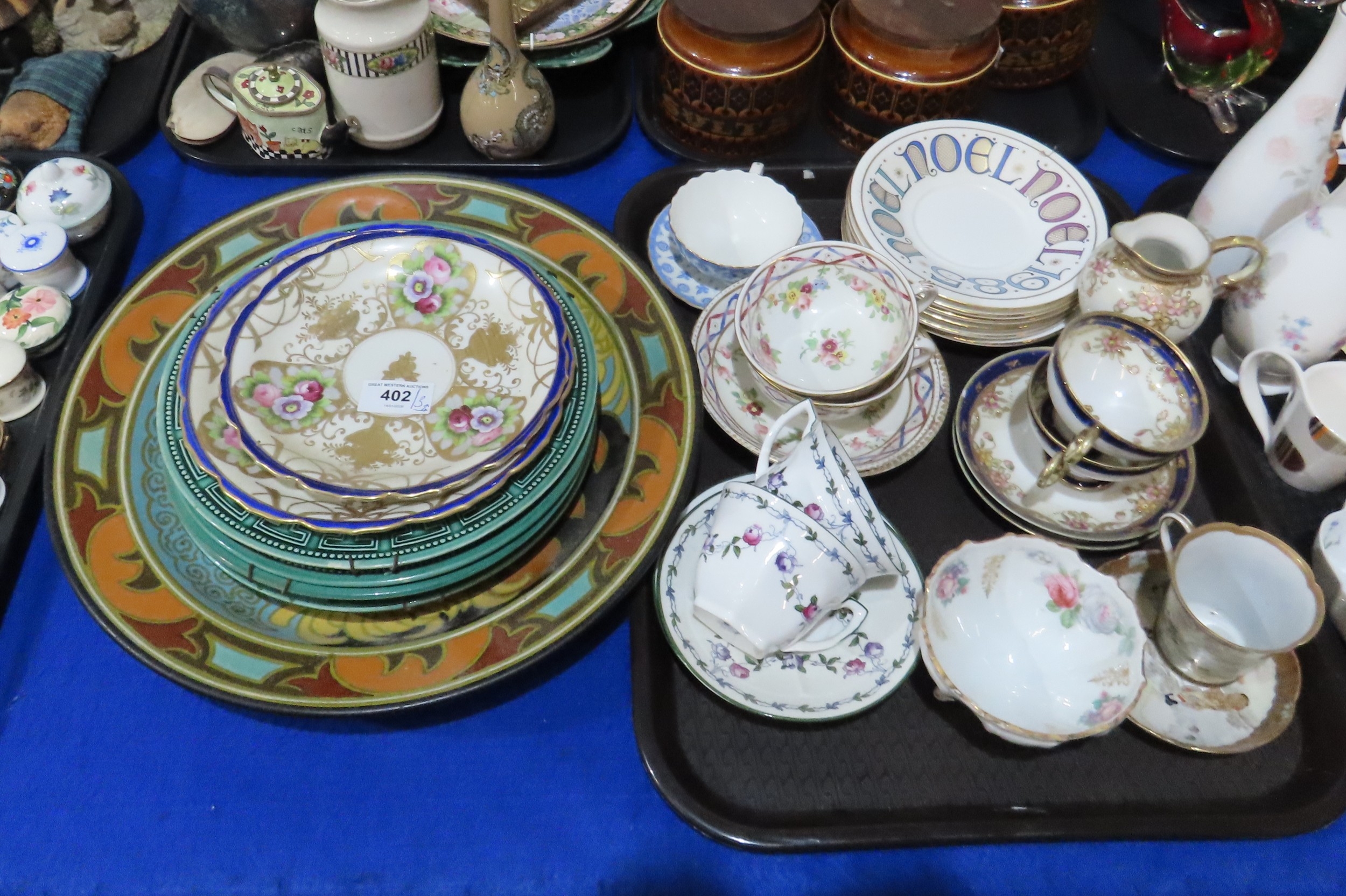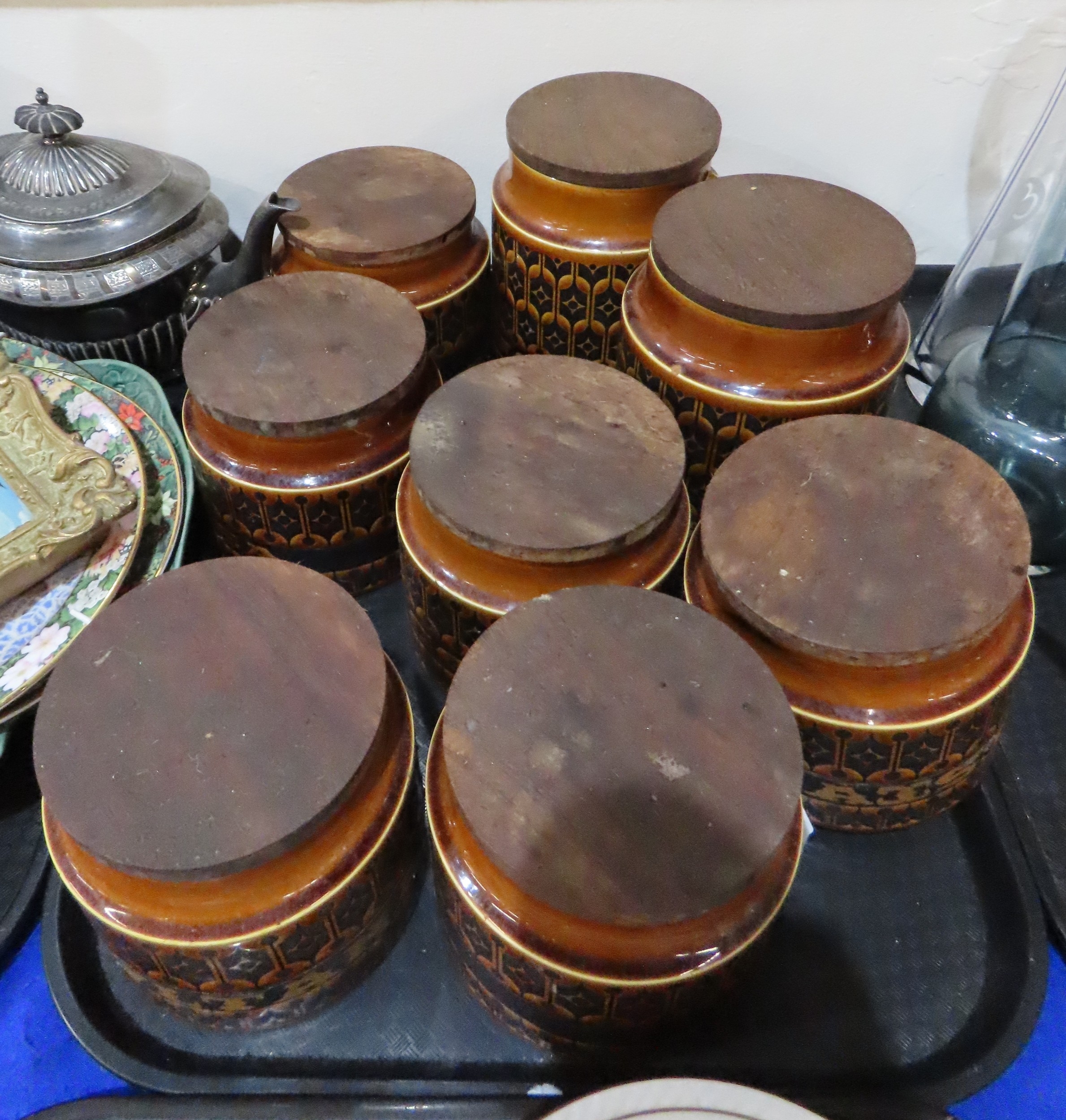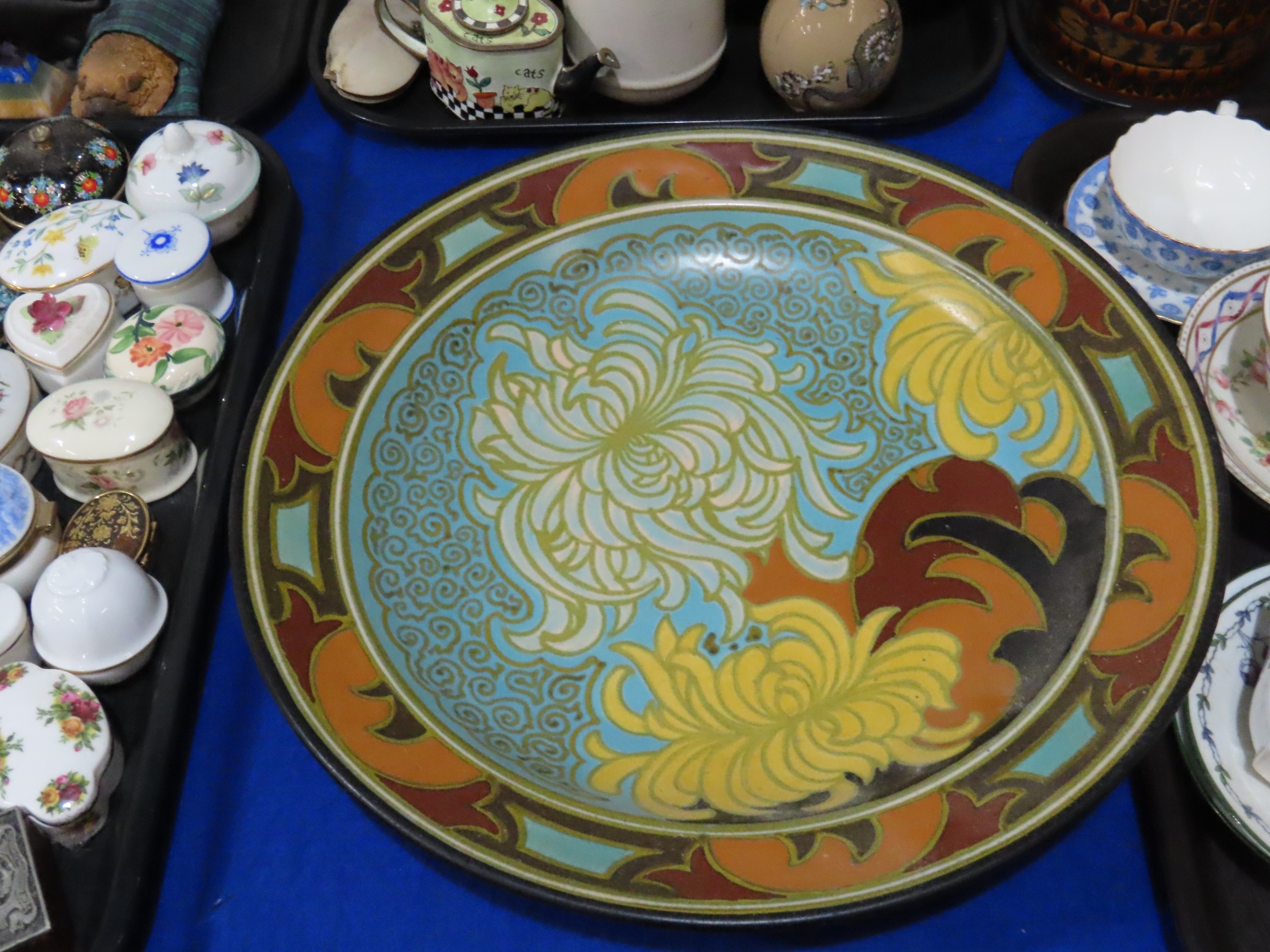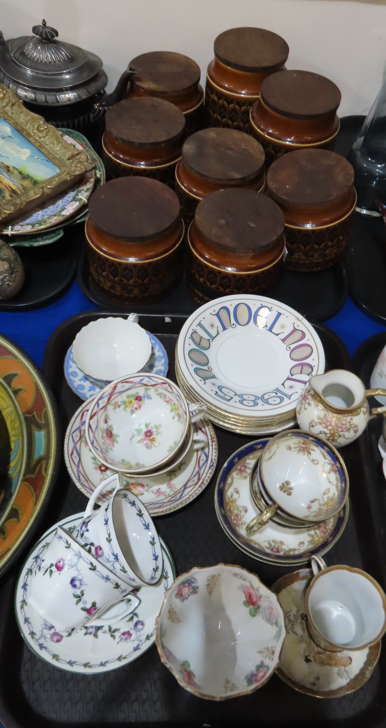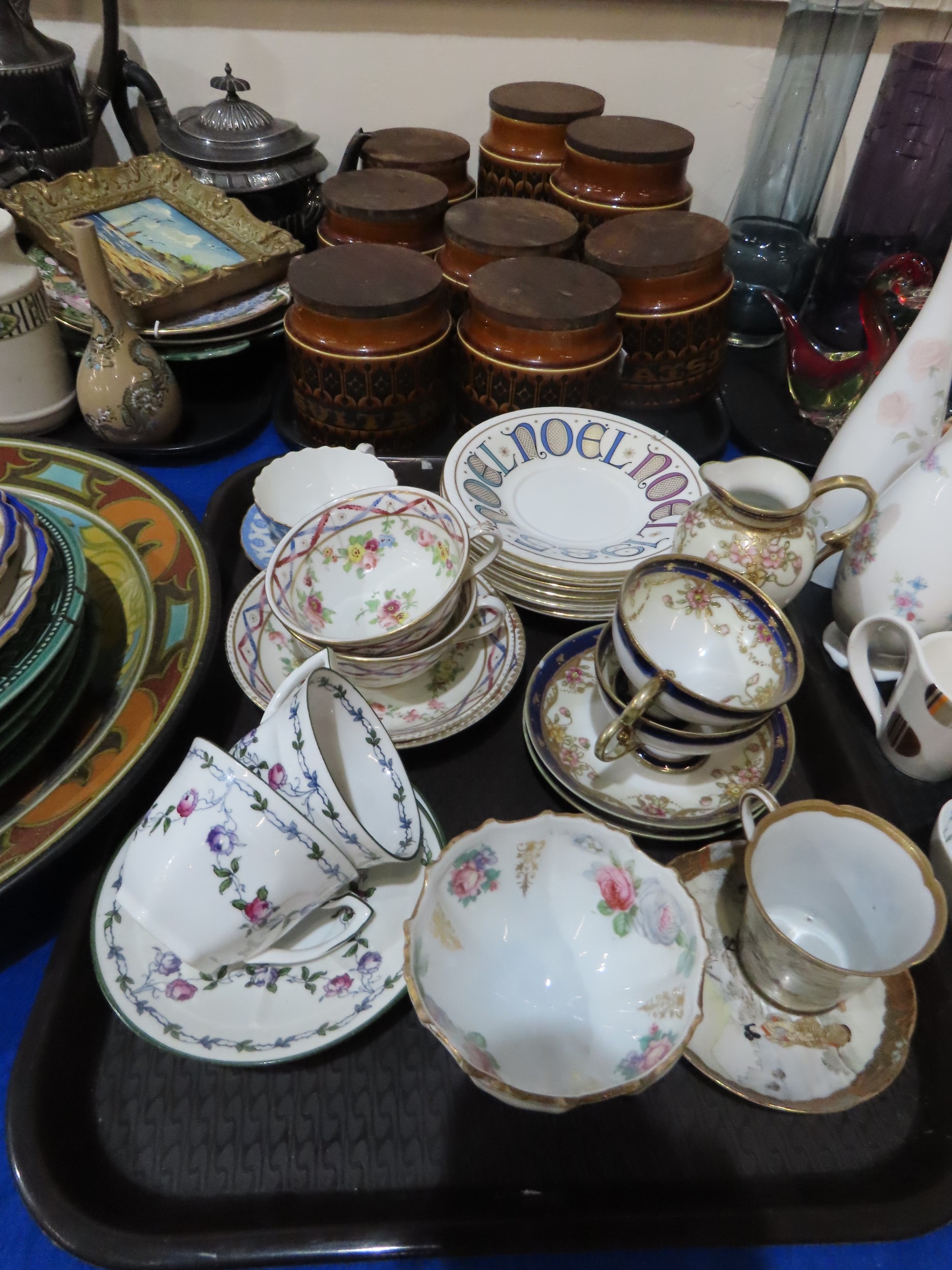 A large Gouda plate decorated with chrysanthemums, Hornsea storage jars, assorted tea wares and plates