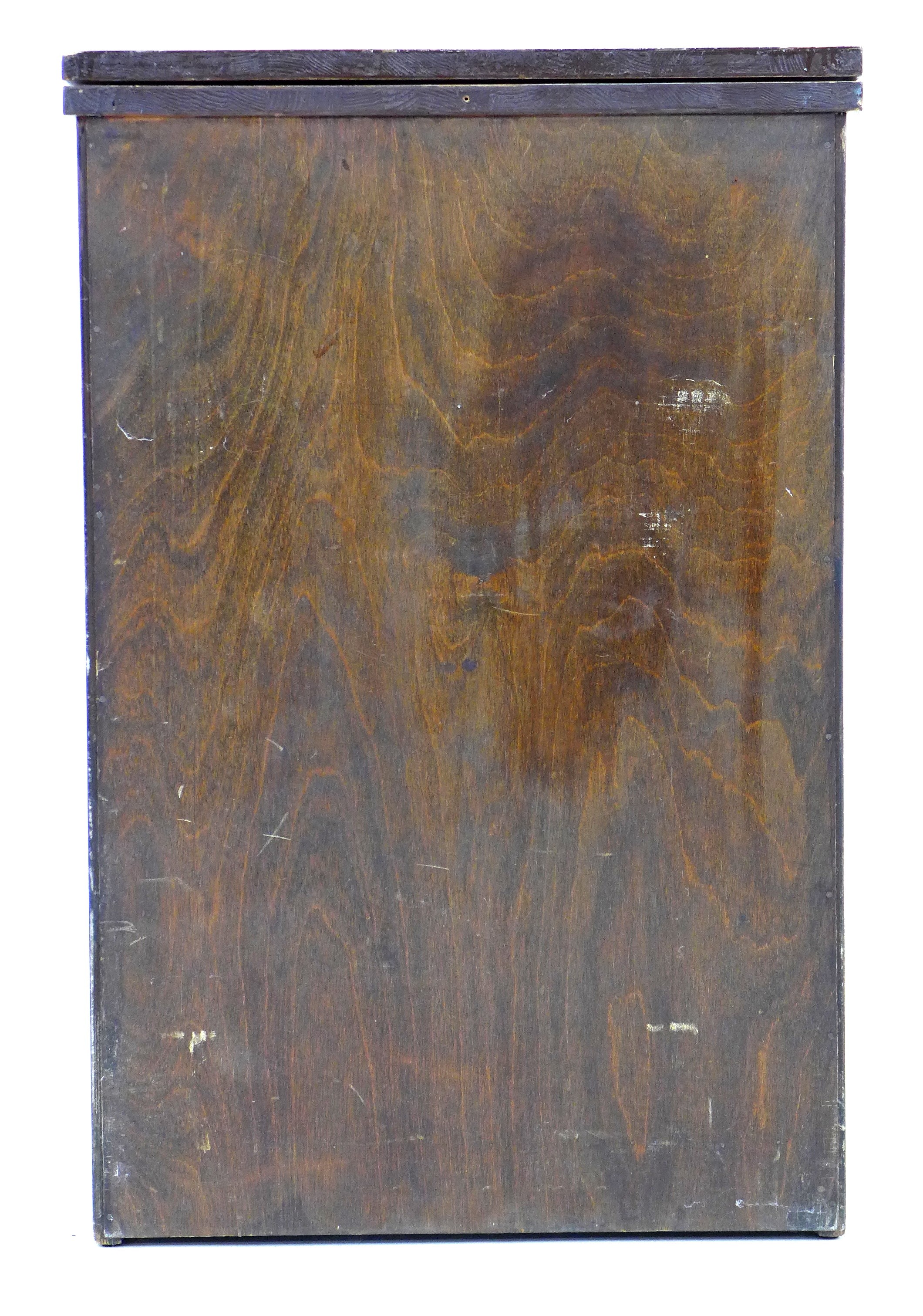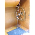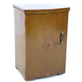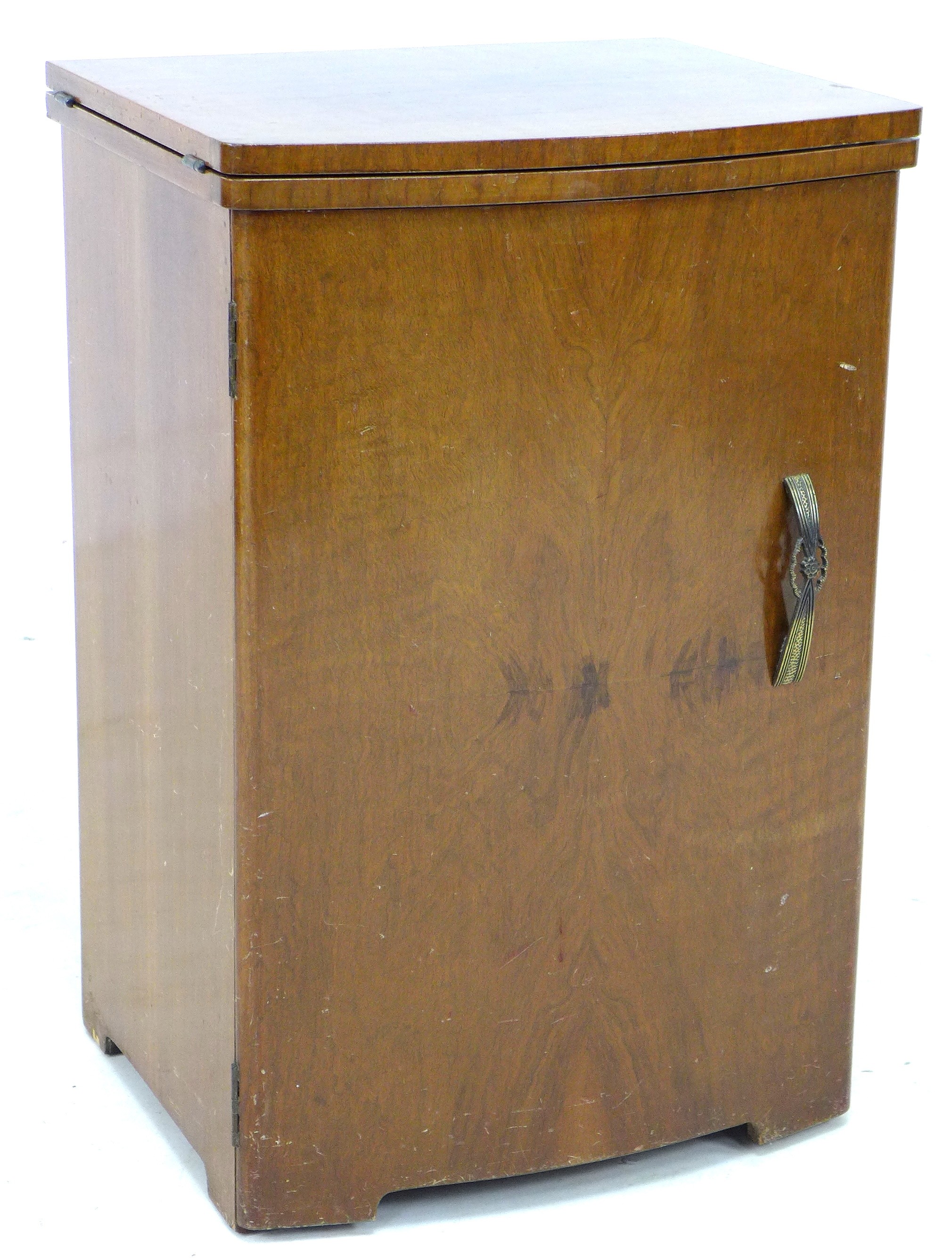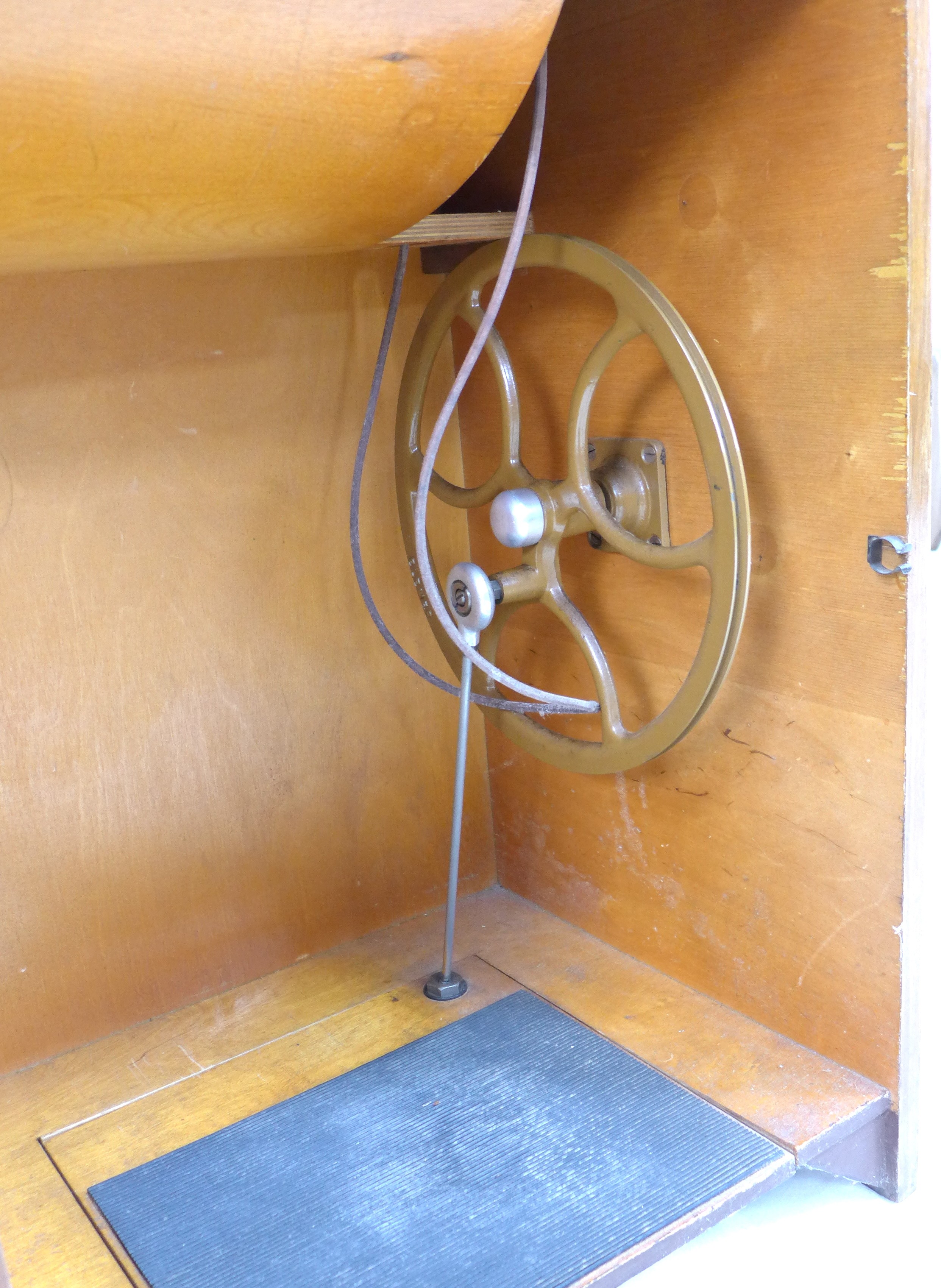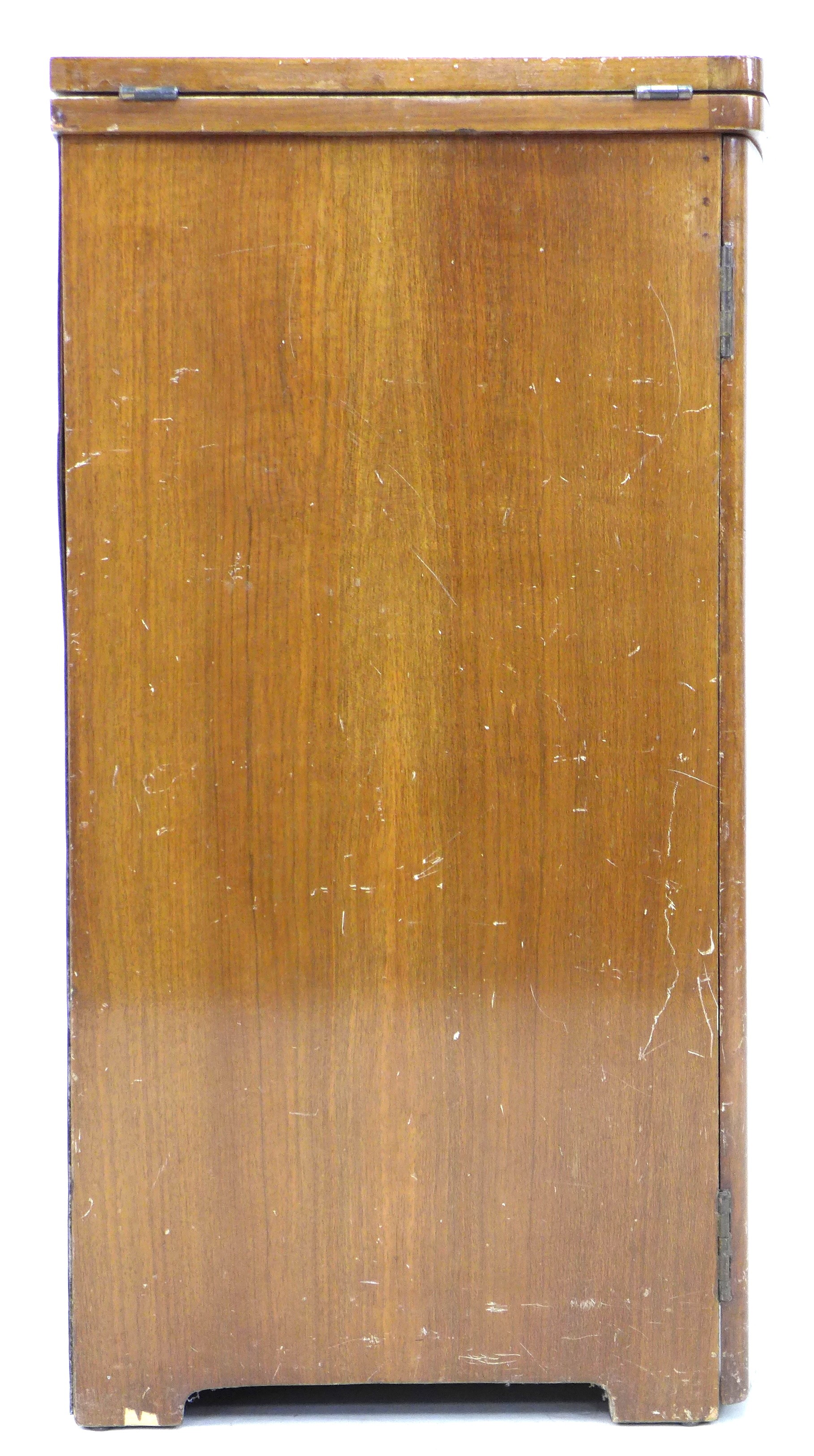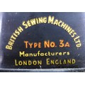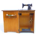 A vintage BSM (British Sewing Machines Ltd) treadle powered Type 3a sewing machine, housed within a walnut veneered cupboard, 54 by 46 by 81cm high.