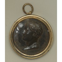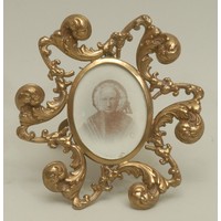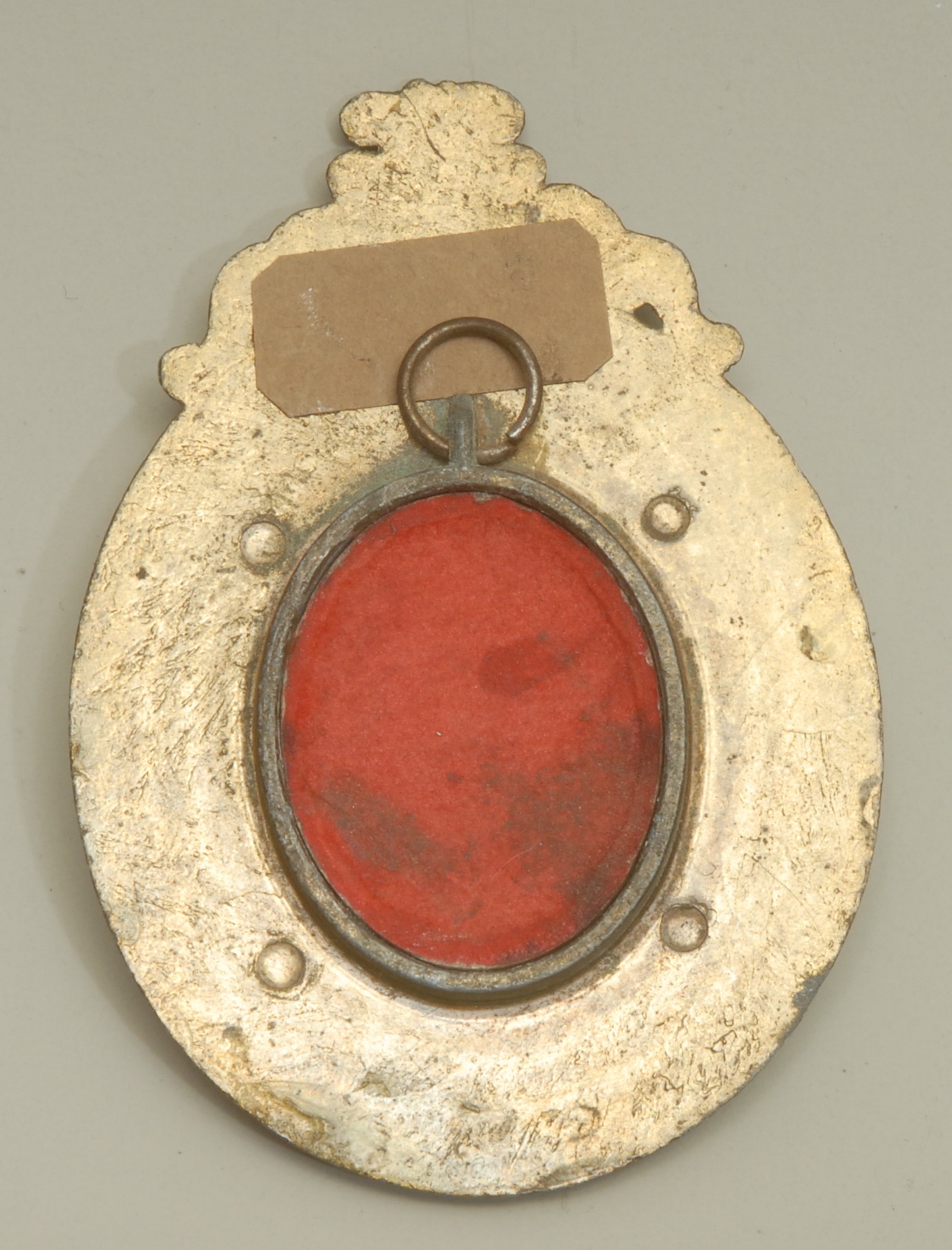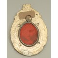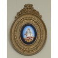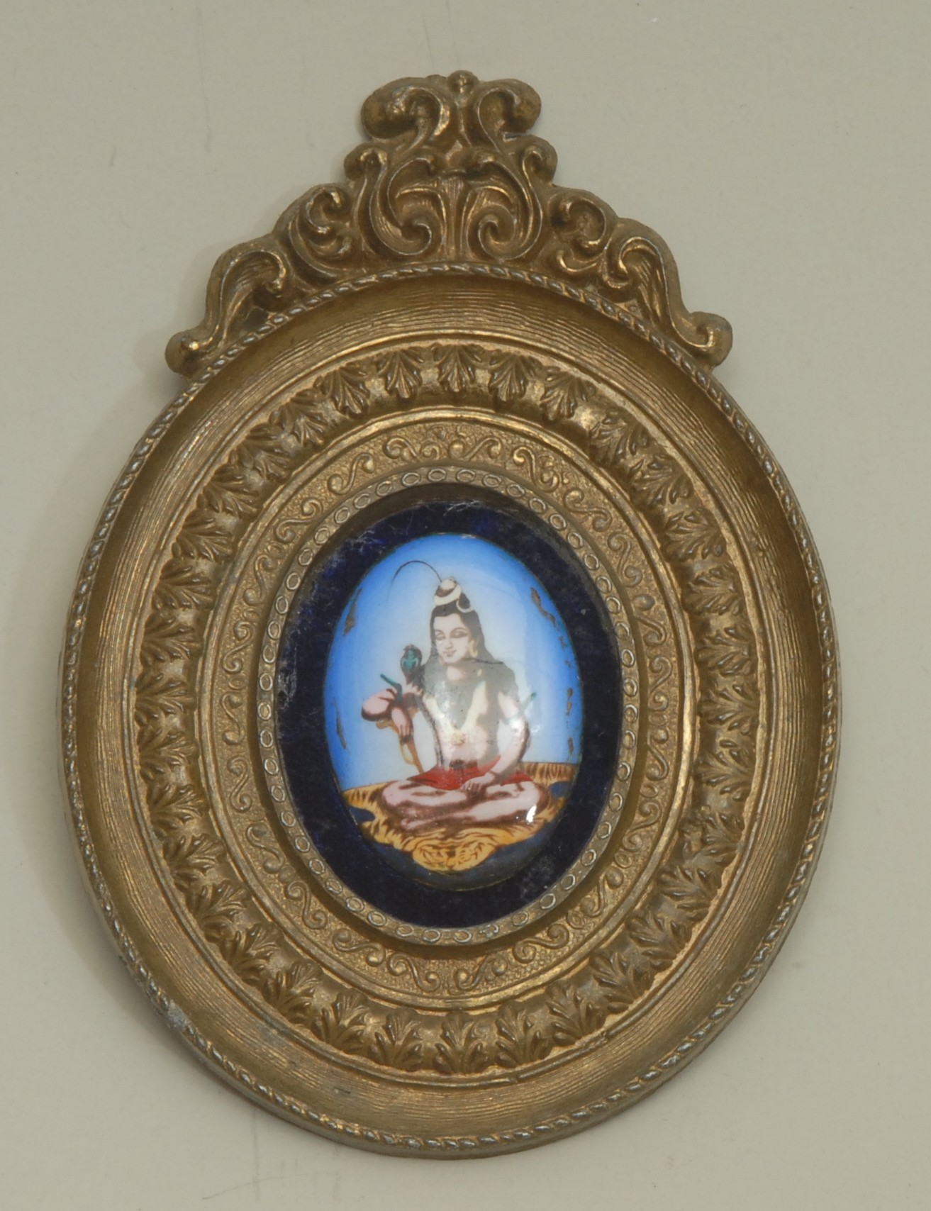 An Indian enamel plaque, decorated in polychrome with a female deity, the brass frame chased with lotus, 10cm long overall