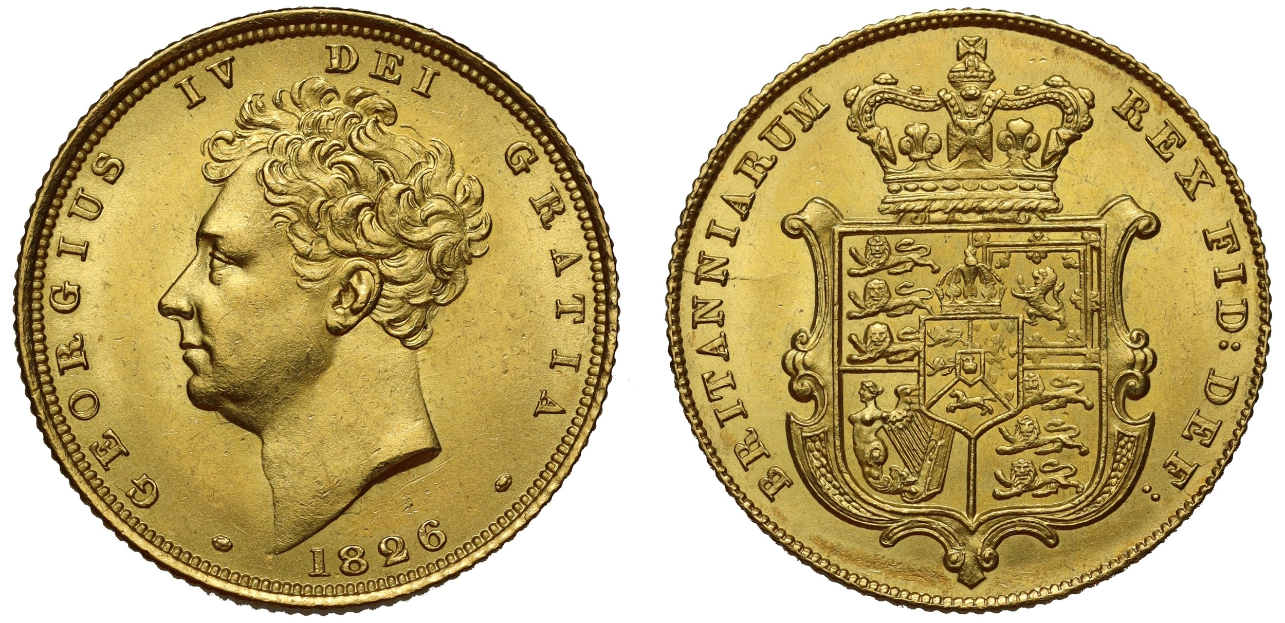 g George IV (1820-30), gold Sovereign, 1826, second bare head left, date below, Latin legend and toothed border surrounding, GEORGIUS IV DEI GRATIA, rev. crowned quartered shield of arms, BRITANNIARUM REX FID: DEF: (Bentley 19; Hill 11; Bull EGC 968; M.C.E. 477; S.3801). Toned with some light surface marks, graded by NGC as MS64, only 3x finer graded examples across both NGC and PCGS.