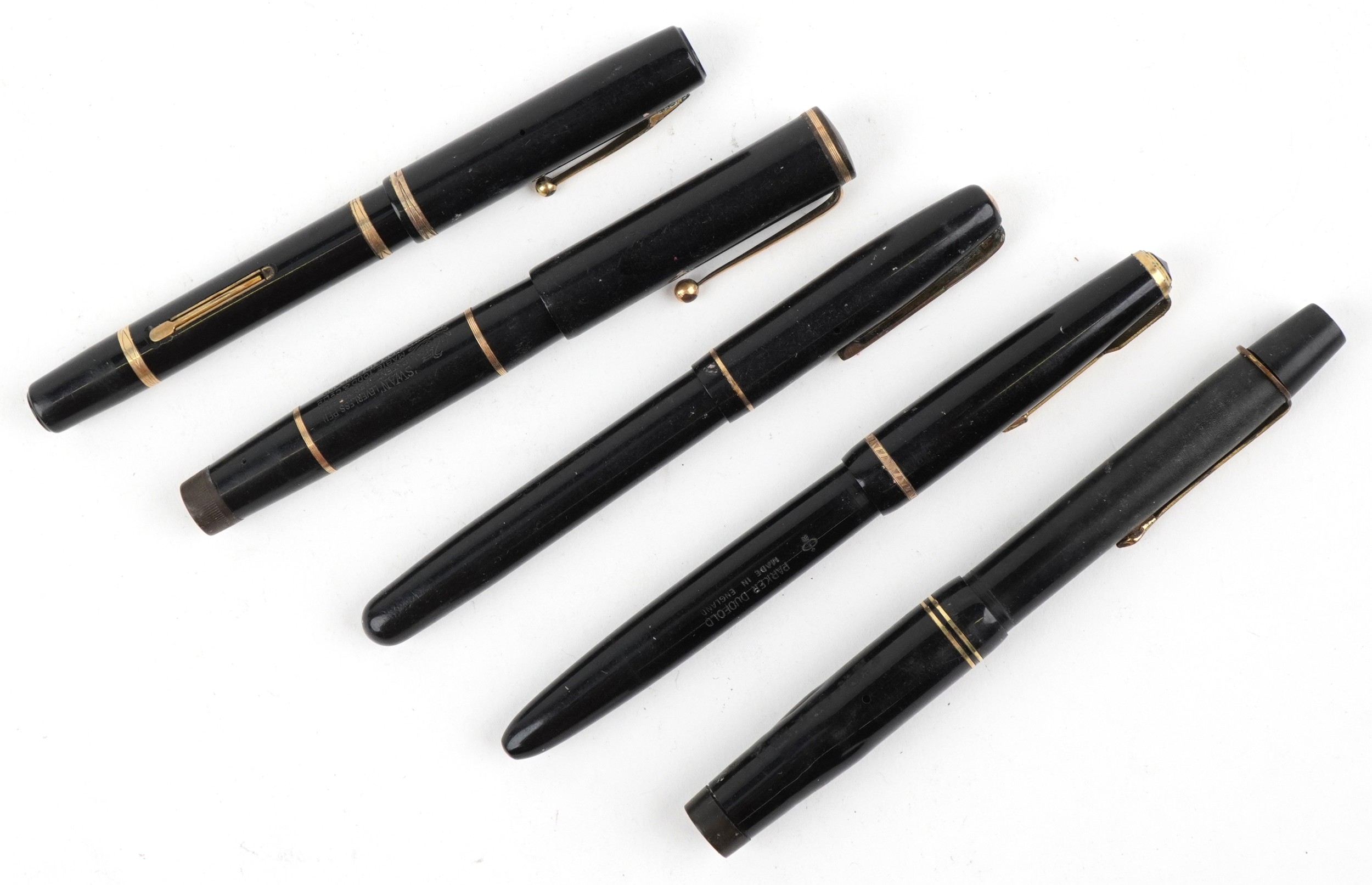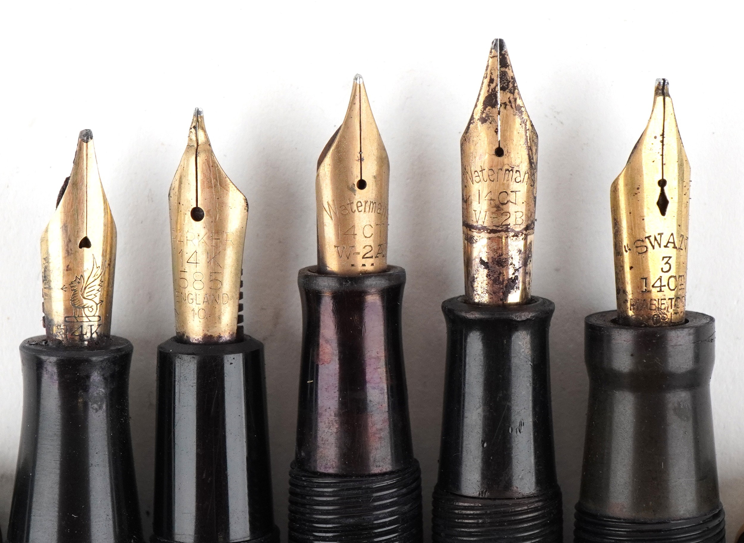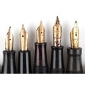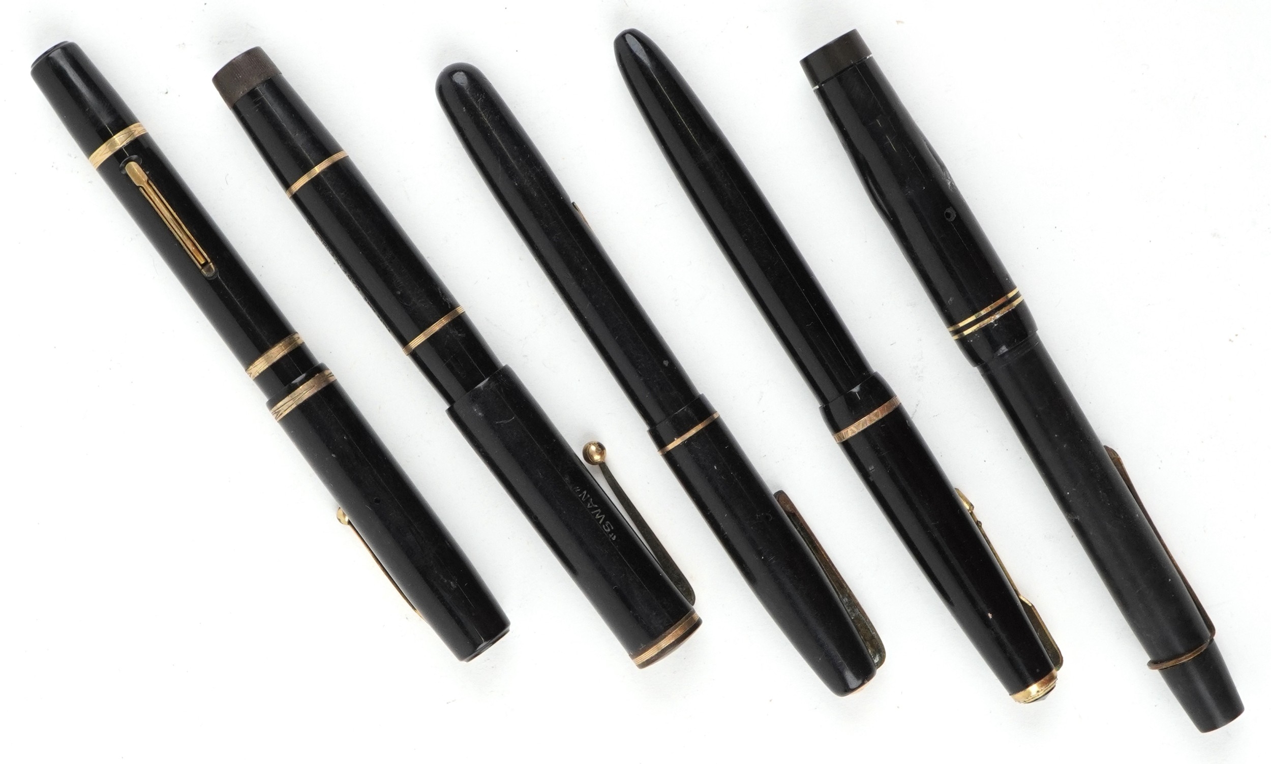 Five vintage fountain pens with 14ct gold nibs including Waterman and Swan.