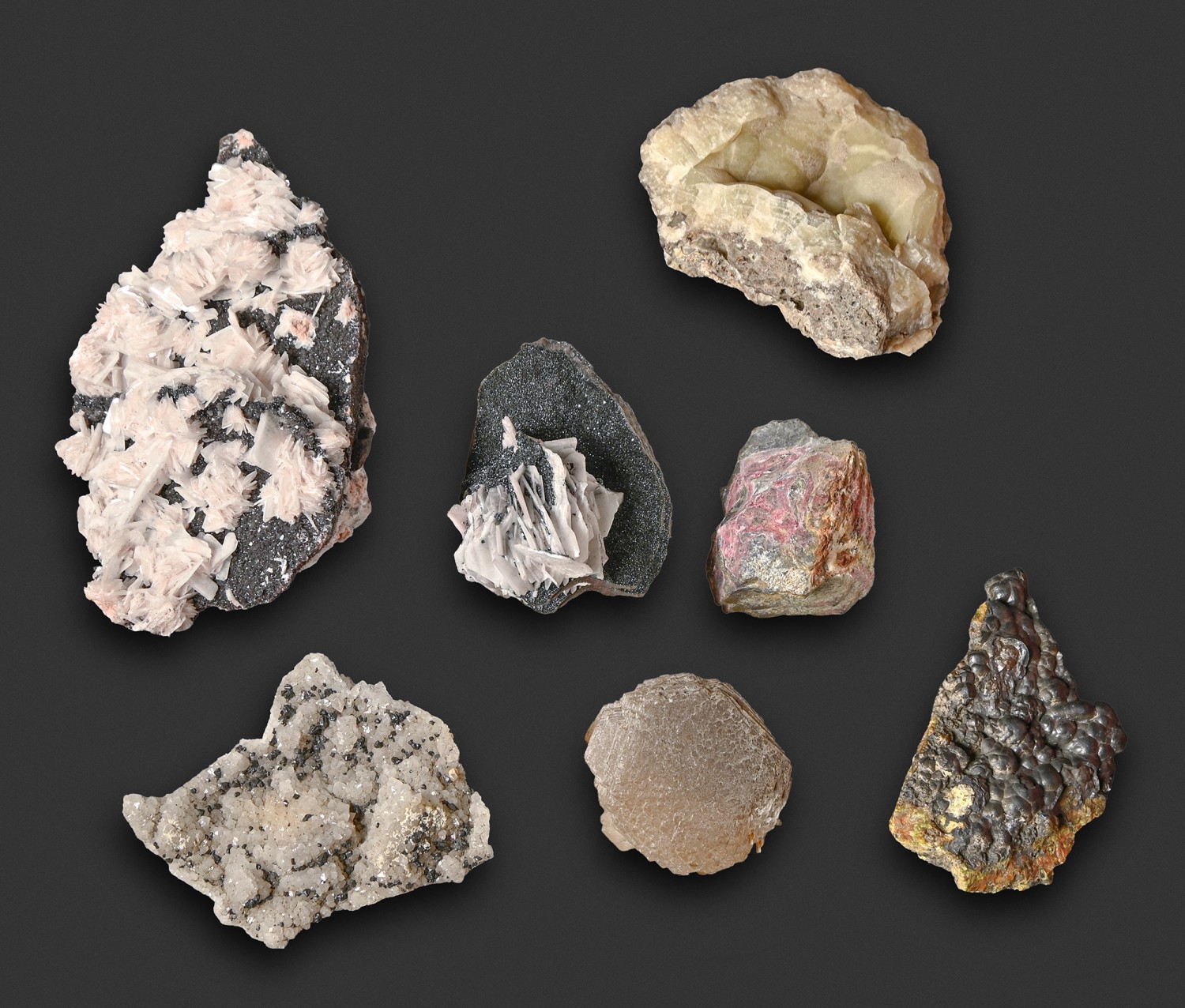 Cumbrian minerals. Epimorphous Quartz after Fluorite with Blende, Rampgill Mine, Nenthead, 83mm, Baryte, Quartz and Specularite and Baryte and Speculite, two specimens, both Haile Moor Mine, Egremont, 130 and 62mm respectively, Erythrine, Tyne Bottom Mine, Garrigill, Alston, Witherite (twinned crystal), Carrs Vein, Nentsberry, Haggs Mine, Nenthead, Coronadite on Mimetite, Caldbeck Fells, 80mm and Calcite (var. Stalagmite) Flow Edge, Alston, Harker Collection label (7)