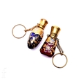 Two late 19th to early 20th Century glass finger scent bottles, to include a ruby red and a blue example, each with a hinged bayonet cap with internal glass stopper and on a gilt metal suspension chain and loop, each approximately 5cm high, slight damage. (2)