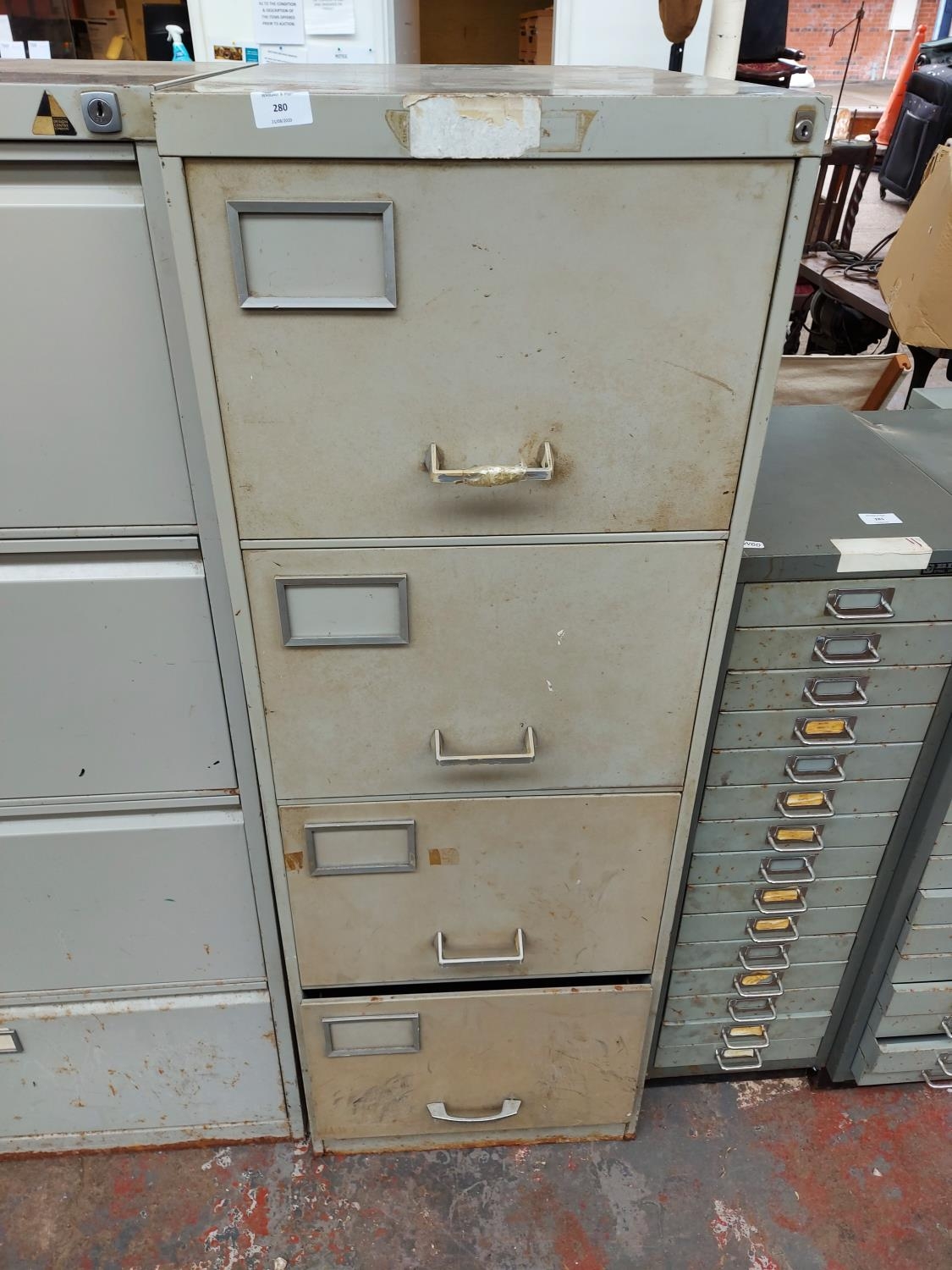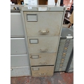 A four drawer metal office filing cabinet