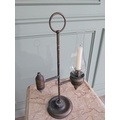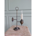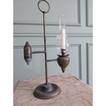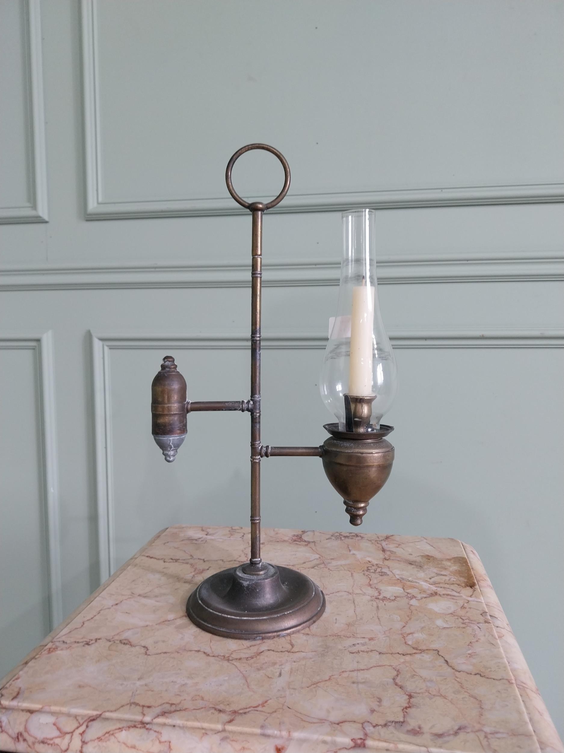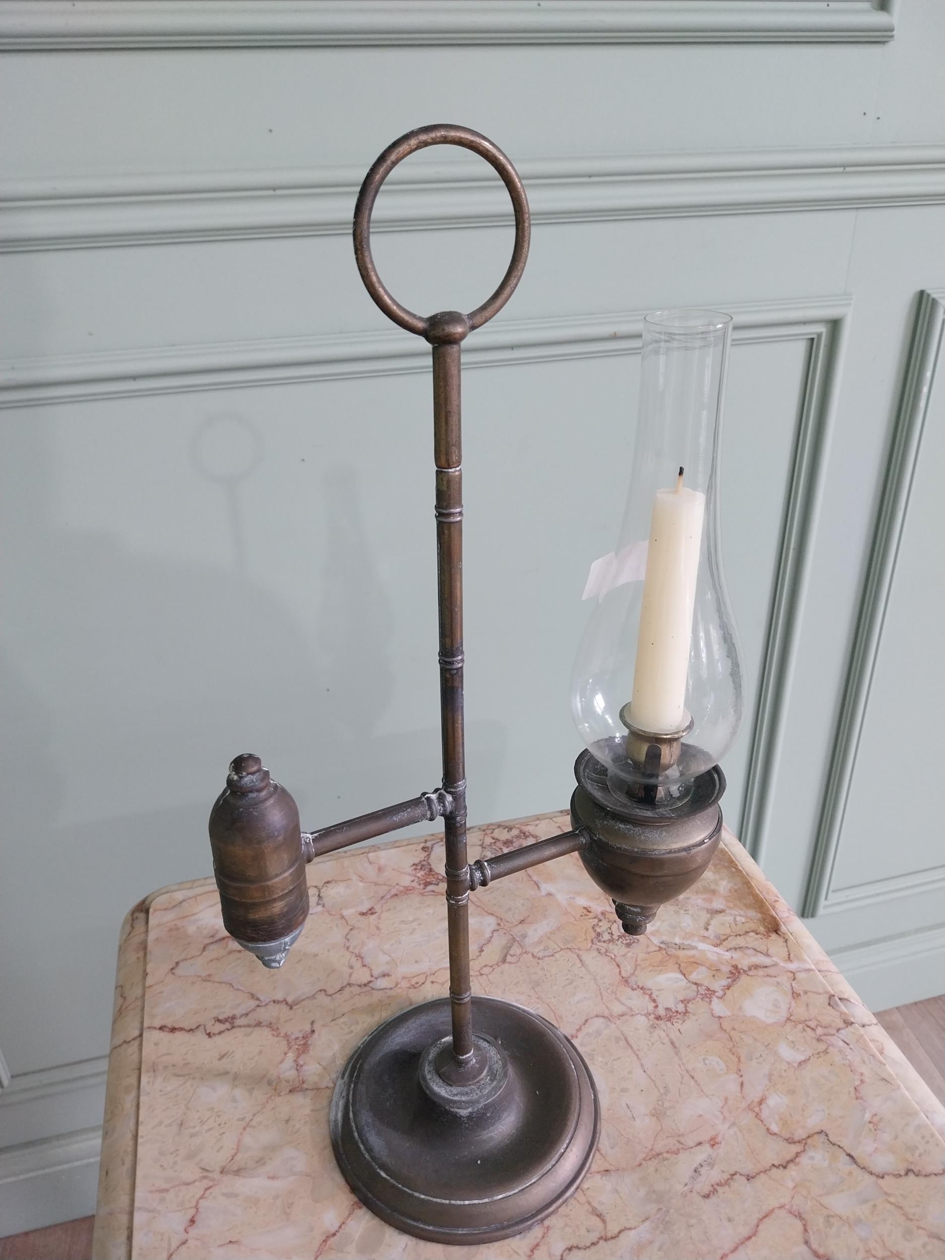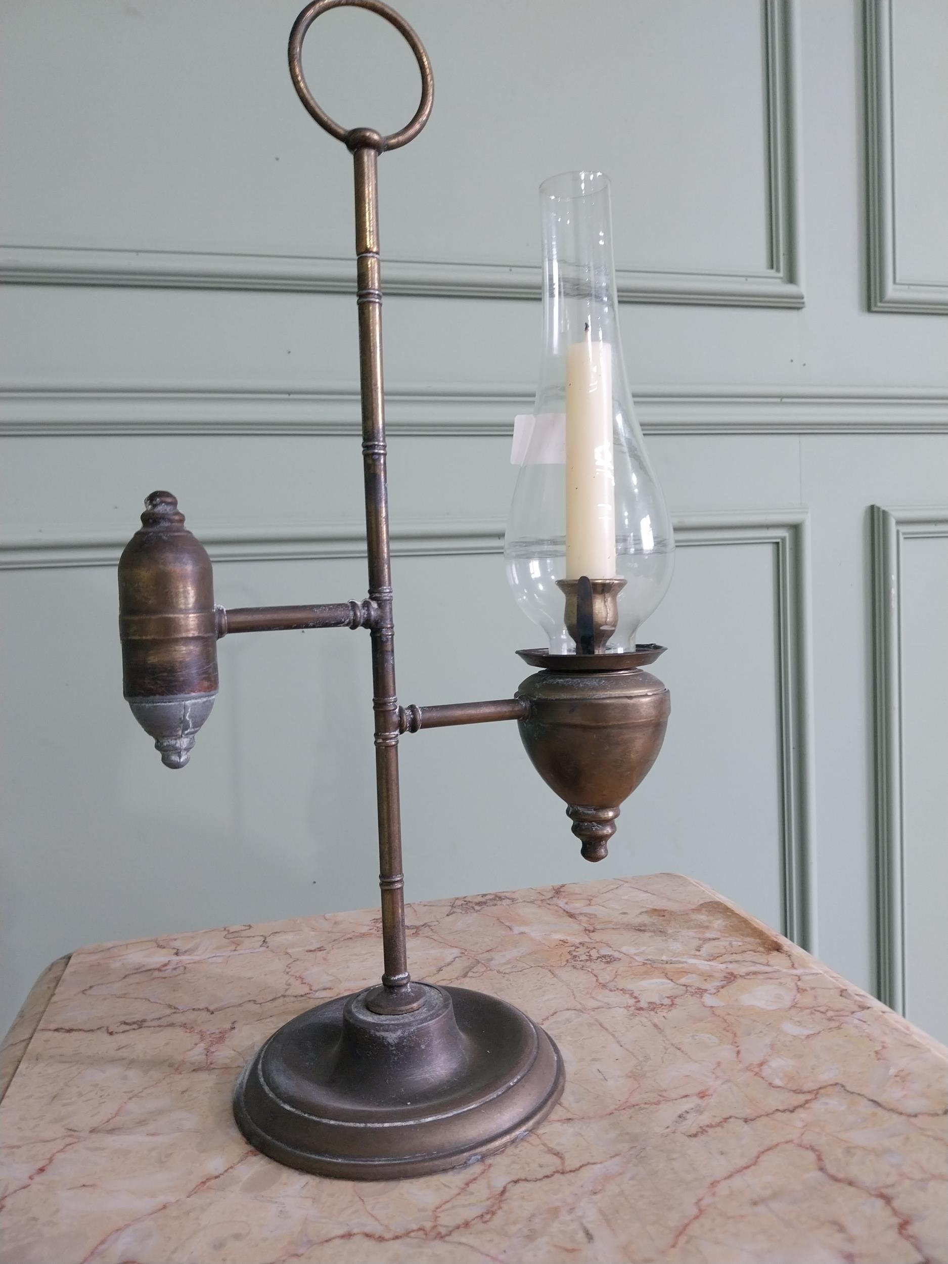 Edwardian brass students lamp with glass chimney {43 cm H x 24 cm W x 13 cm D}.