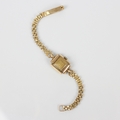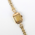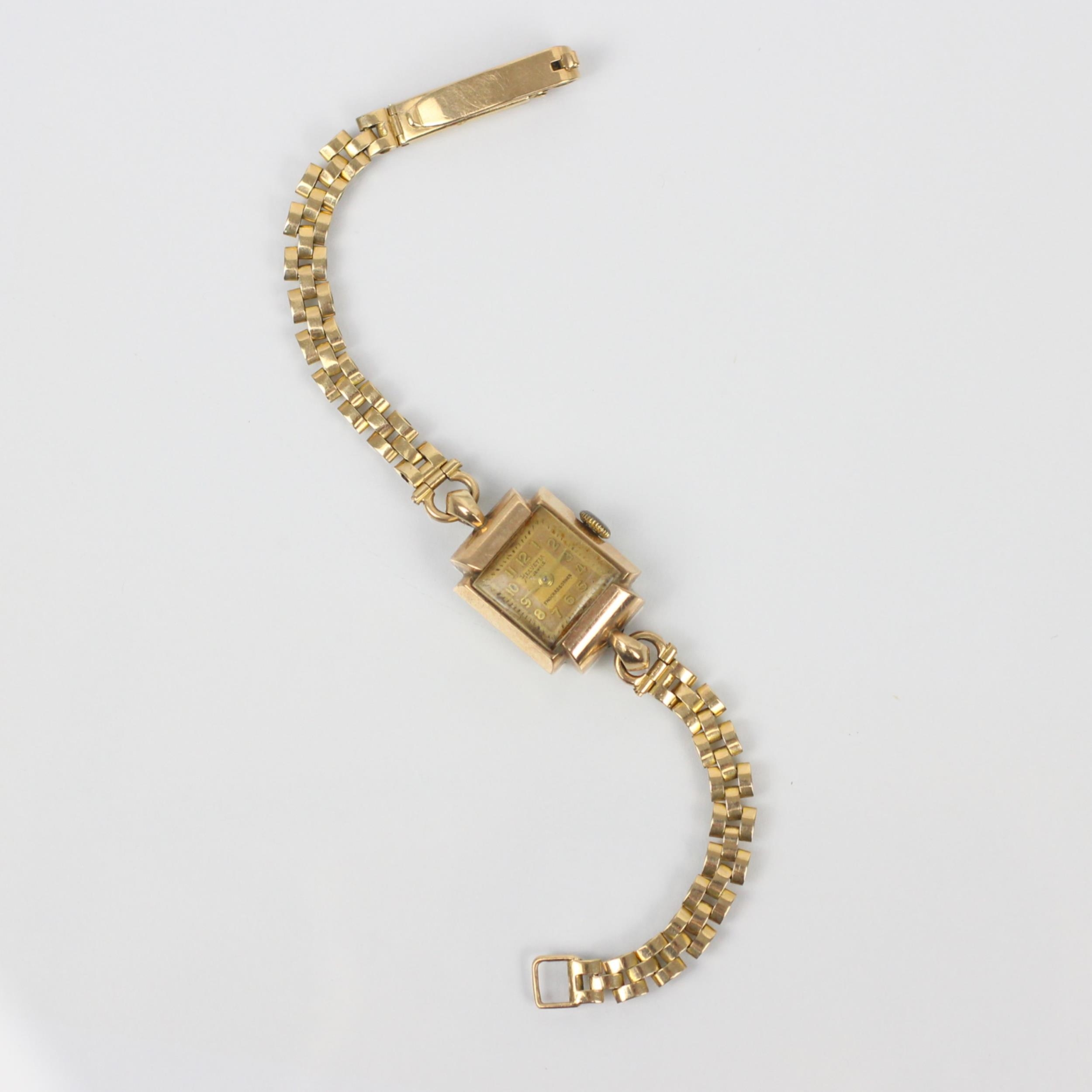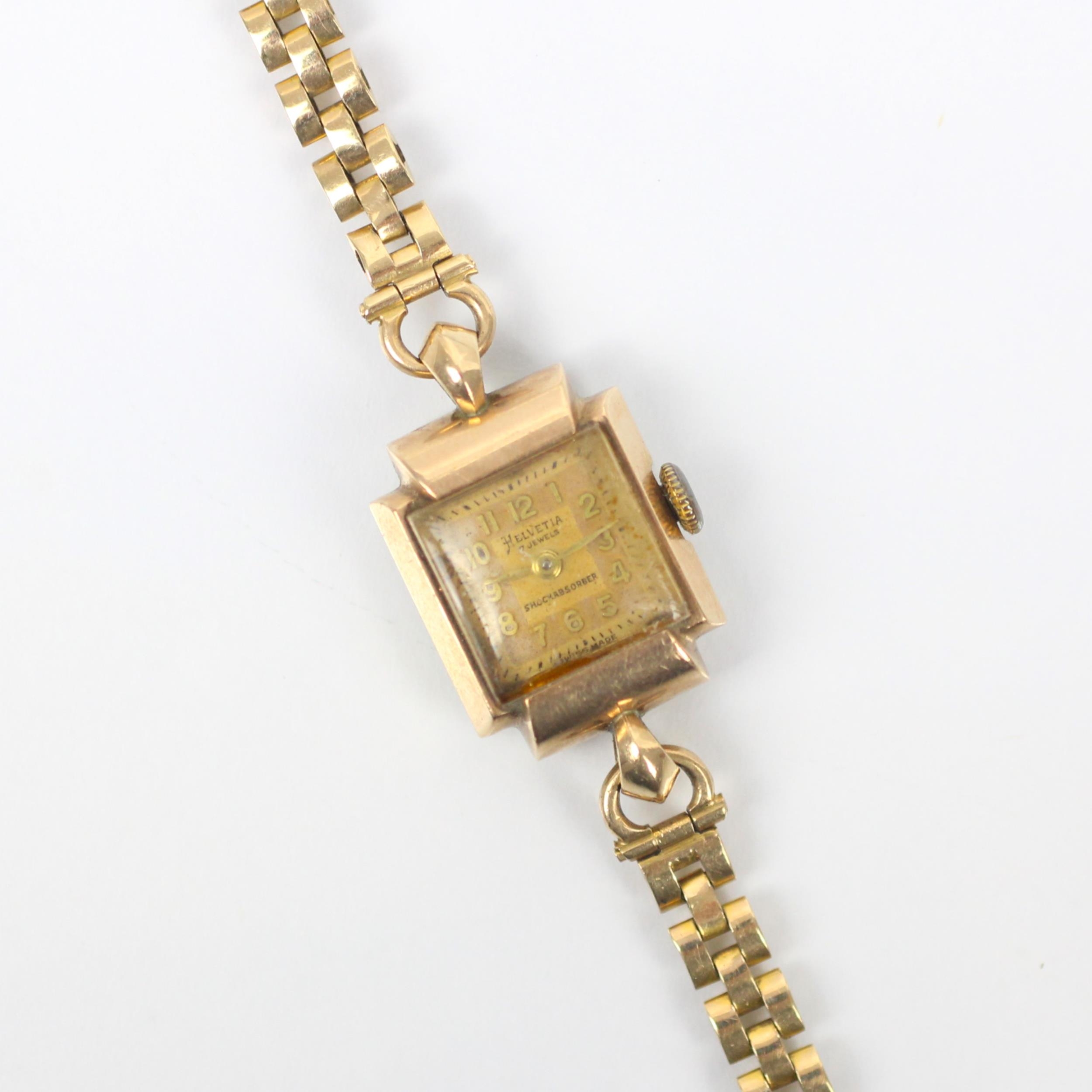 An early 20th century 9ct Helvetia ladies wristwatch, the gold coloured square dial with Arabic numerals, set to plain polished shaped case, stamped to interior, possibly Chester 1921, 1.8cm wide (including crown) upon associated 9ct gold bracelet, gross weight 18gms (including movement)