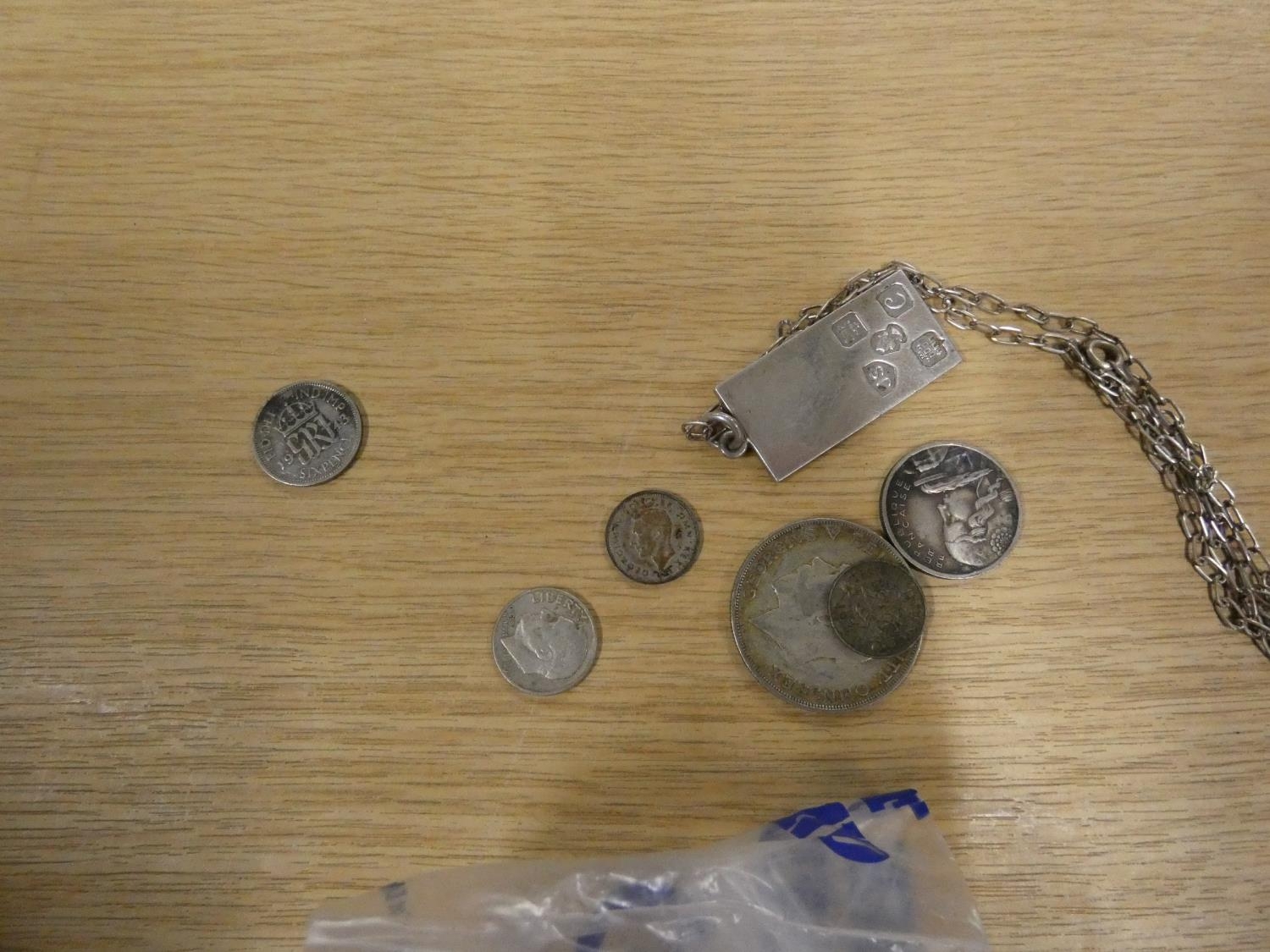 Miscellaneous coins and silver ingot pendant and chain.