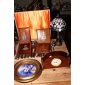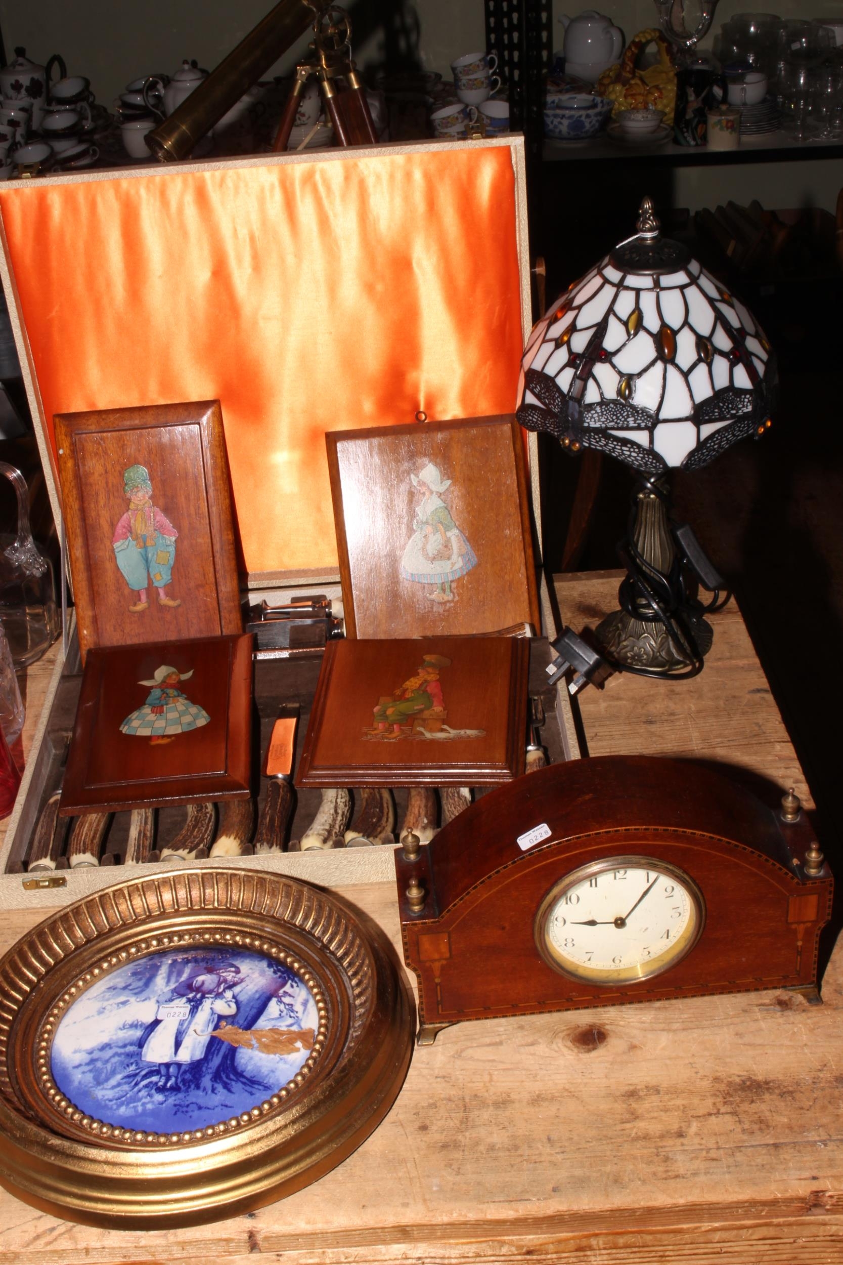 Horn handled steak knives, forks and servers, inlaid clock, Tiffany style table lamp, Dutch children and blue and white plaques.