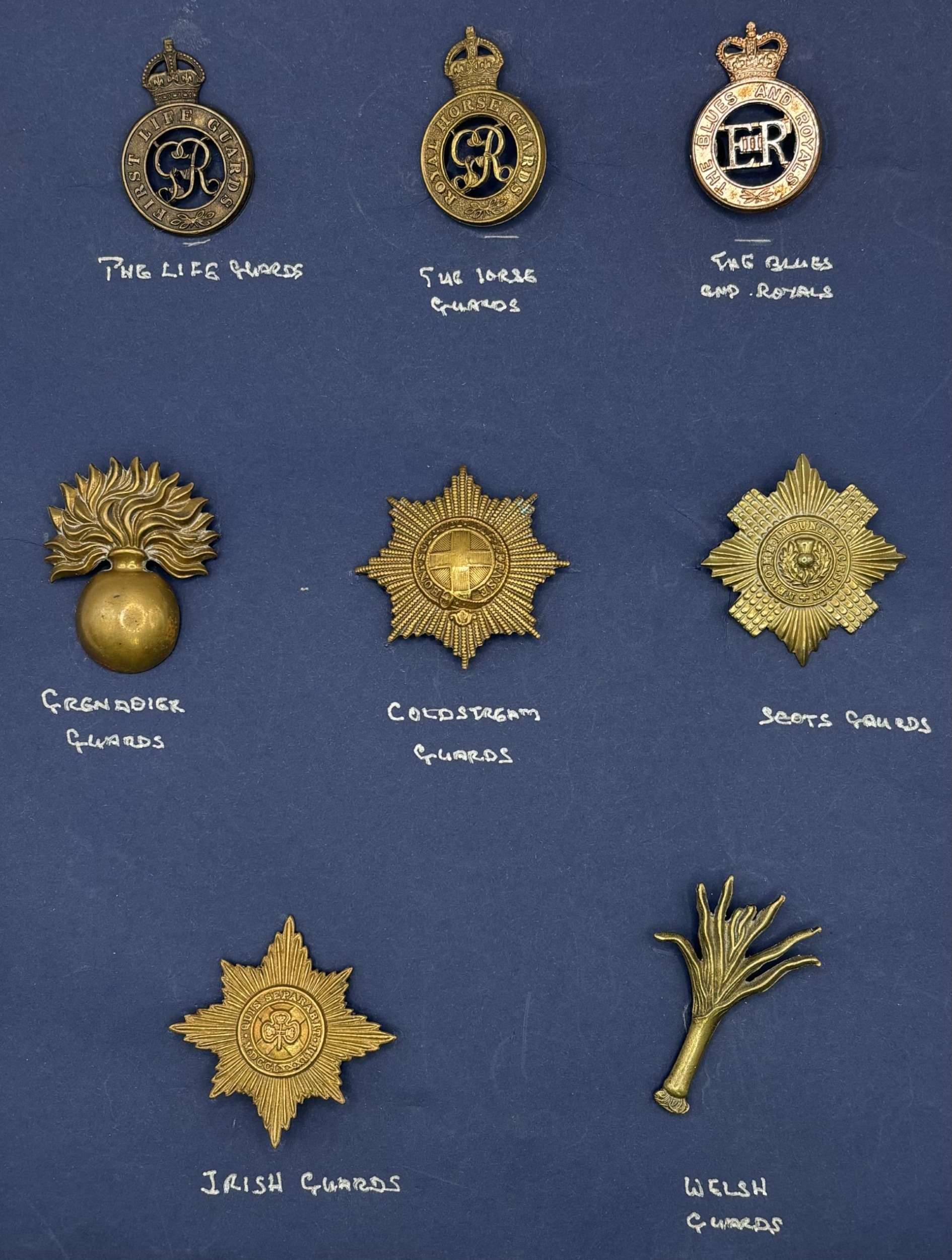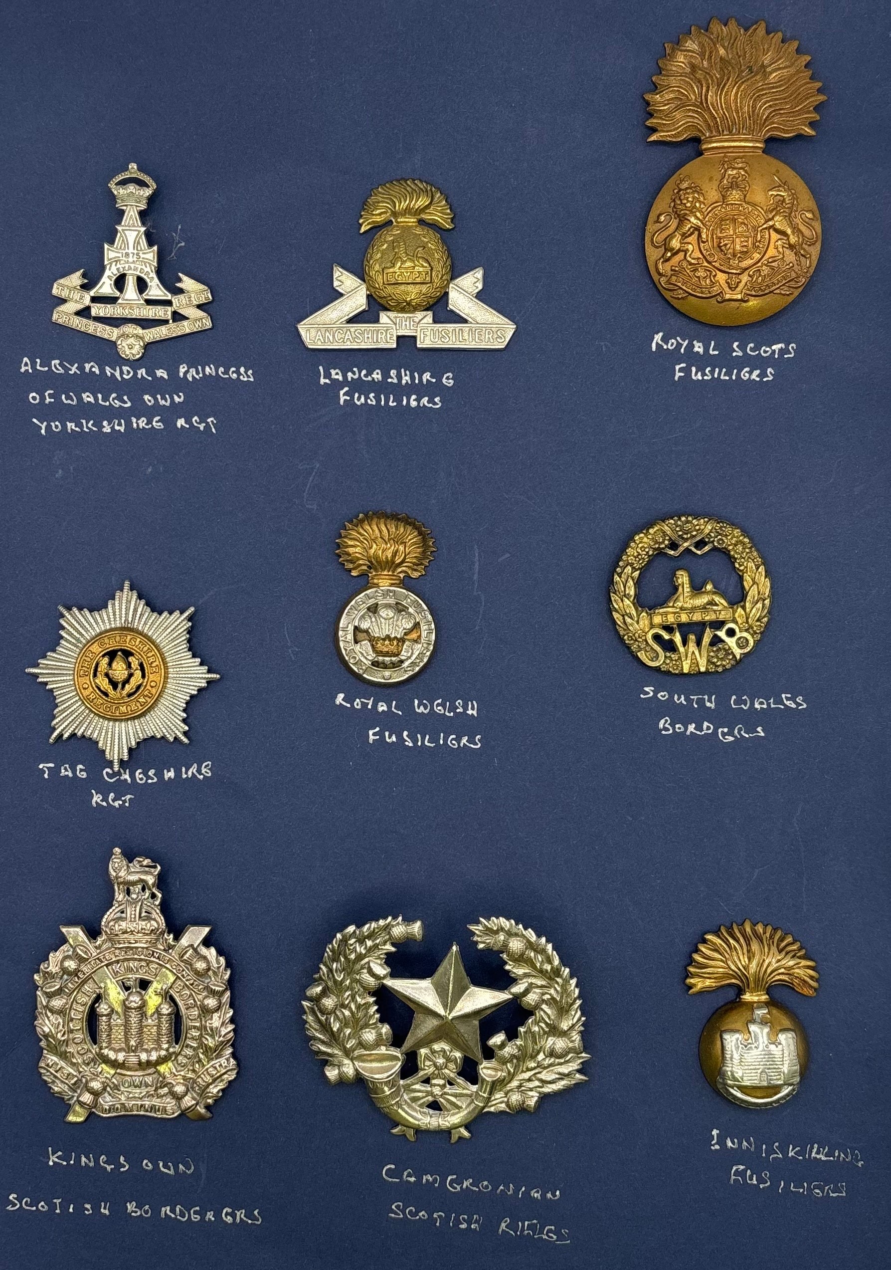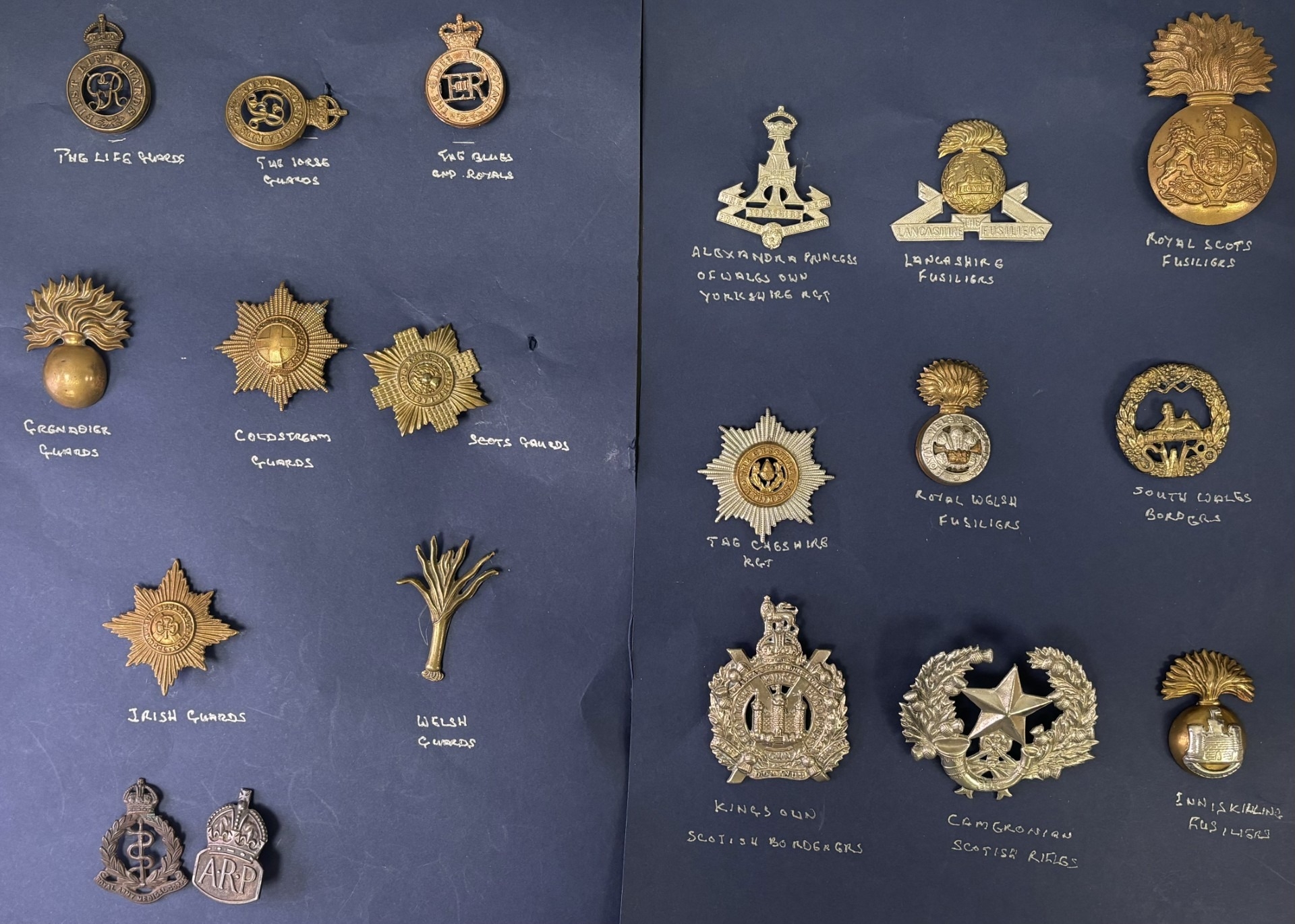 Collection of 19 Army cap badges. To include First Life Guards; Royal Horse Guards; Blues and Royals; Grenadier Guards; Coldstream Guards; Scots Guards; Irish Guards; Welsh Guards; The Green Howards (Alexandra Princess of Wales' Own Yorkshire Regiment); Lancashire Fusiliers; Royal Scots Fusiliers; South Wales Borderers; King's Own Scottish Borderers; Cameronians (Scottish Rifles); Royal Inniskilling Fusiliers (post 1934); Air Raid Precautions & Royal Army Medical Corps.