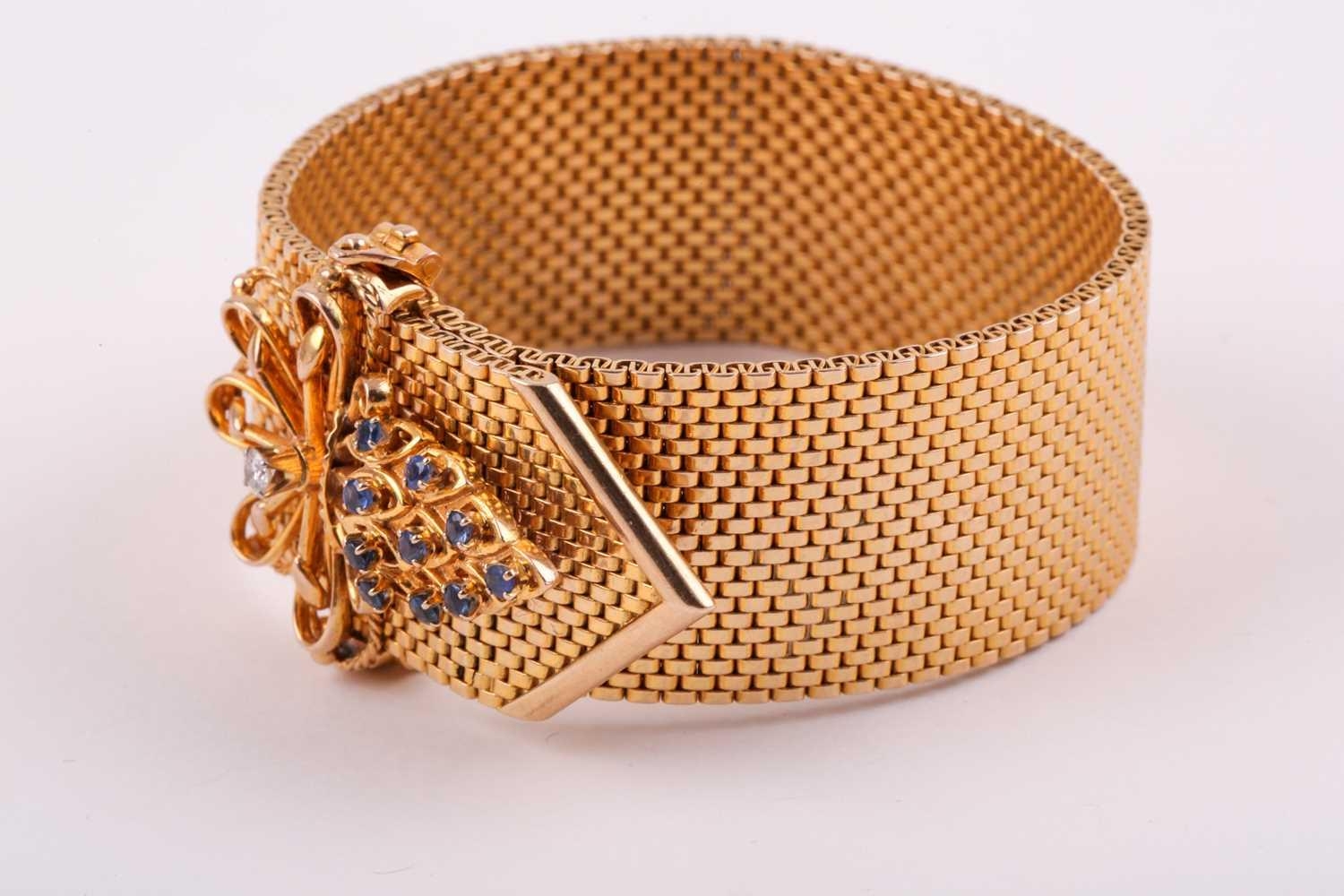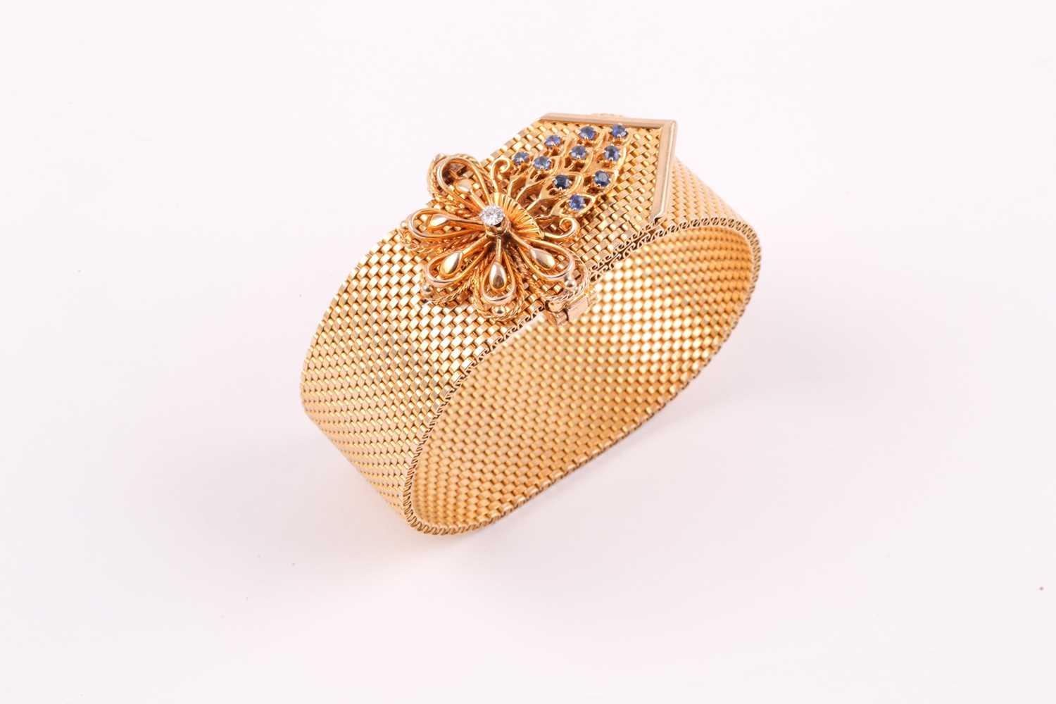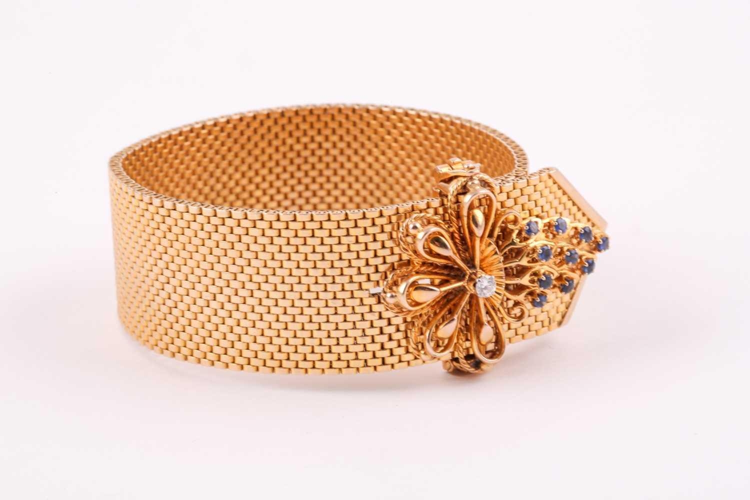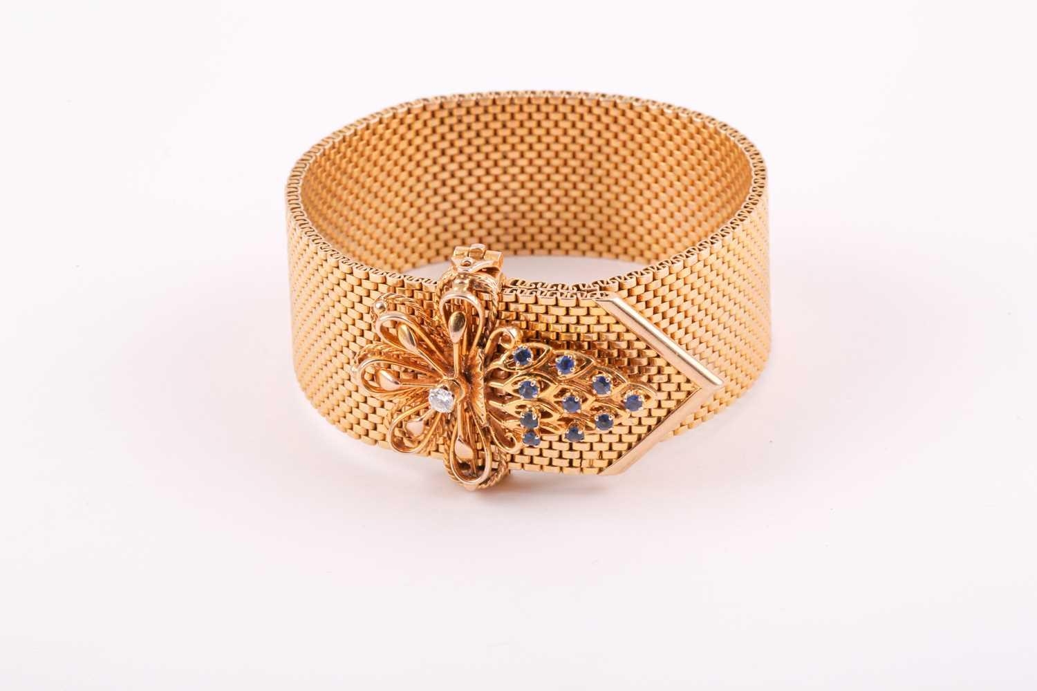 A mid to late 20th century 9ct yellow gold mesh-link buckle bracelet, the openwork clasp set with a round brilliant-cut diamond of approximately 0.10 carats, and ten small round-cut sapphires, with three holes for adjustable wear, pointed belt terminal, makers mark SS to clasp, full length approximately 21 cm.