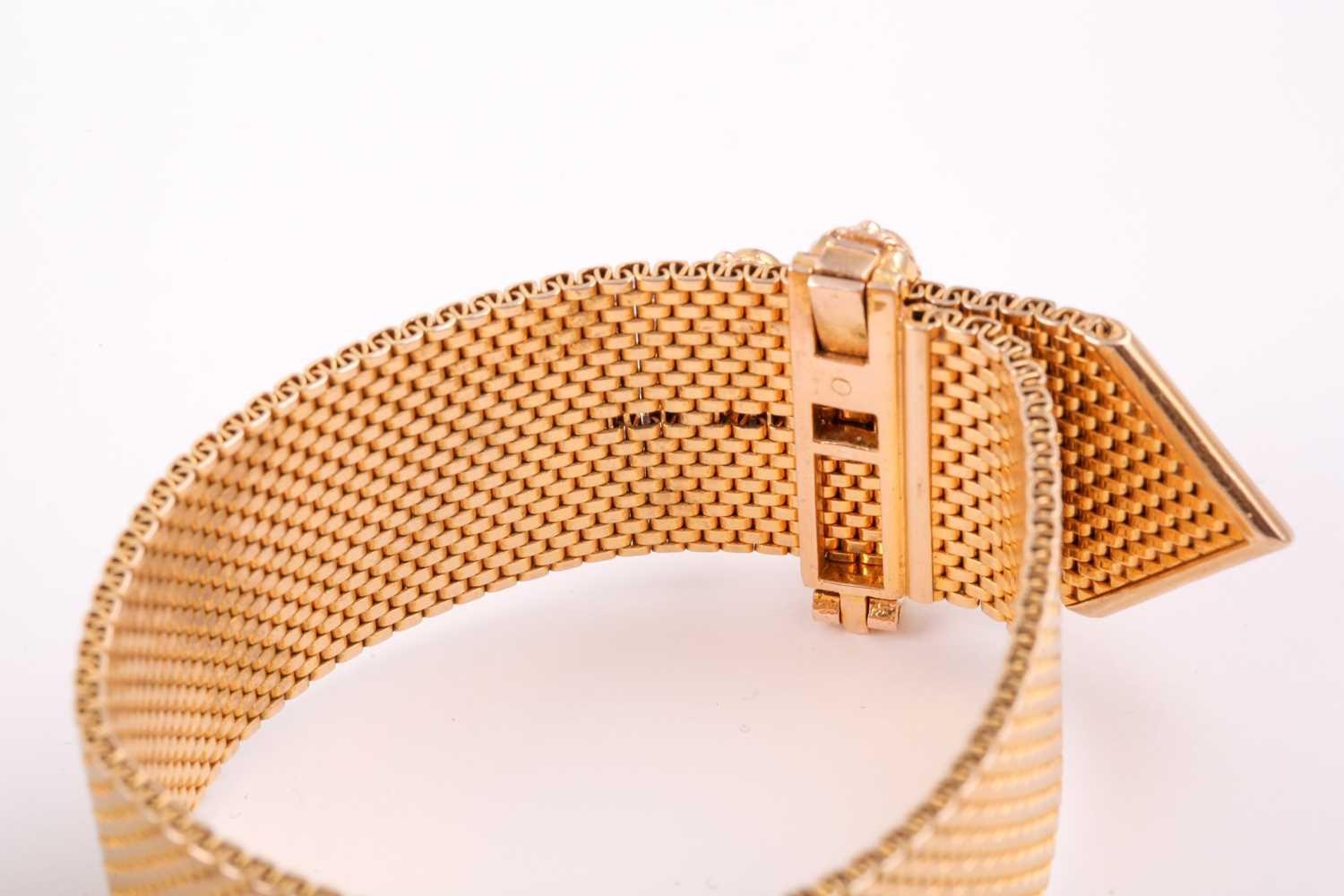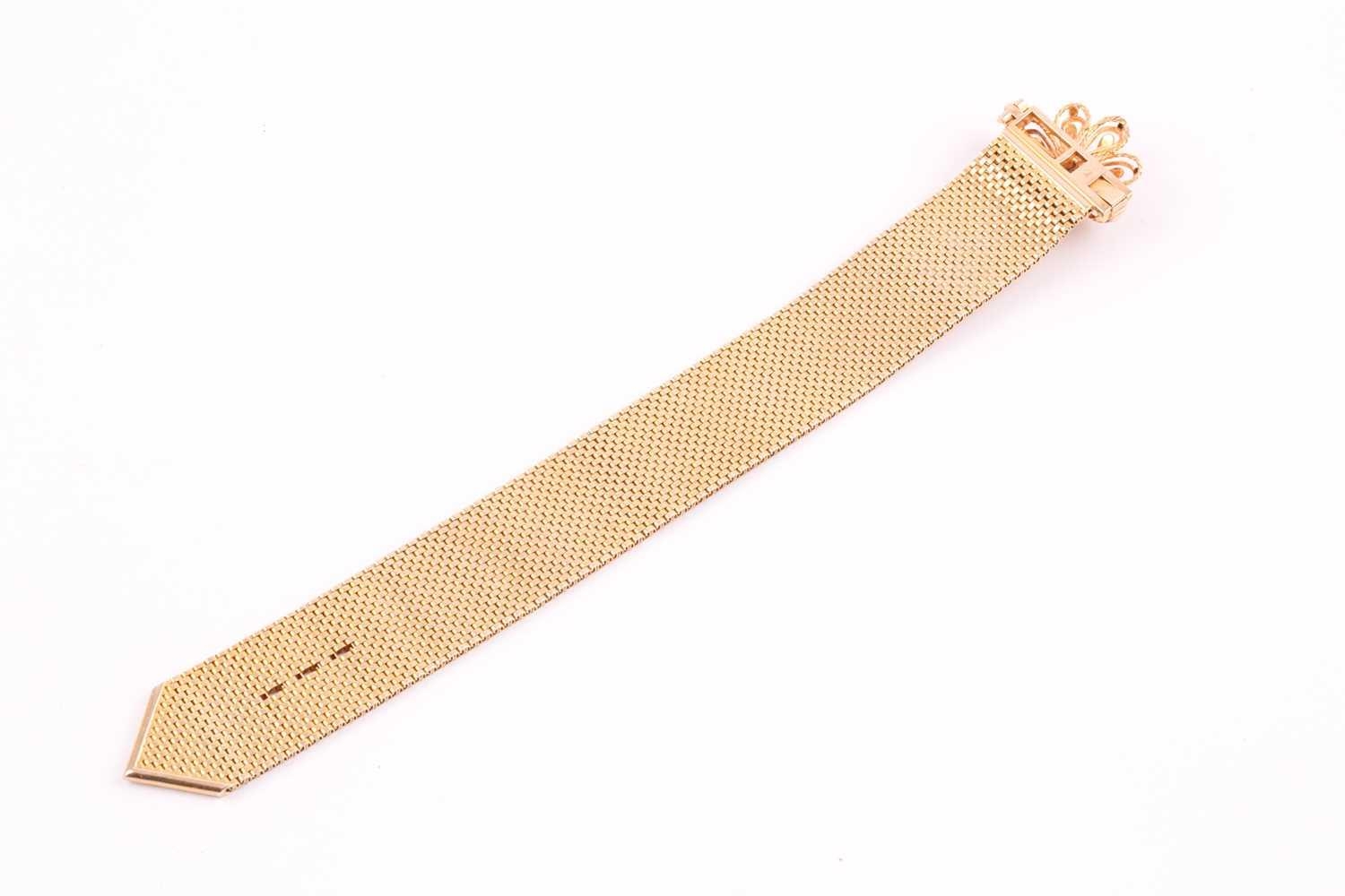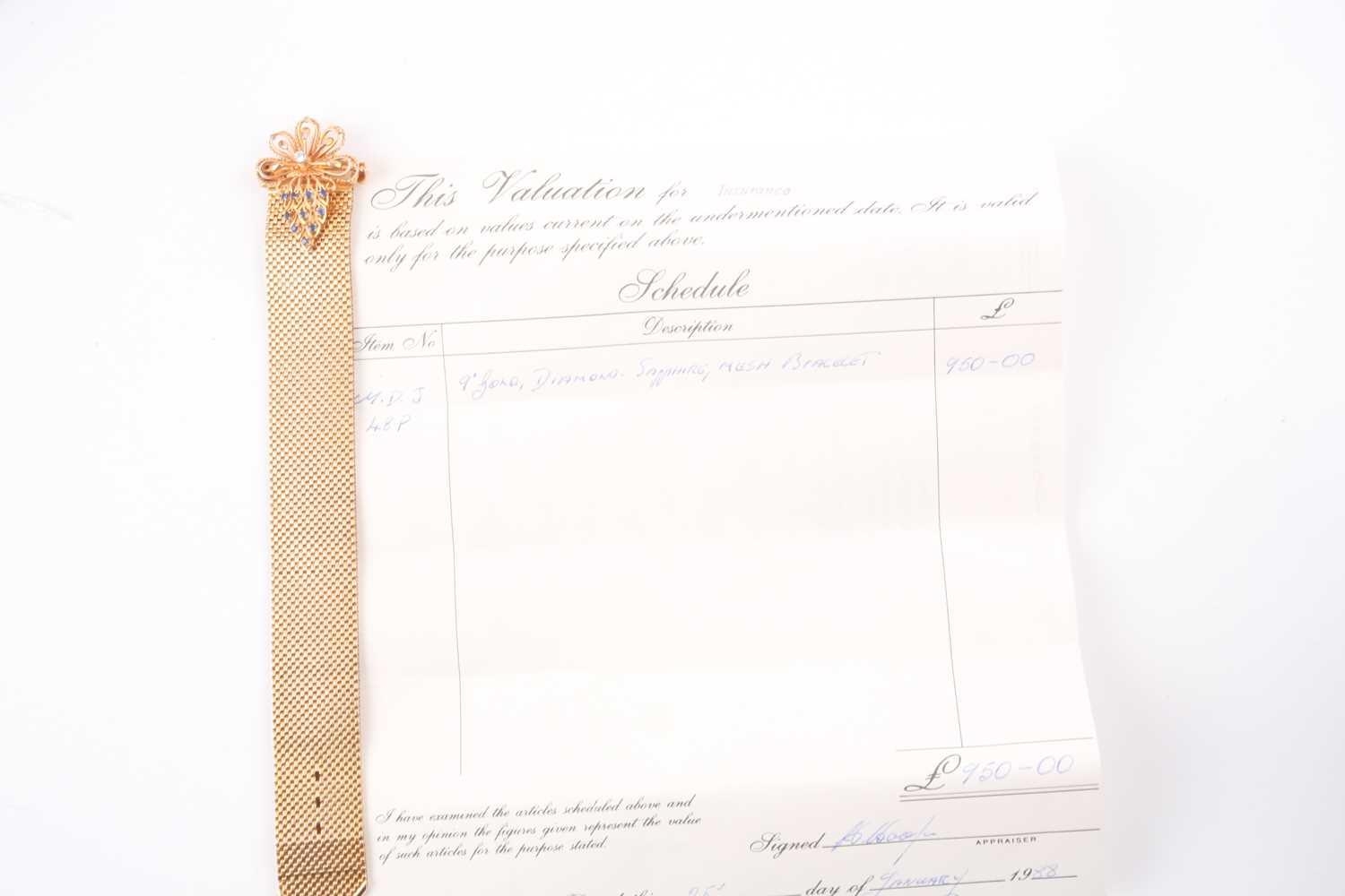 A mid to late 20th century 9ct yellow gold mesh-link buckle bracelet, the openwork clasp set with a round brilliant-cut diamond of approximately 0.10 carats, and ten small round-cut sapphires, with three holes for adjustable wear, pointed belt terminal, makers mark SS to clasp, full length approximately 21 cm.