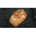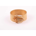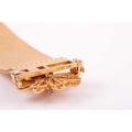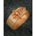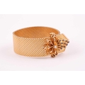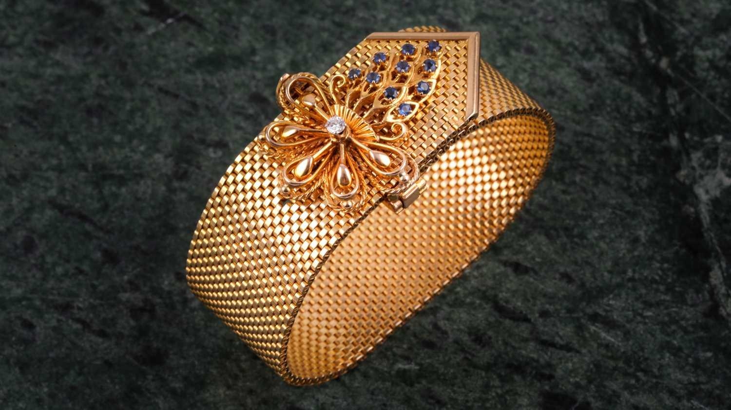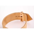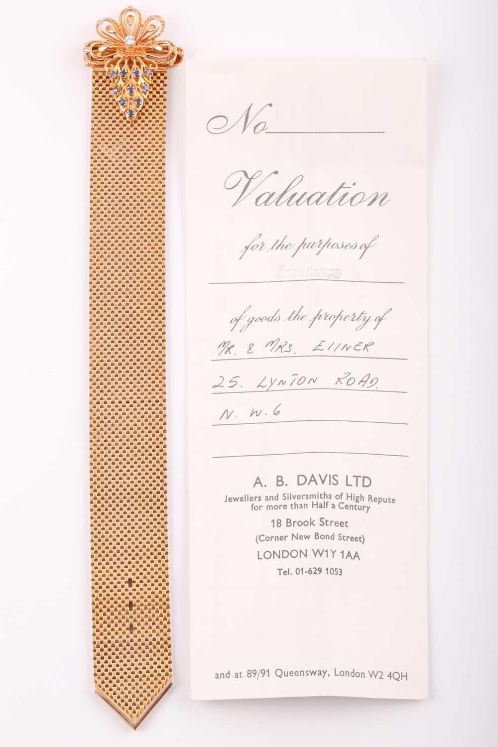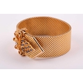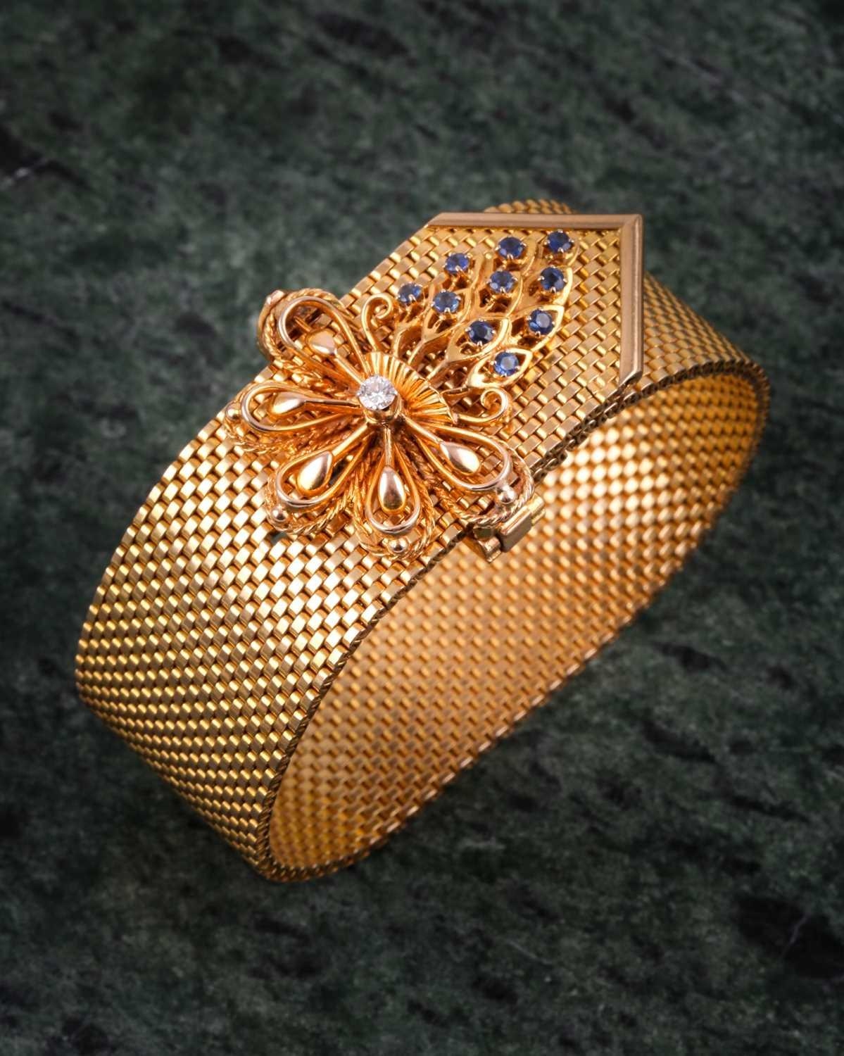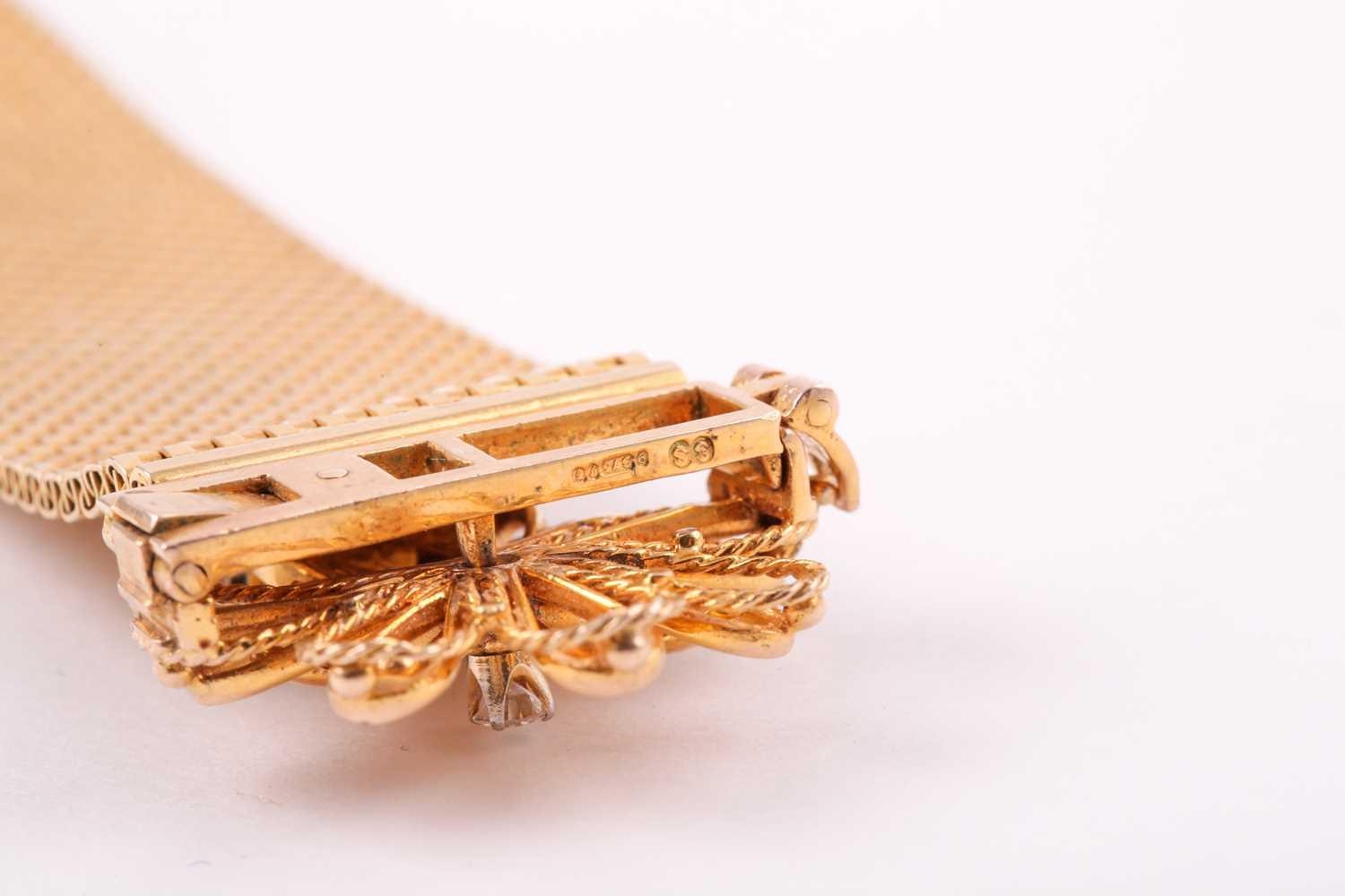 A mid to late 20th century 9ct yellow gold mesh-link buckle bracelet, the openwork clasp set with a round brilliant-cut diamond of approximately 0.10 carats, and ten small round-cut sapphires, with three holes for adjustable wear, pointed belt terminal, makers mark SS to clasp, full length approximately 21 cm.