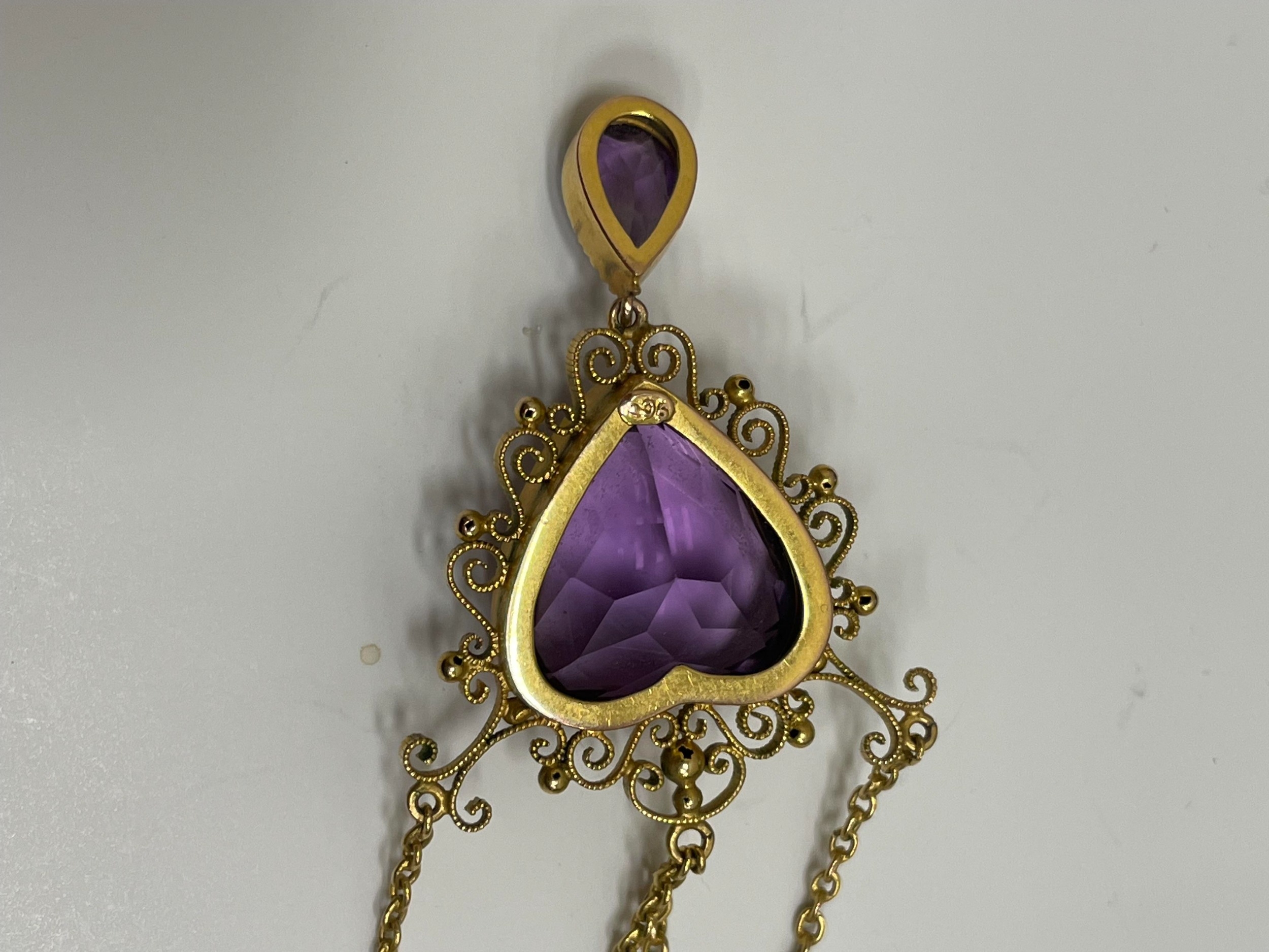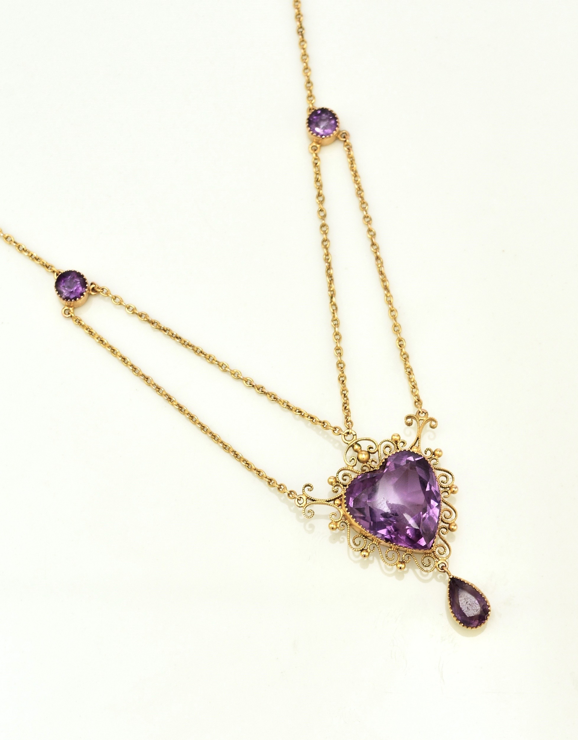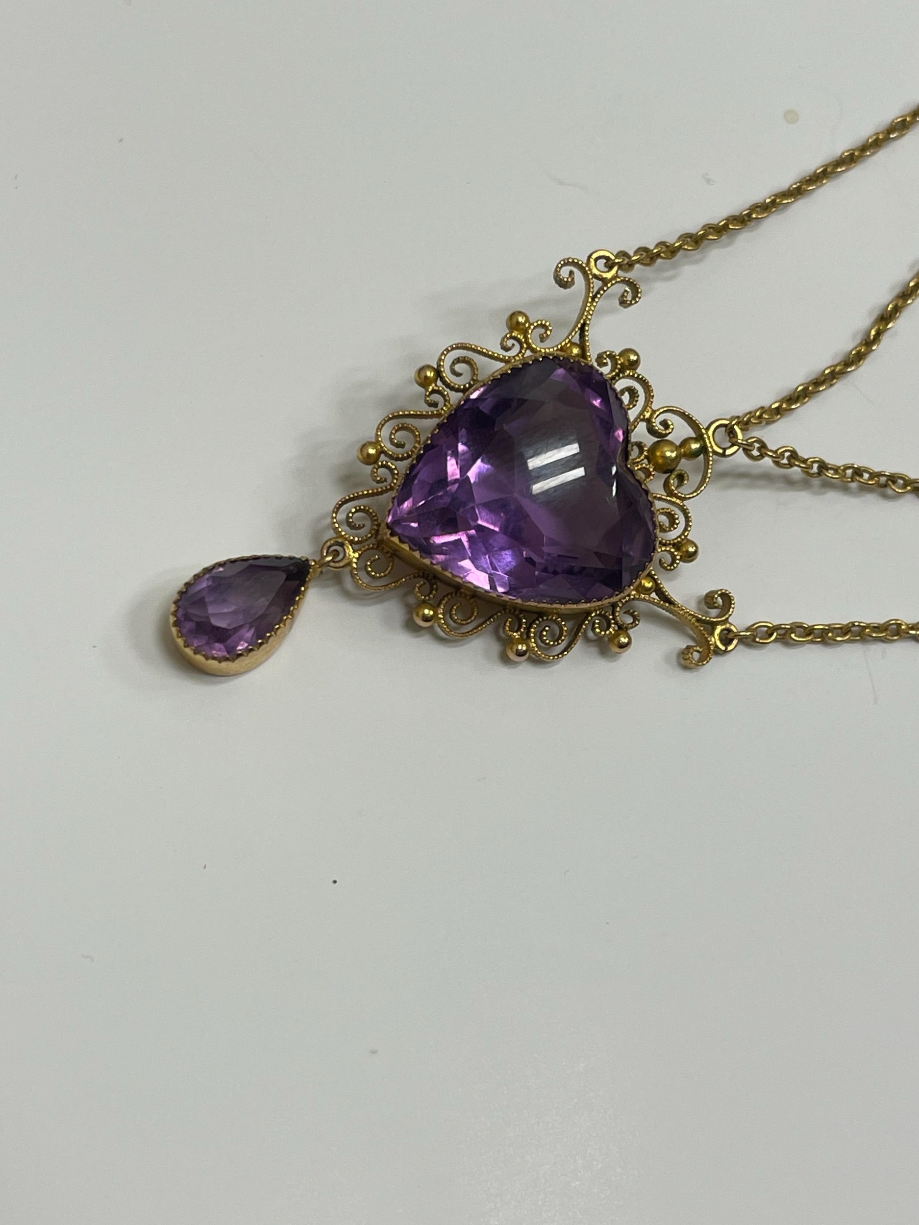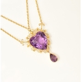 An amethyst pendant necklace, designed as a heart shaped faceted amethyst within a cannetille scroll and bead work surround, stamped '9ct', suspending pear cut amethyst drop, with attached yellow metal chain set with two round mixed cut amethysts, all with bolt ring clasp, chain measures approx 39cm, weight approx 8.8g Condition:Heart shaped amethyst measures approx 16.5mm x 15.5mm x 10.5mm deep, general wear but no significant visible damage, refer to images