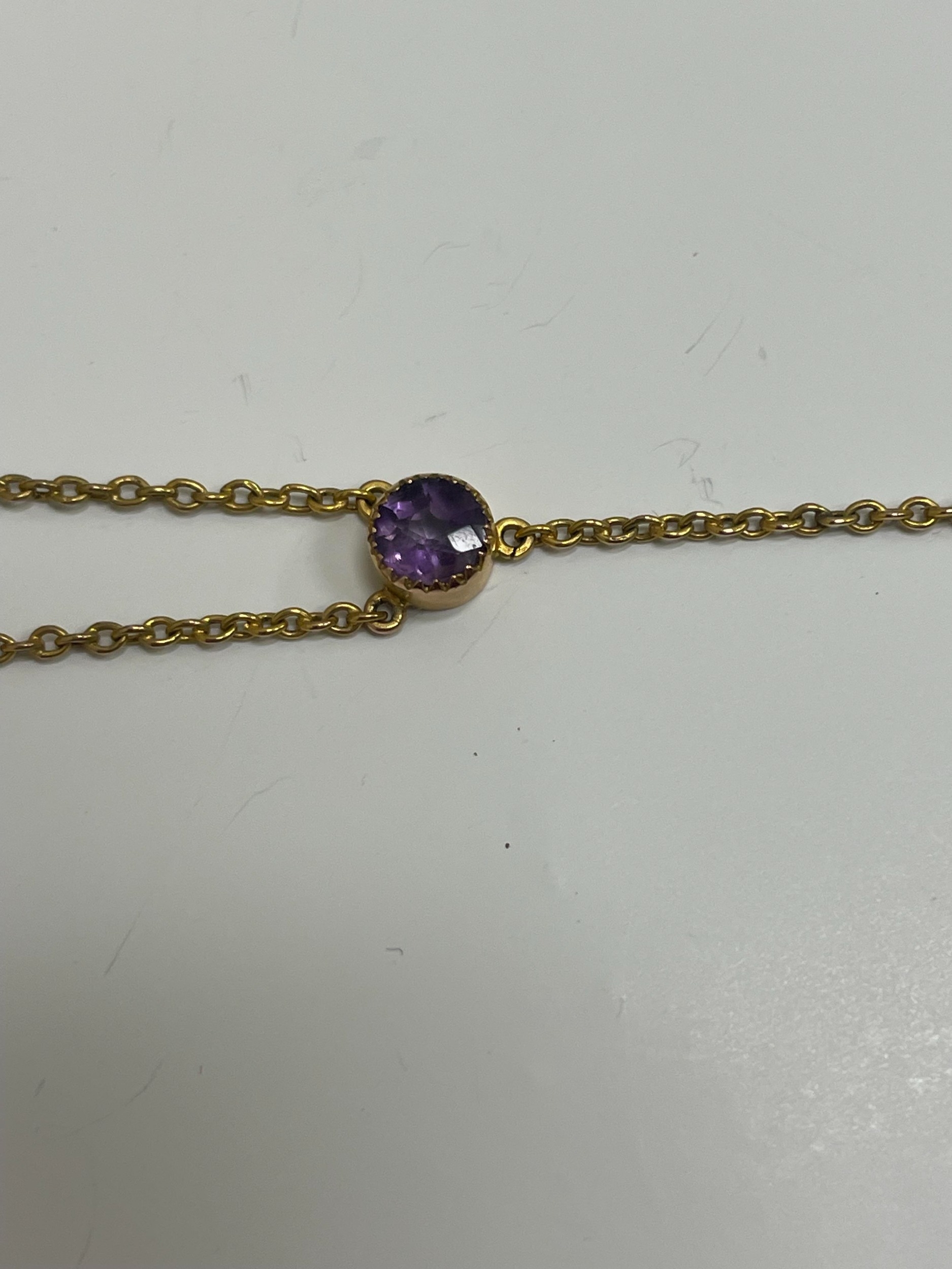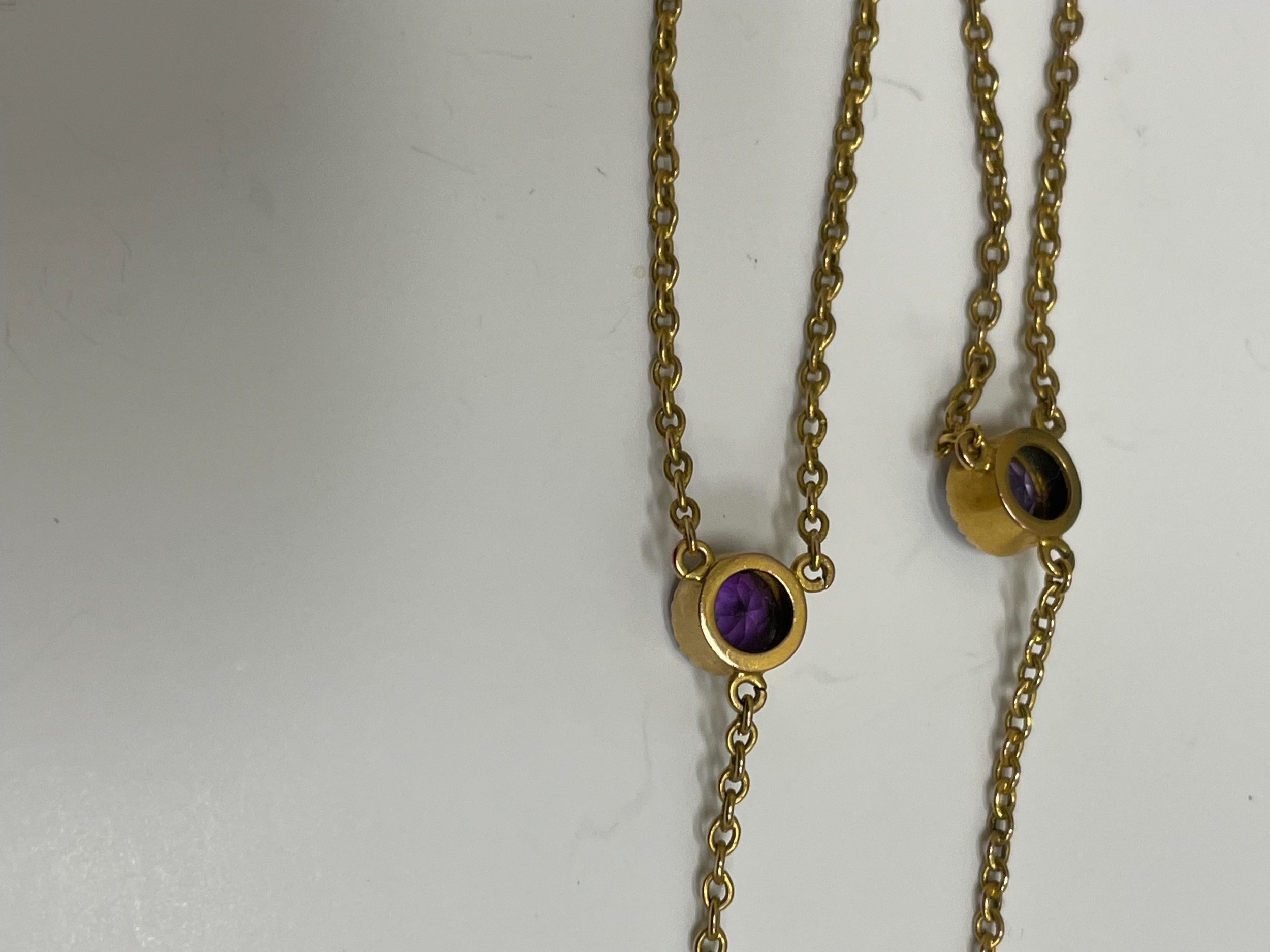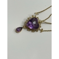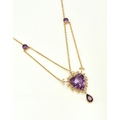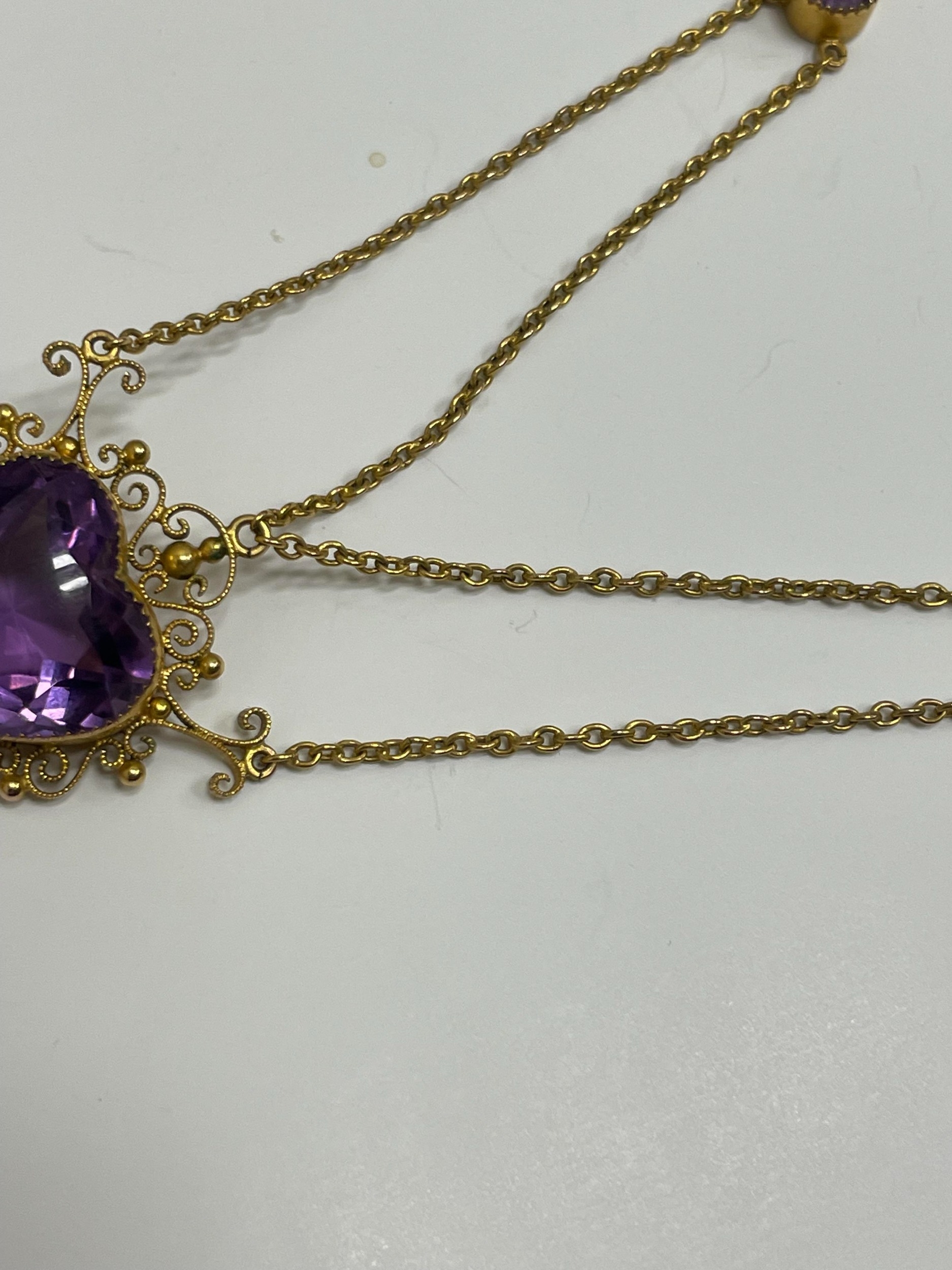 An amethyst pendant necklace, designed as a heart shaped faceted amethyst within a cannetille scroll and bead work surround, stamped '9ct', suspending pear cut amethyst drop, with attached yellow metal chain set with two round mixed cut amethysts, all with bolt ring clasp, chain measures approx 39cm, weight approx 8.8g Condition:Heart shaped amethyst measures approx 16.5mm x 15.5mm x 10.5mm deep, general wear but no significant visible damage, refer to images