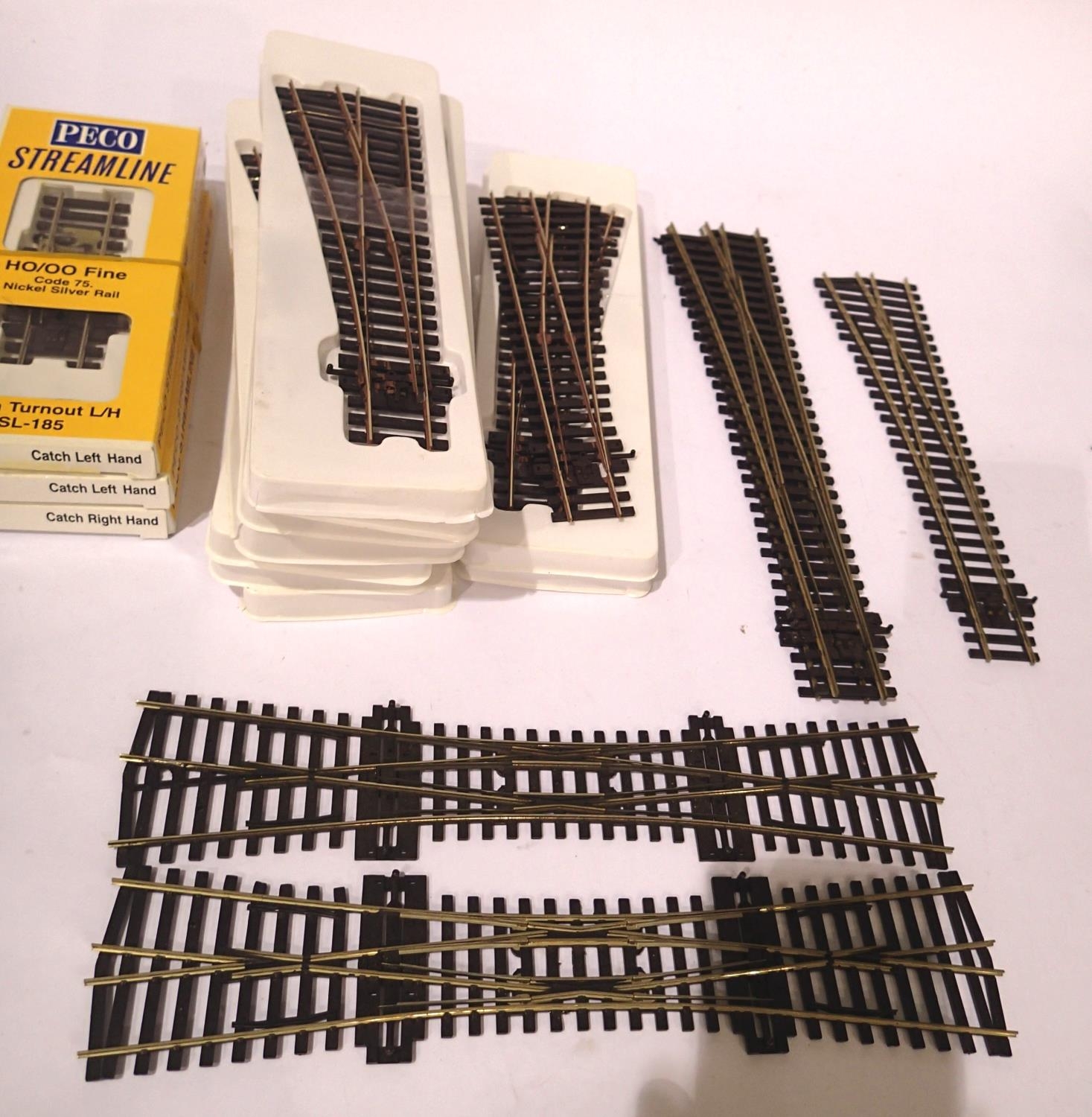 Peco OO points, code 75 including double slip x2, short L/H x7, short RH x3, med L/H x1, long L/H x2, catch L/H x2 and catch R/H x1. P&P Group 1 (£14+VAT for the first lot and £1+VAT for subsequent lots)