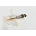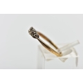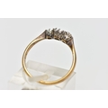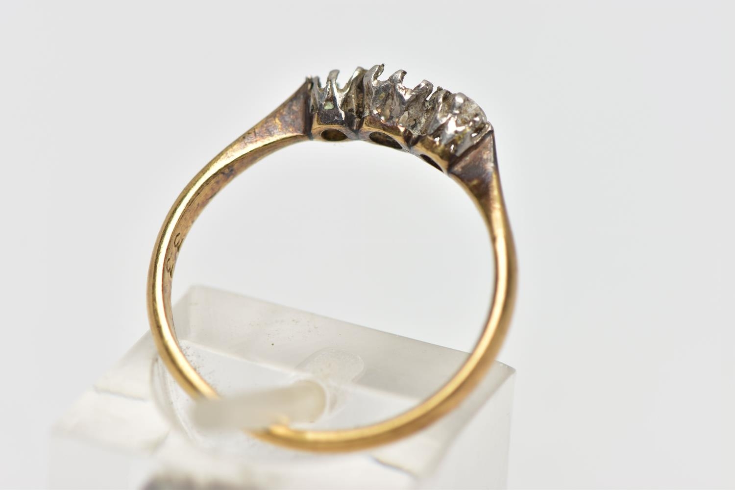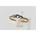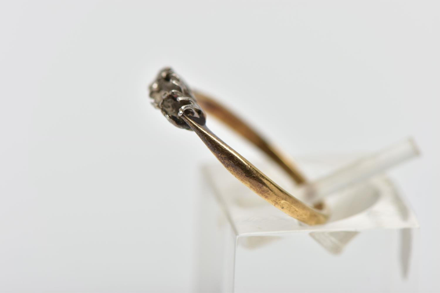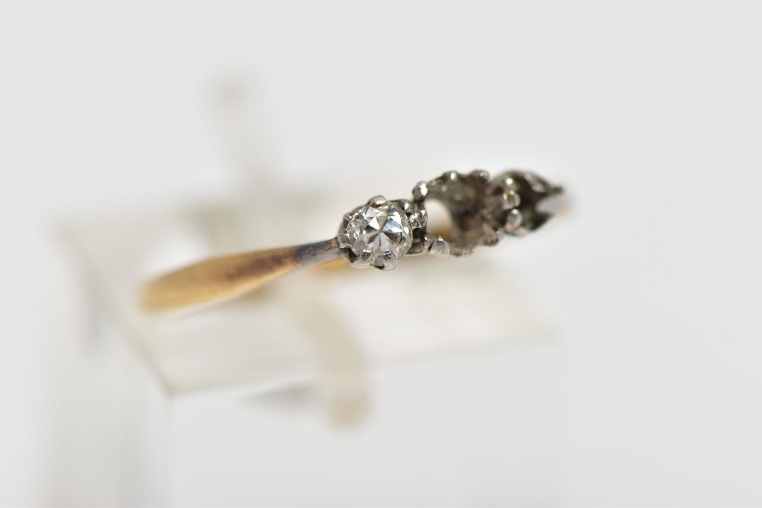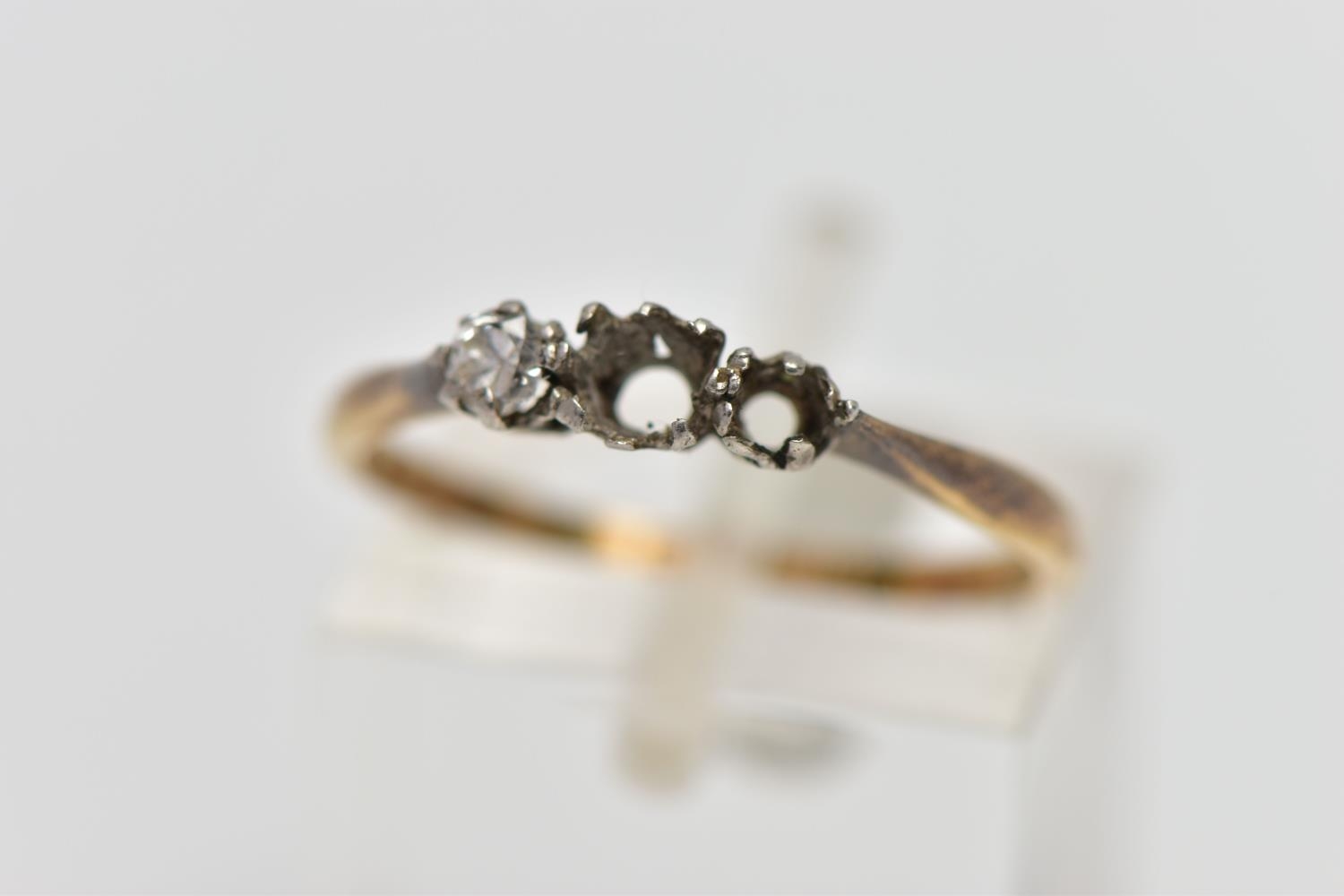 AN AF YELLOW METAL DIAMOND RING, a three stone white metal setting, one single cut diamond prong set (two stones missing), leading onto a pinched shoulder yellow metal band, stamped 18ct plat, ring size K 1/2, approximate gross weight 1.4 grams (condition report: general moderate wear, missing stones, prongs missing)