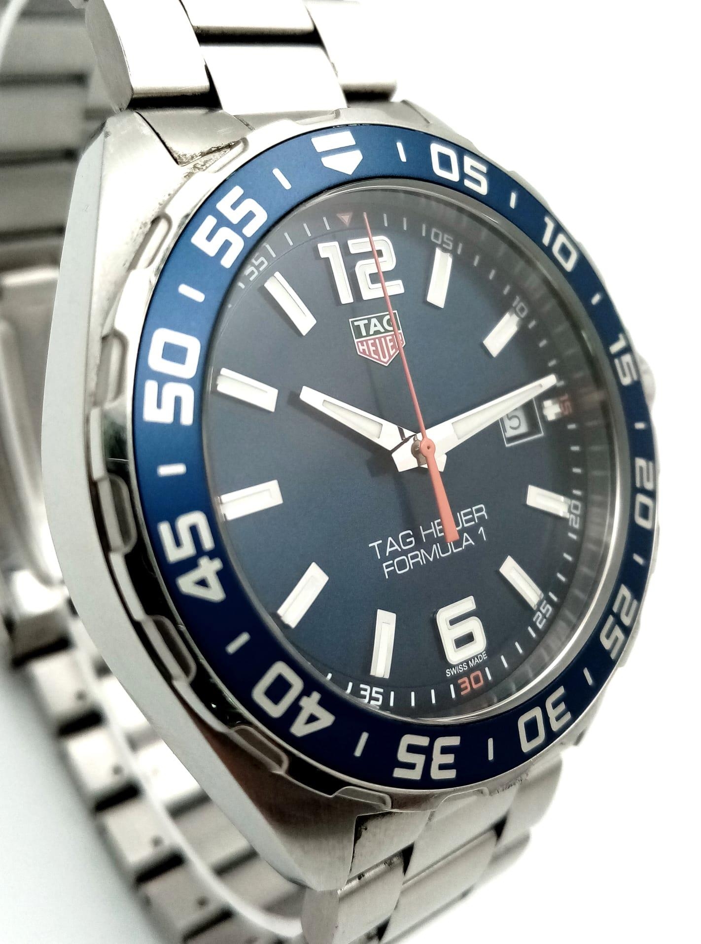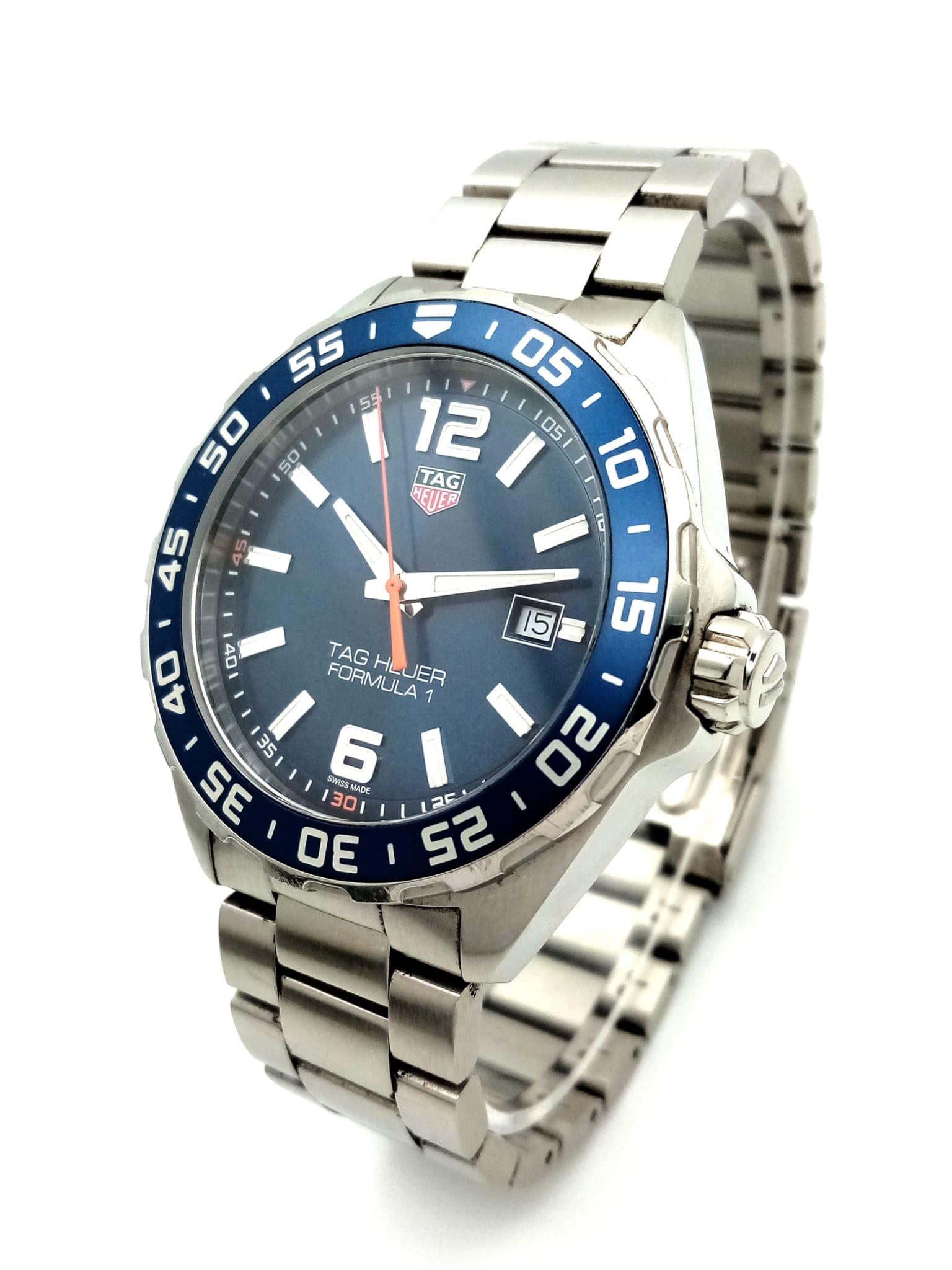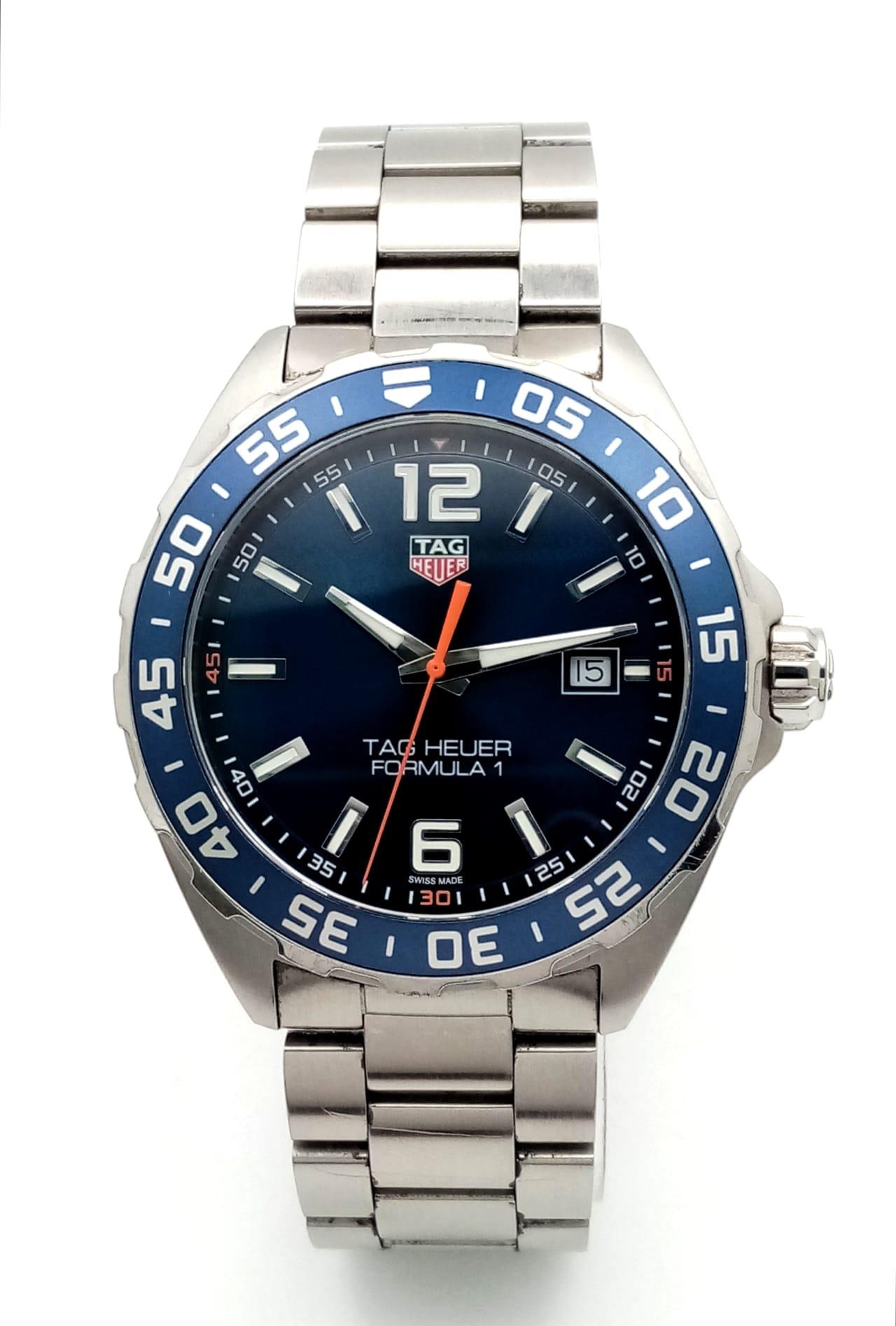 A Tag Heuer Formula 1 Gents Watch. Stainless steel bracelet and case - 43mm. Blue dial with date window. Quartz movement. Comes with box and papers. In good condition and working order. Ref: 15664