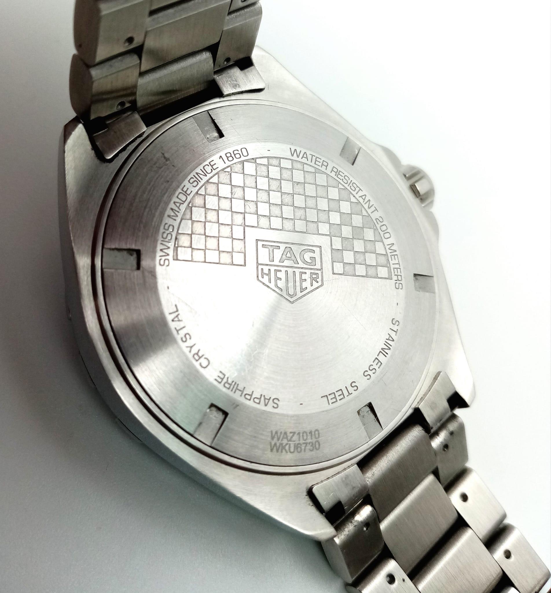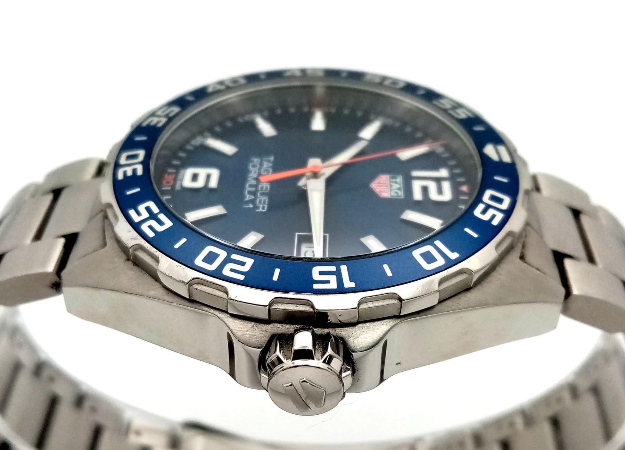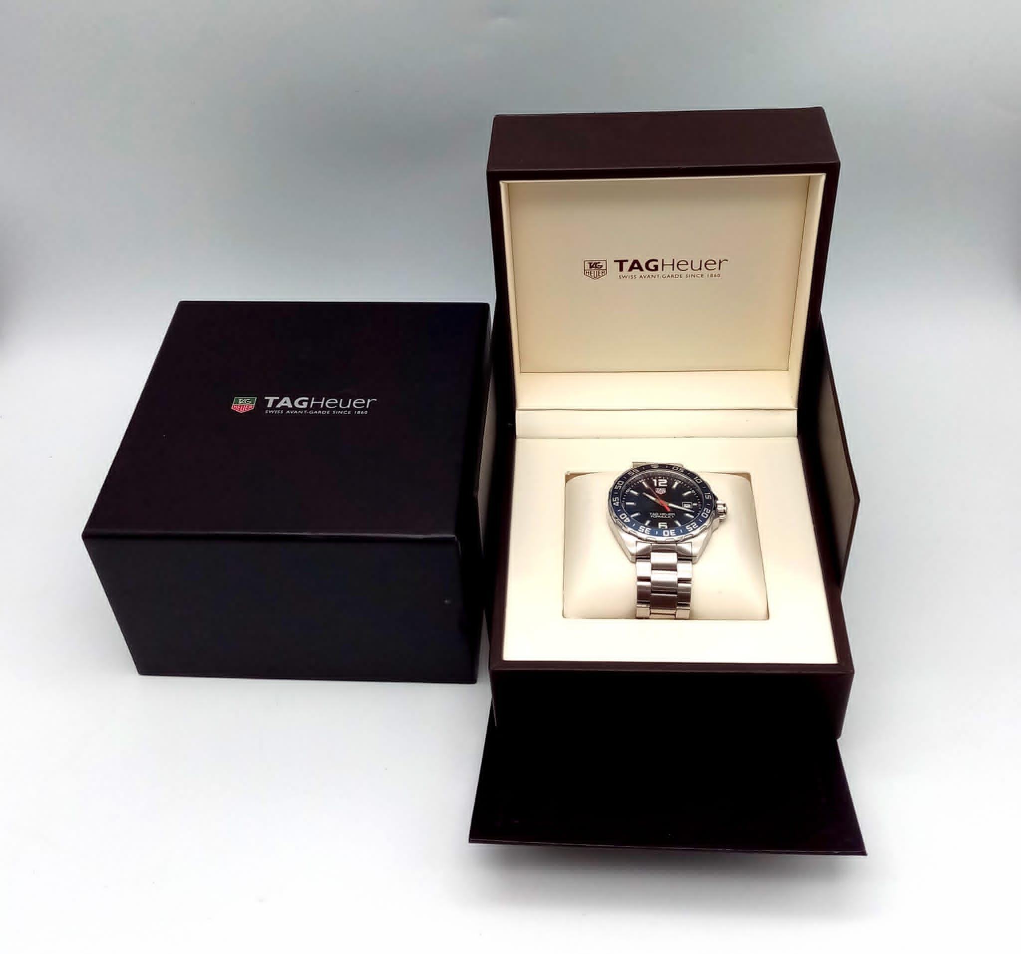 A Tag Heuer Formula 1 Gents Watch. Stainless steel bracelet and case - 43mm. Blue dial with date window. Quartz movement. Comes with box and papers. In good condition and working order. Ref: 15664