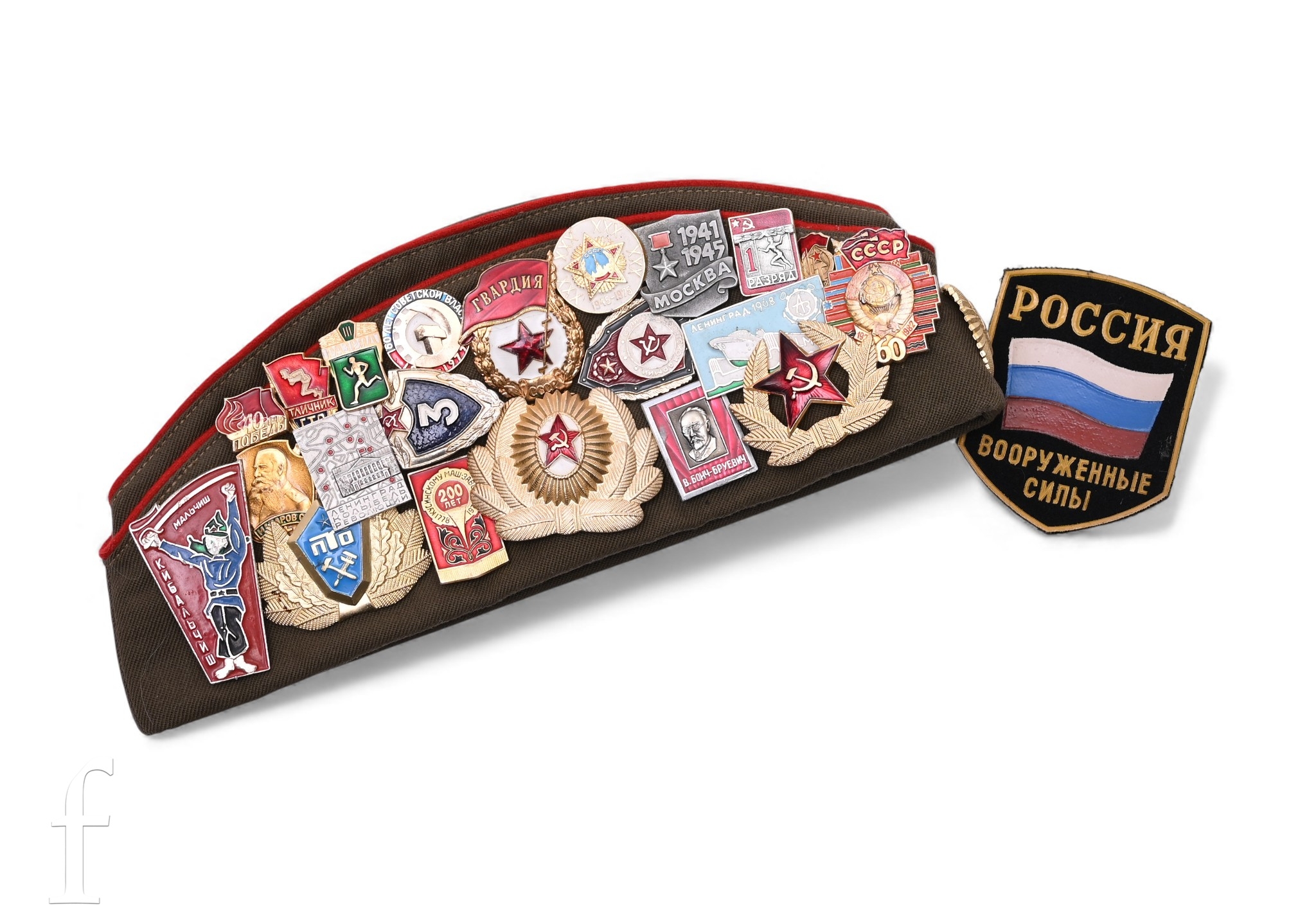 A Russian khaki cloth hat pinned with various enamel badges circa 1960s and 1970s.