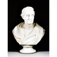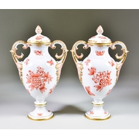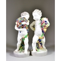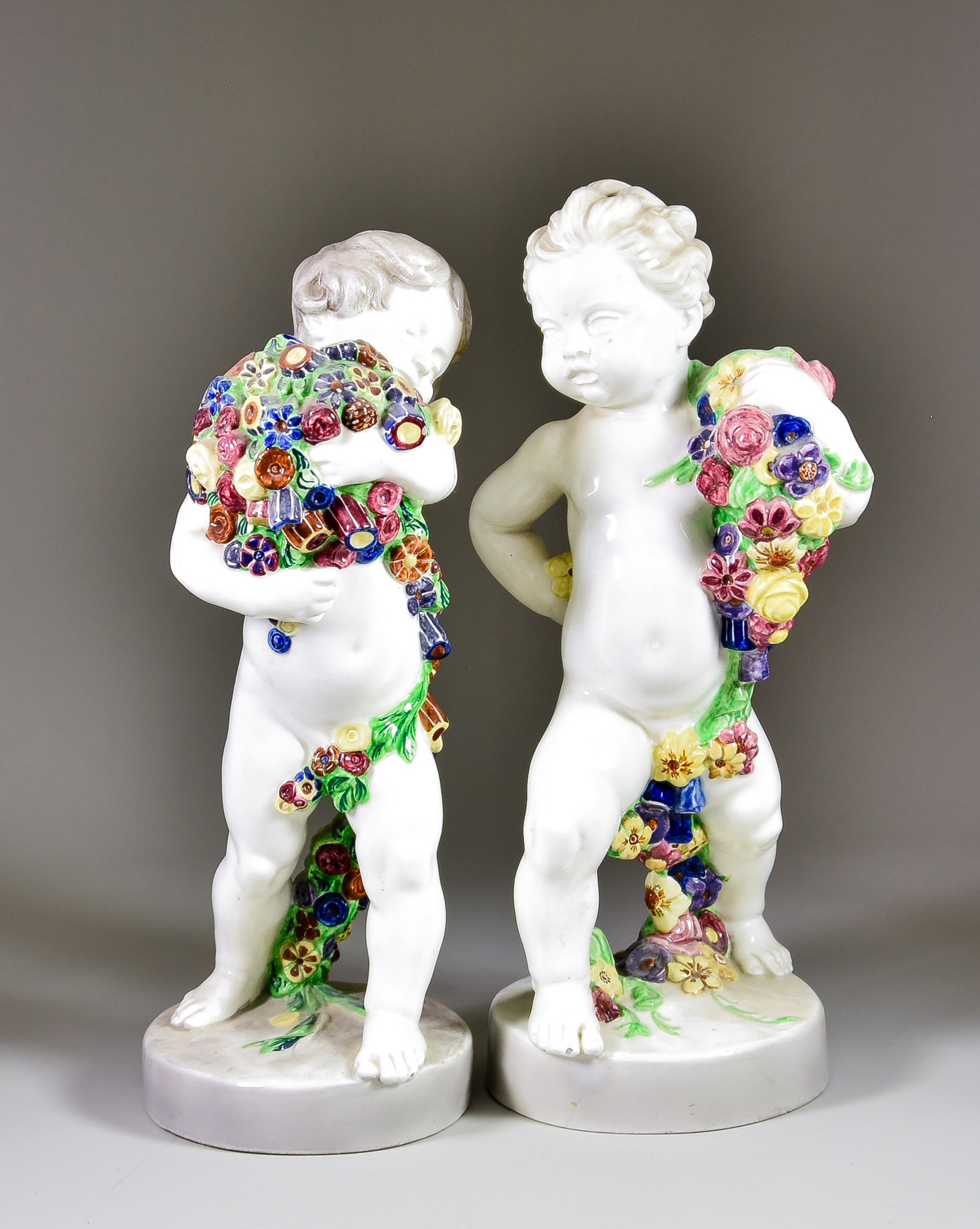 A Pair of Friedrich Goldscheider Ceramic Cherubs, Early 20th Century, each holding a garland of flowers, on circular socles, each with printed marks to base, 13.5ins high