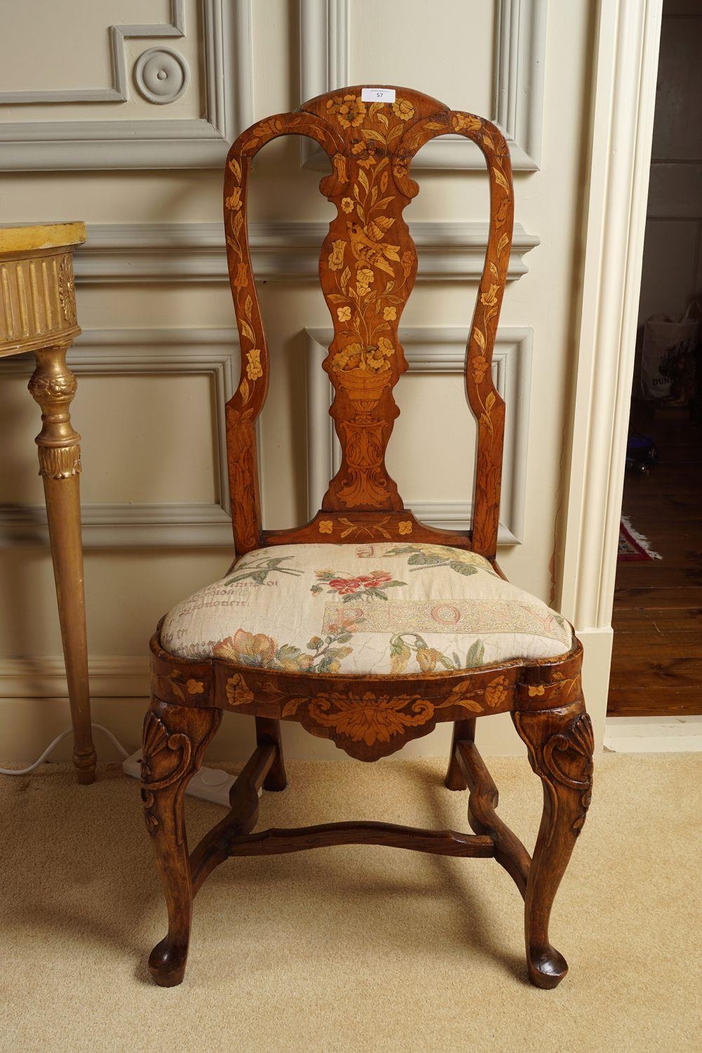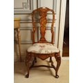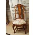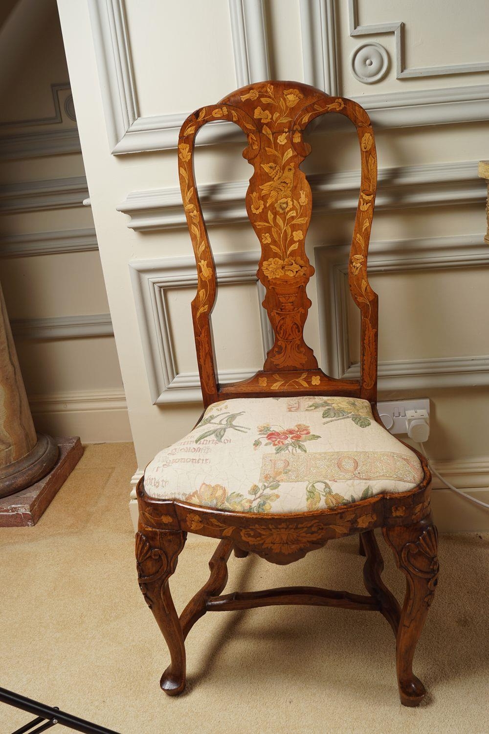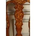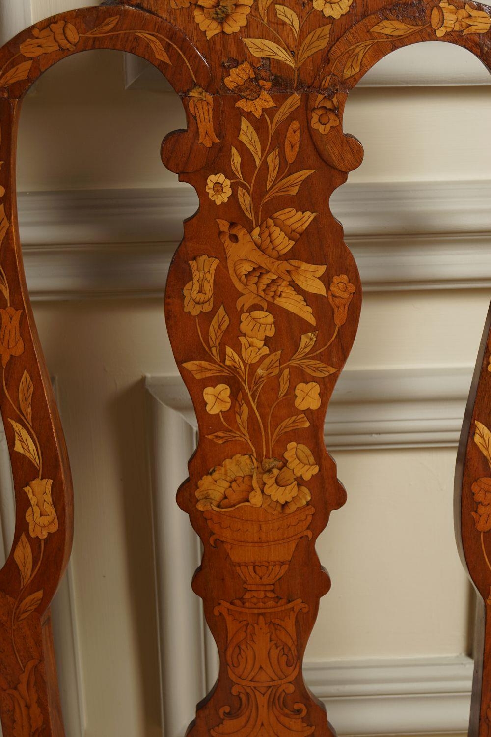 18th-century, each with a tall profusely inlaid back above a shaped drop in seat approx. 120 cm. high; 40 cm. wide; 40 cm. deep