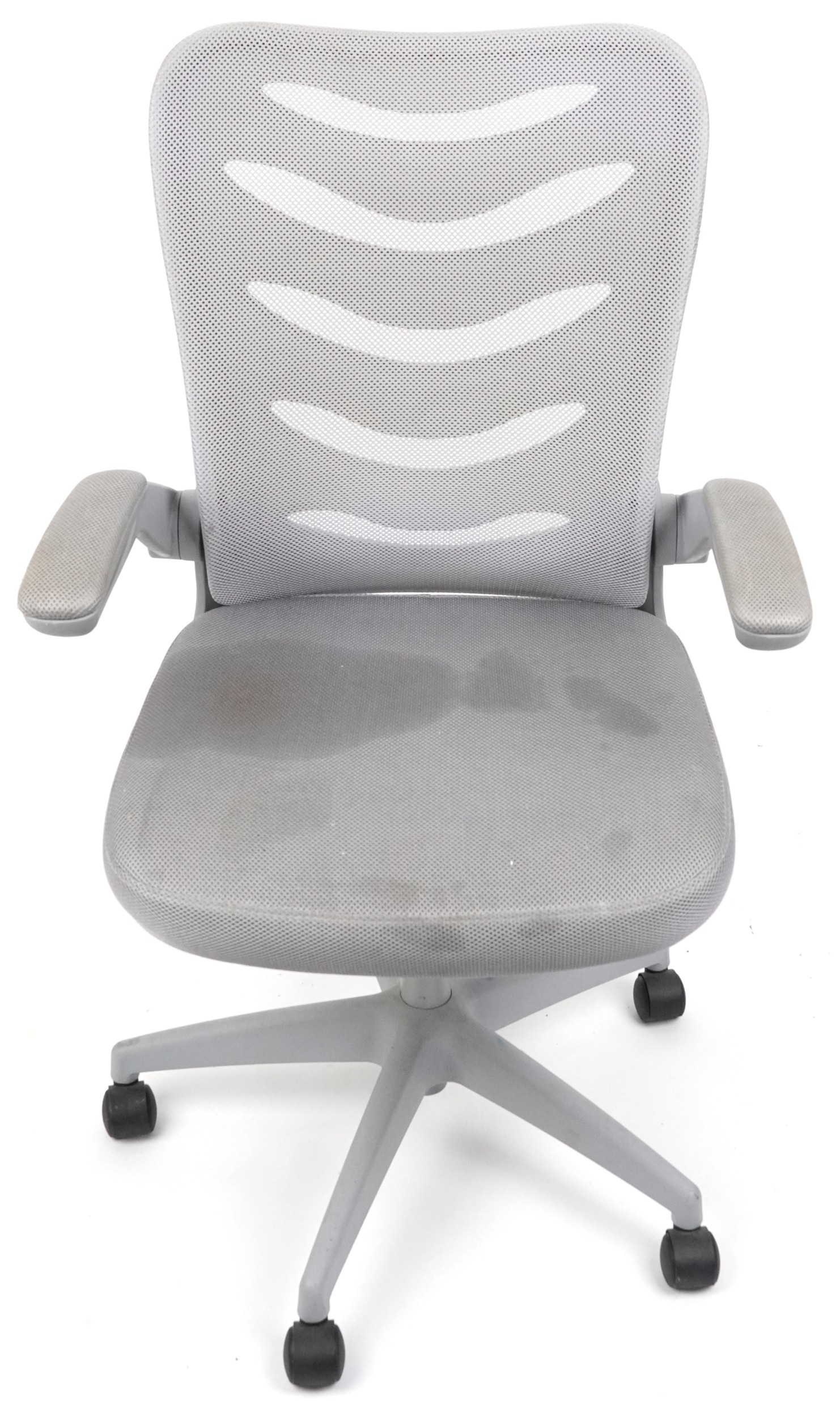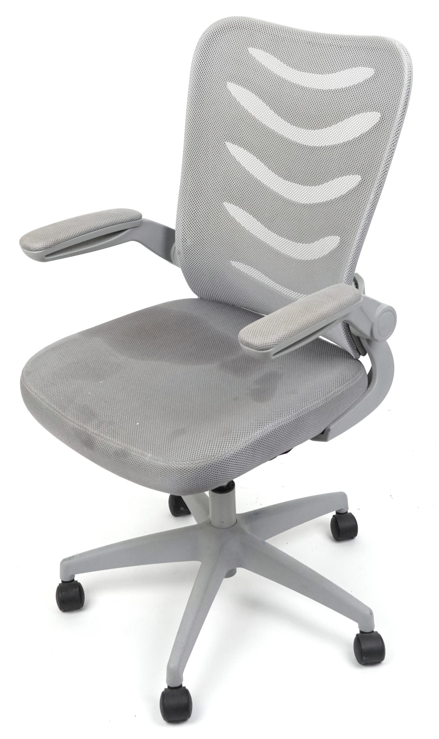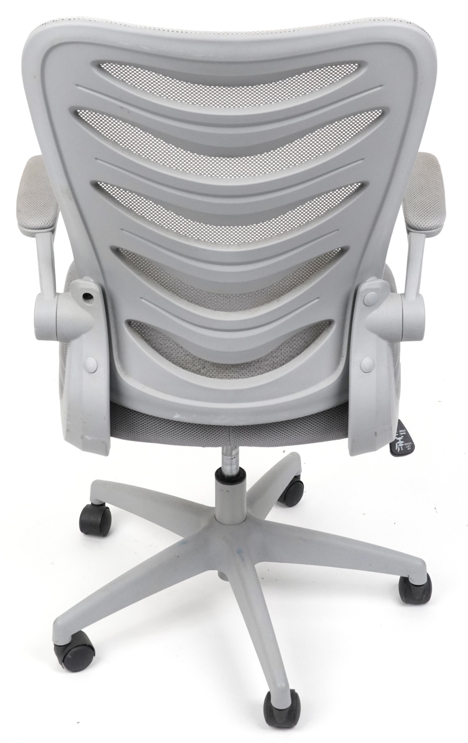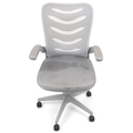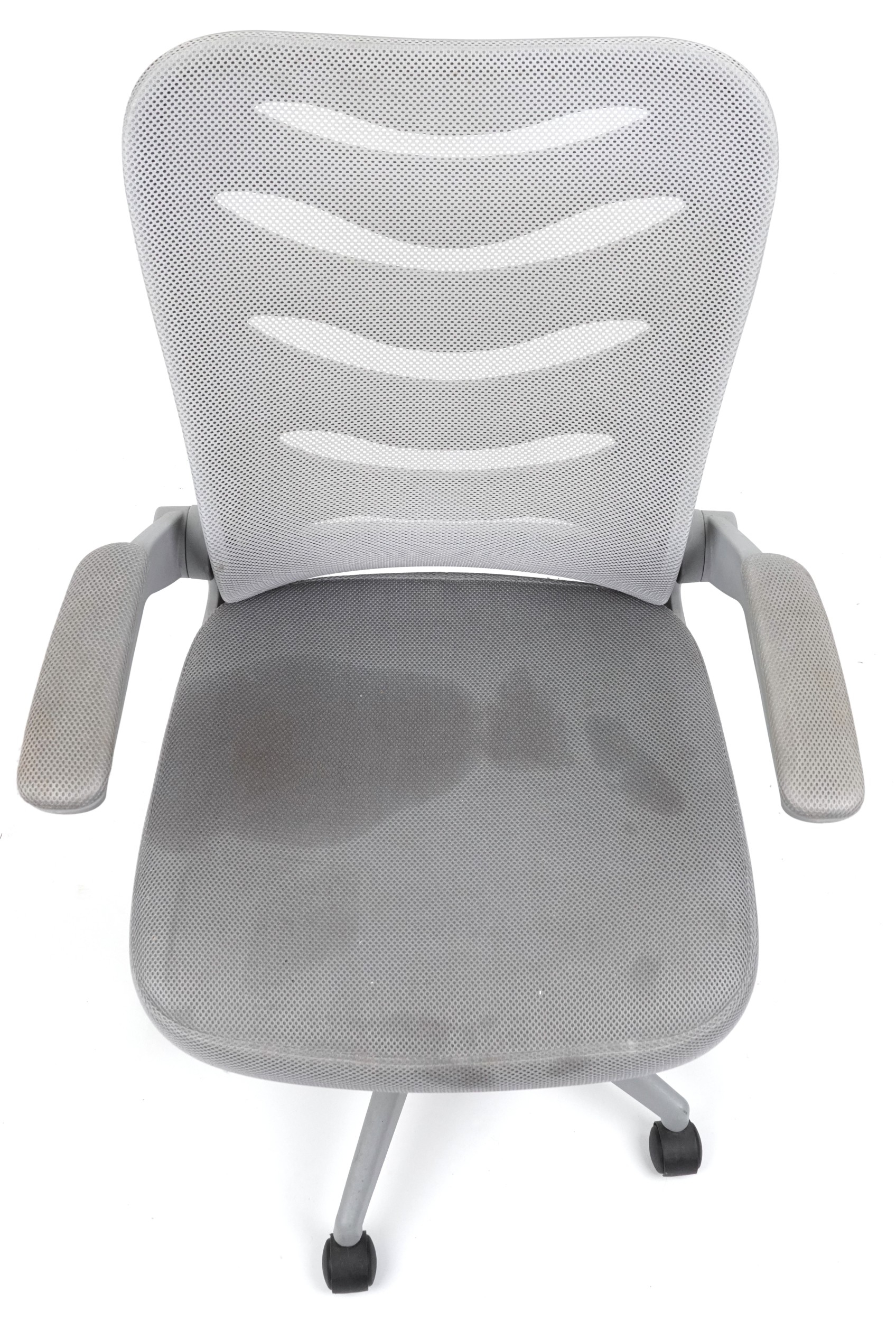 Late 20th century plastic revolving office chair on casters, 106cm high x 62cm wide.