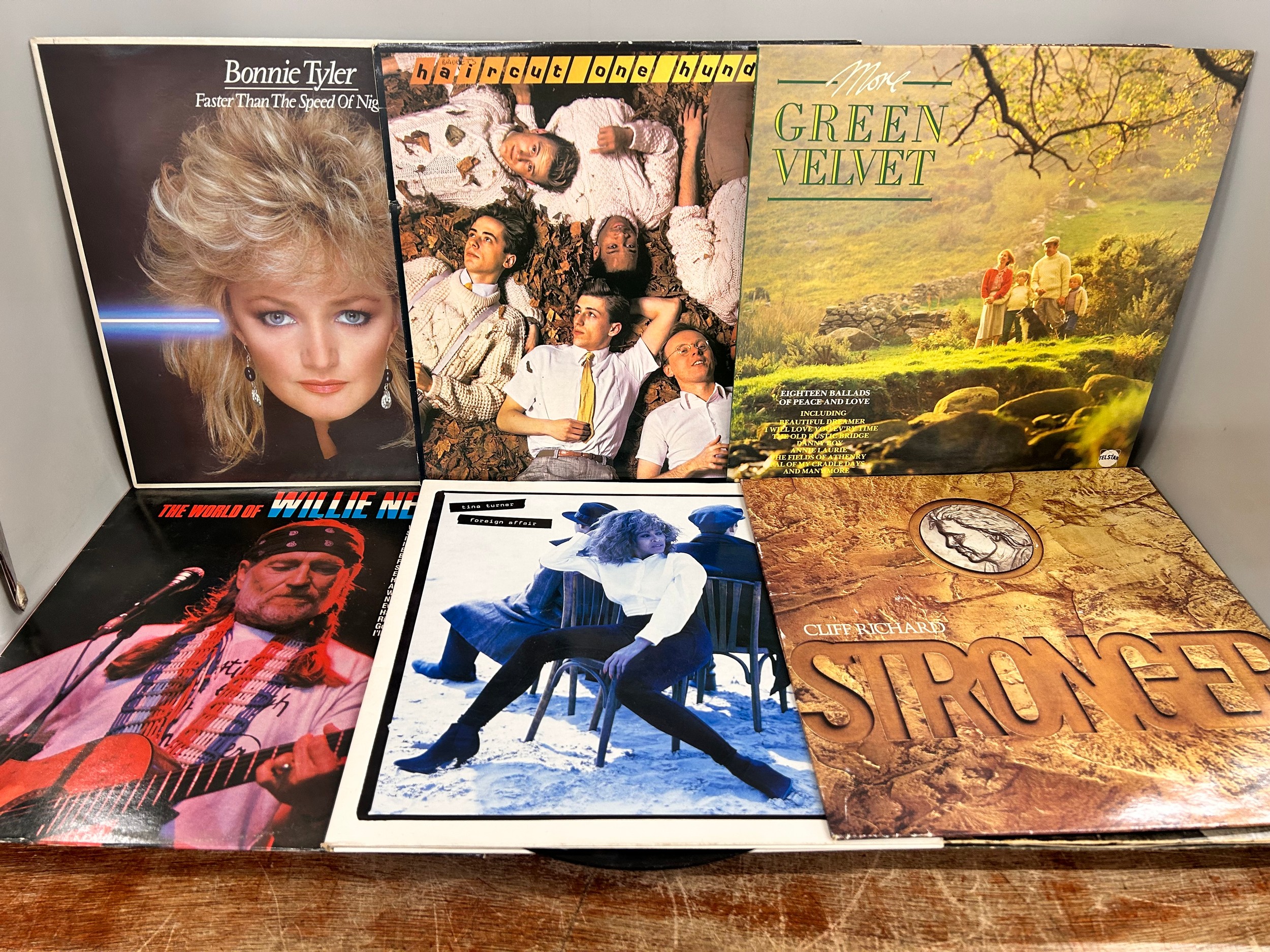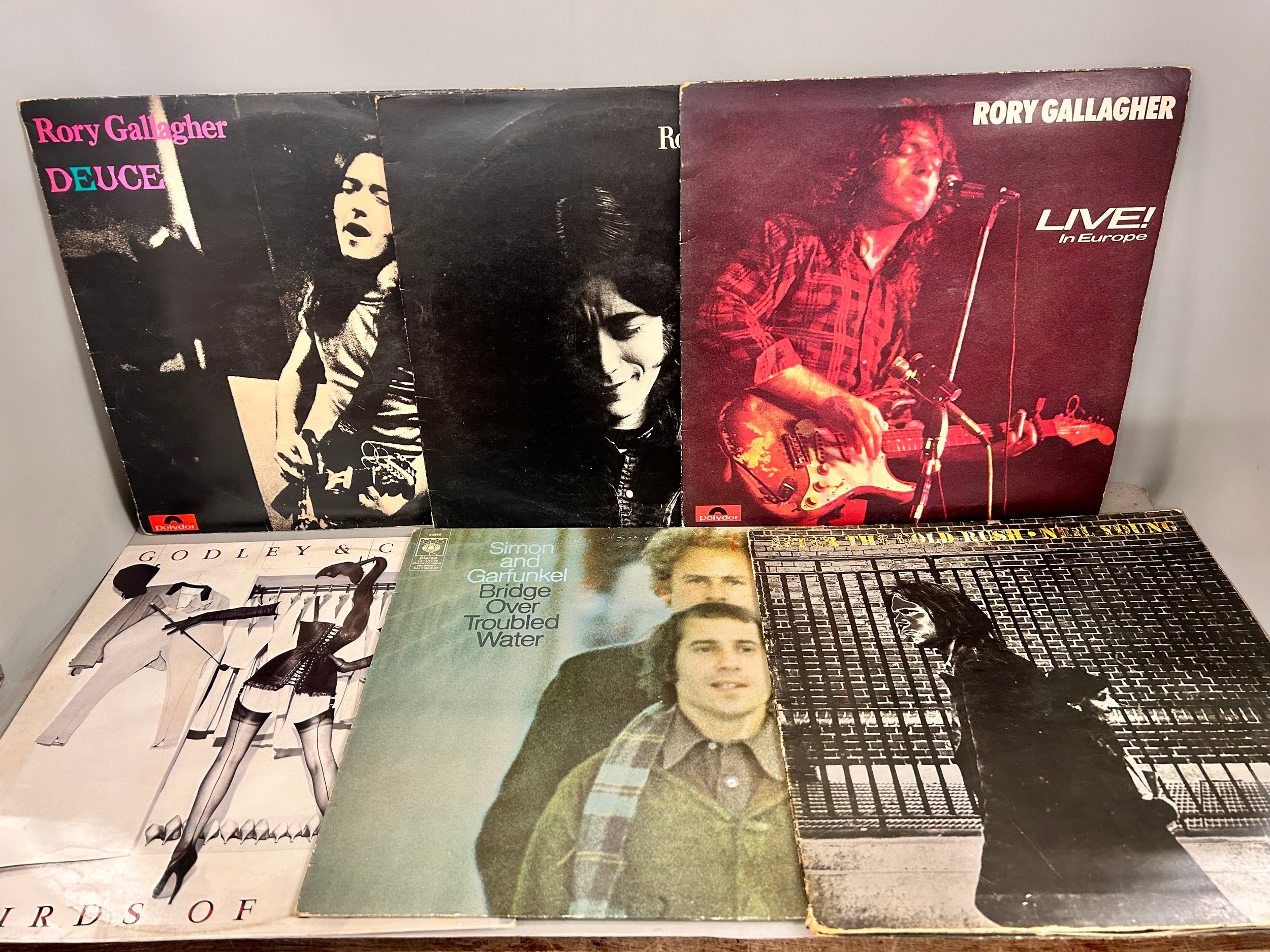 A collection of sixteen vinyl LP records including Rory Gallagher, Neil Young, Tina Turner, etc.