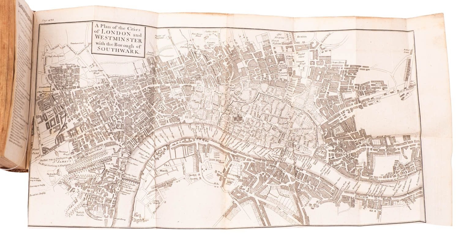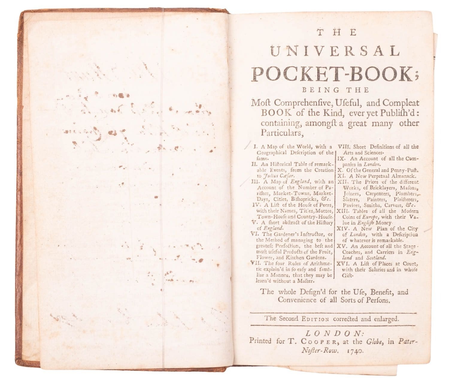 [ANON]. The Universal Pocket Book; being the Most Comprehensive, Useful, and Compleat Book of the Kind, ever yet Publish'd..., the second edition, corrected and enlarged, London: Printed for T. Cooper, at the Globe, 1740, folding double-hemisphere map, folding map of England and Wales, folding plan of London and Westminster (small tear), woodcut head-pieces, illustration, tables, contemp. ink inscriptions to ffep, contemp. panelled calf scuffed, 12mo. [ESTC: T209353]