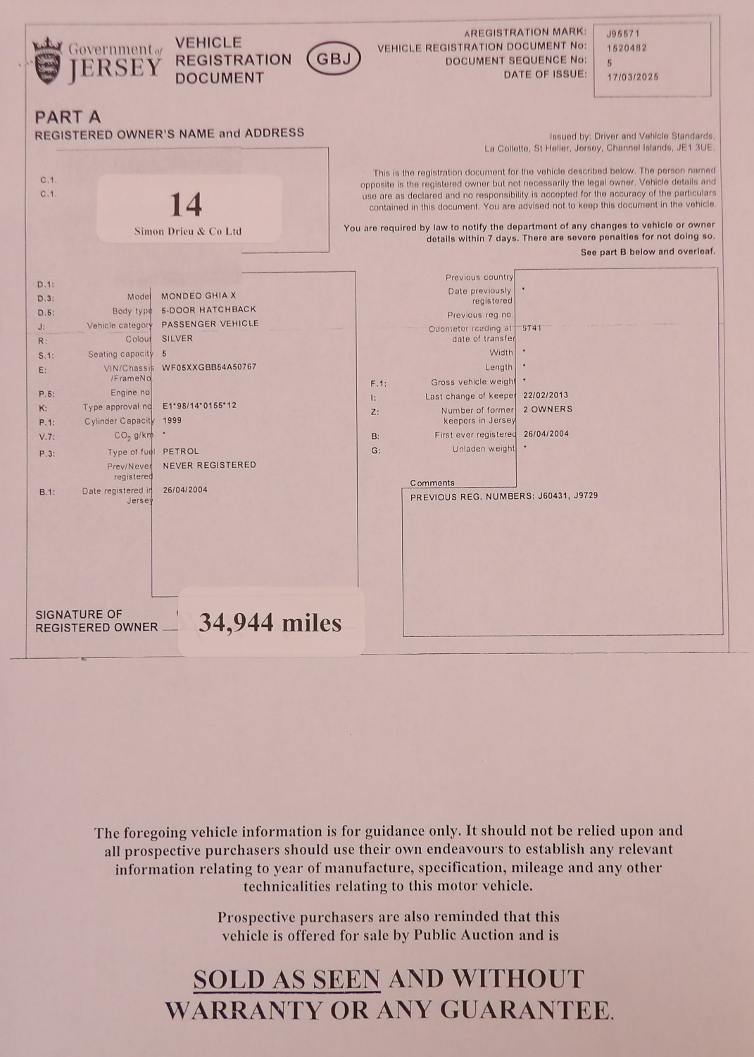 A 2004 Ford Mondeo Ghia X 2.0 five door hatchback J95571 (petrol/automatic), odometer reading 34,944 miles only
