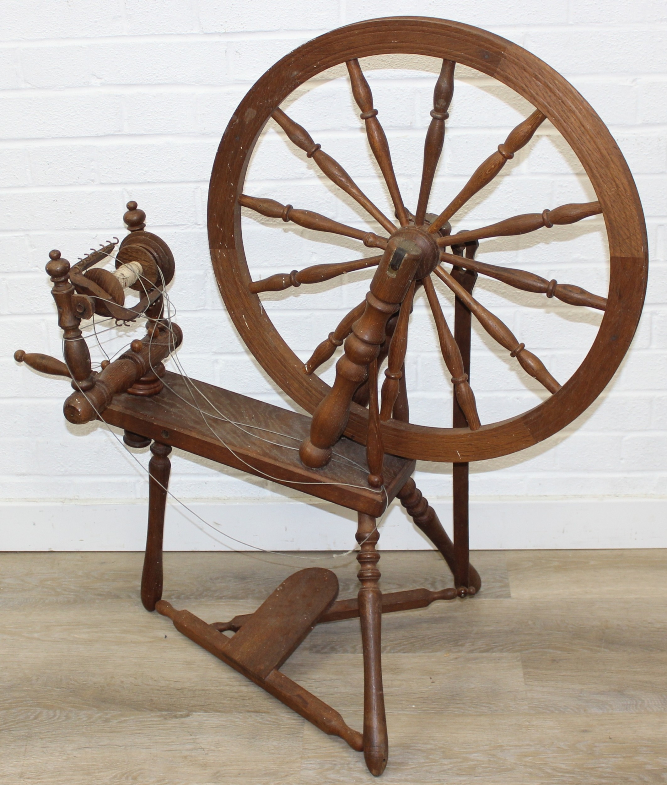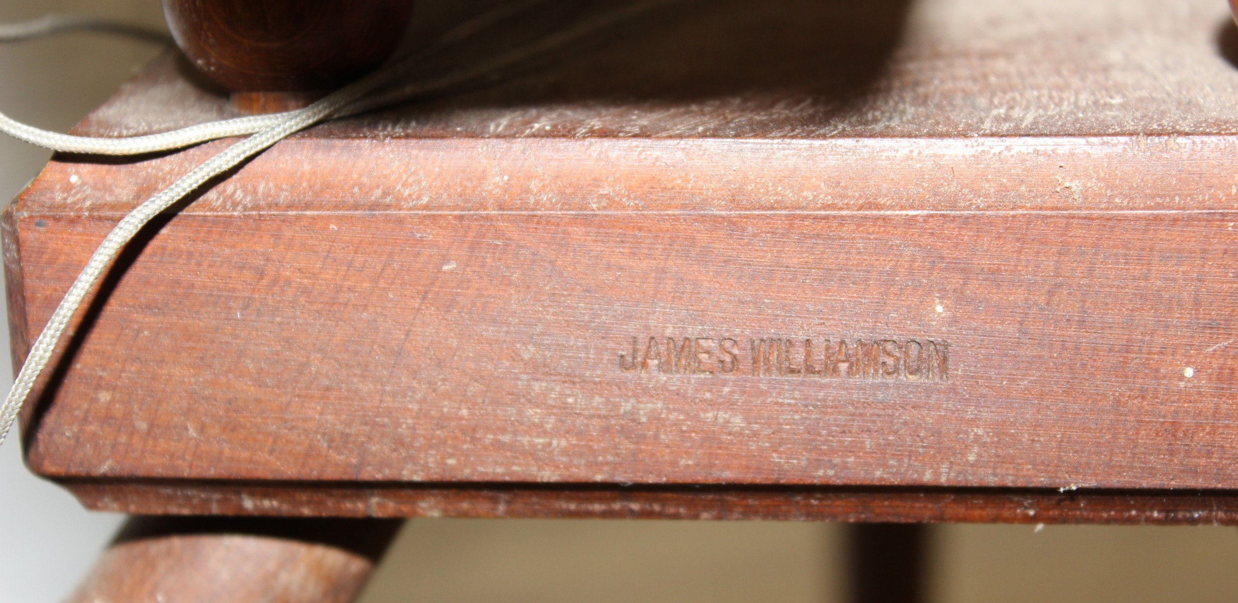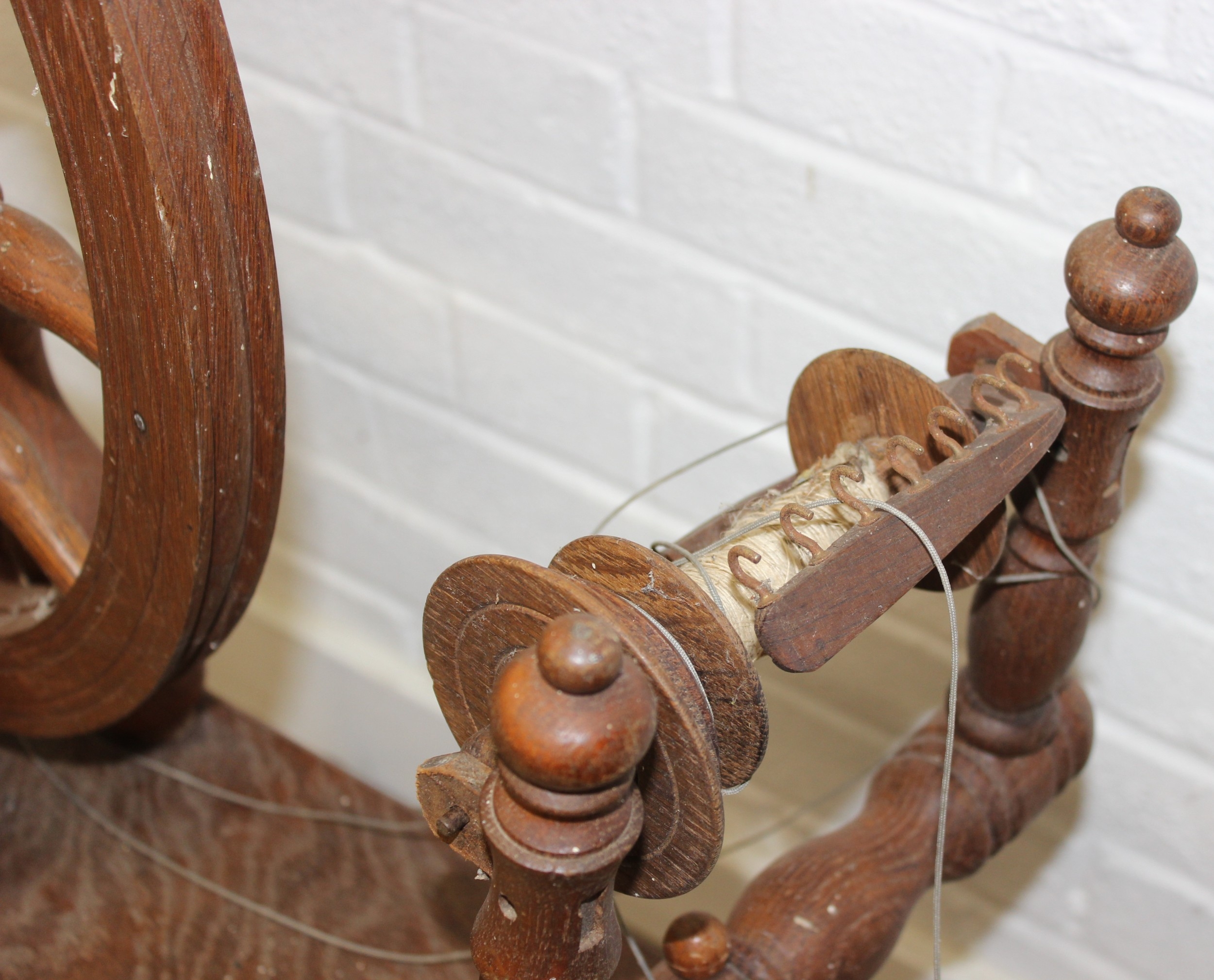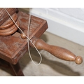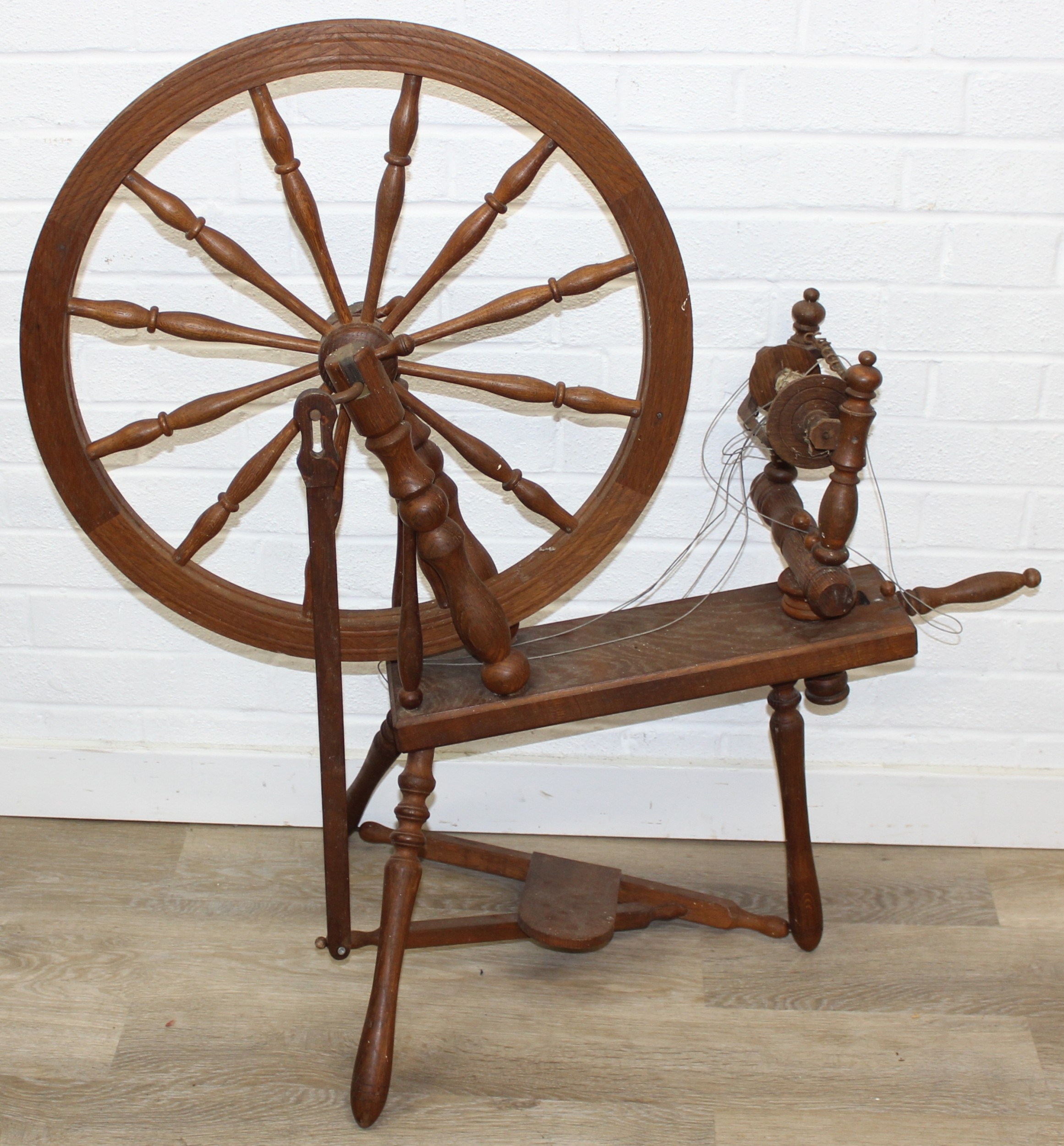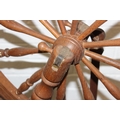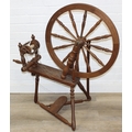 James Williamson (believed to be for Timbertops Thurmaston), a vintage oak or elm spinning wheel, stamped 83 S02, 98cm tall