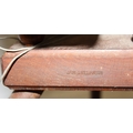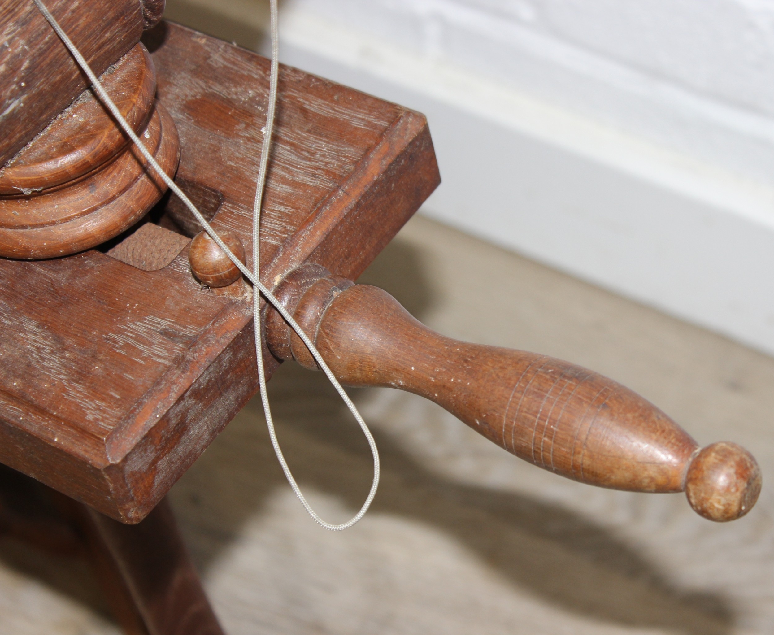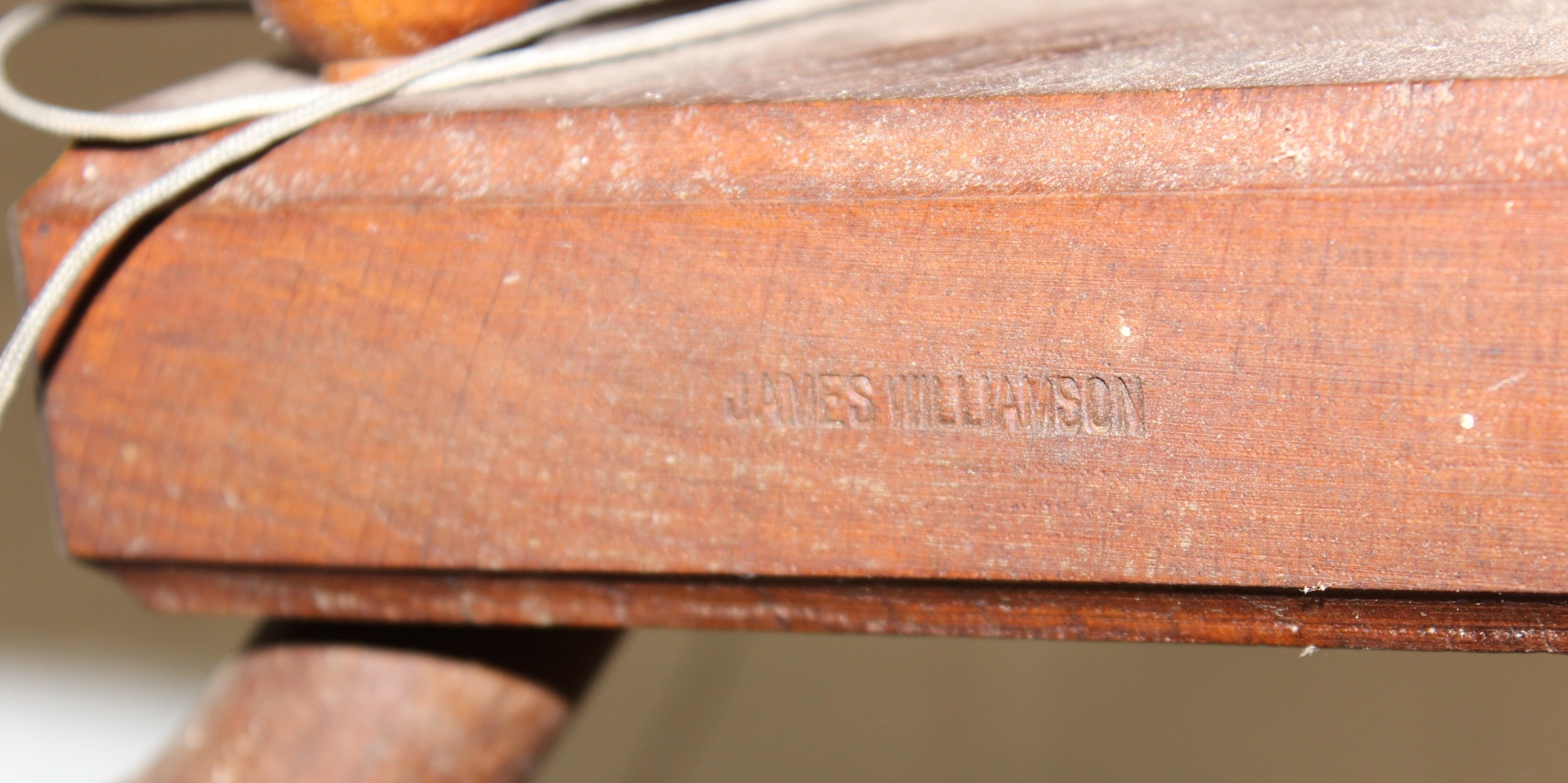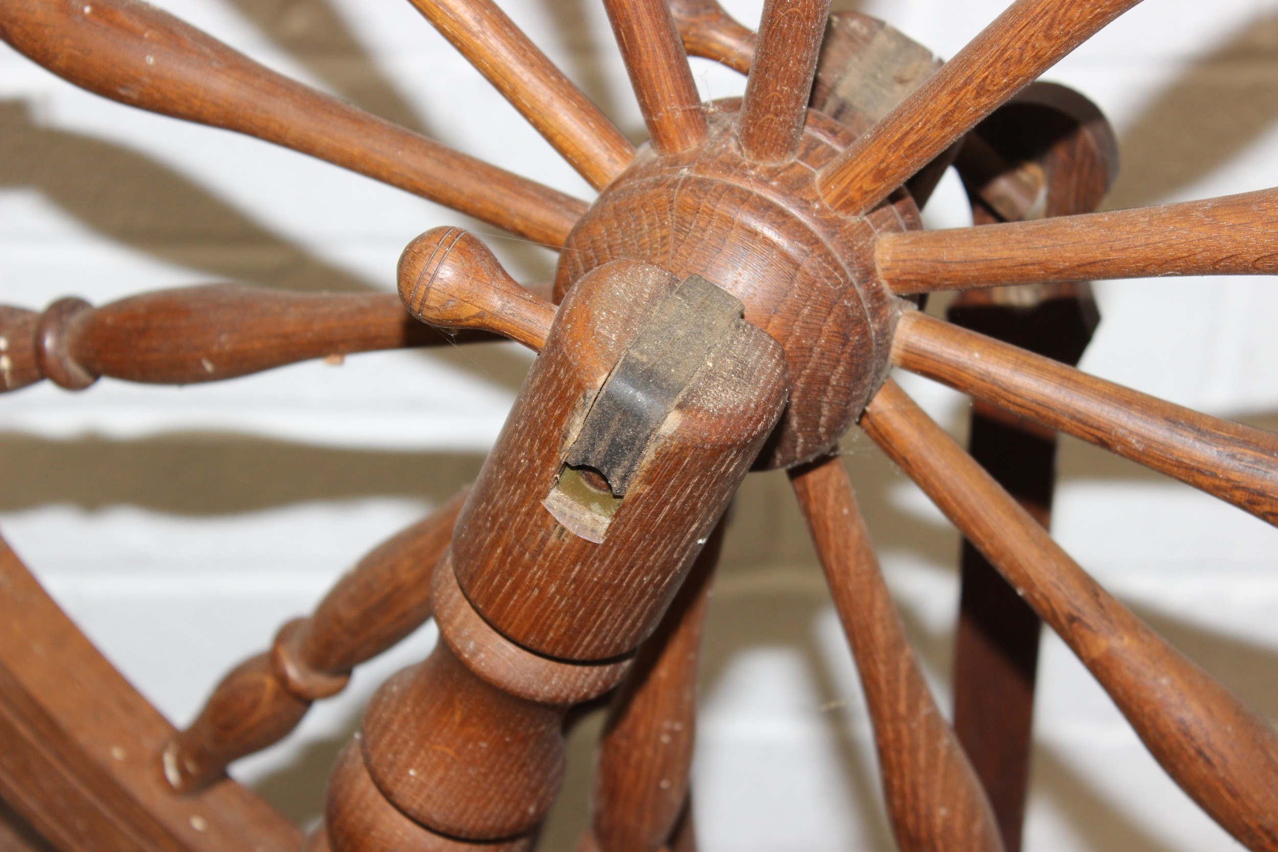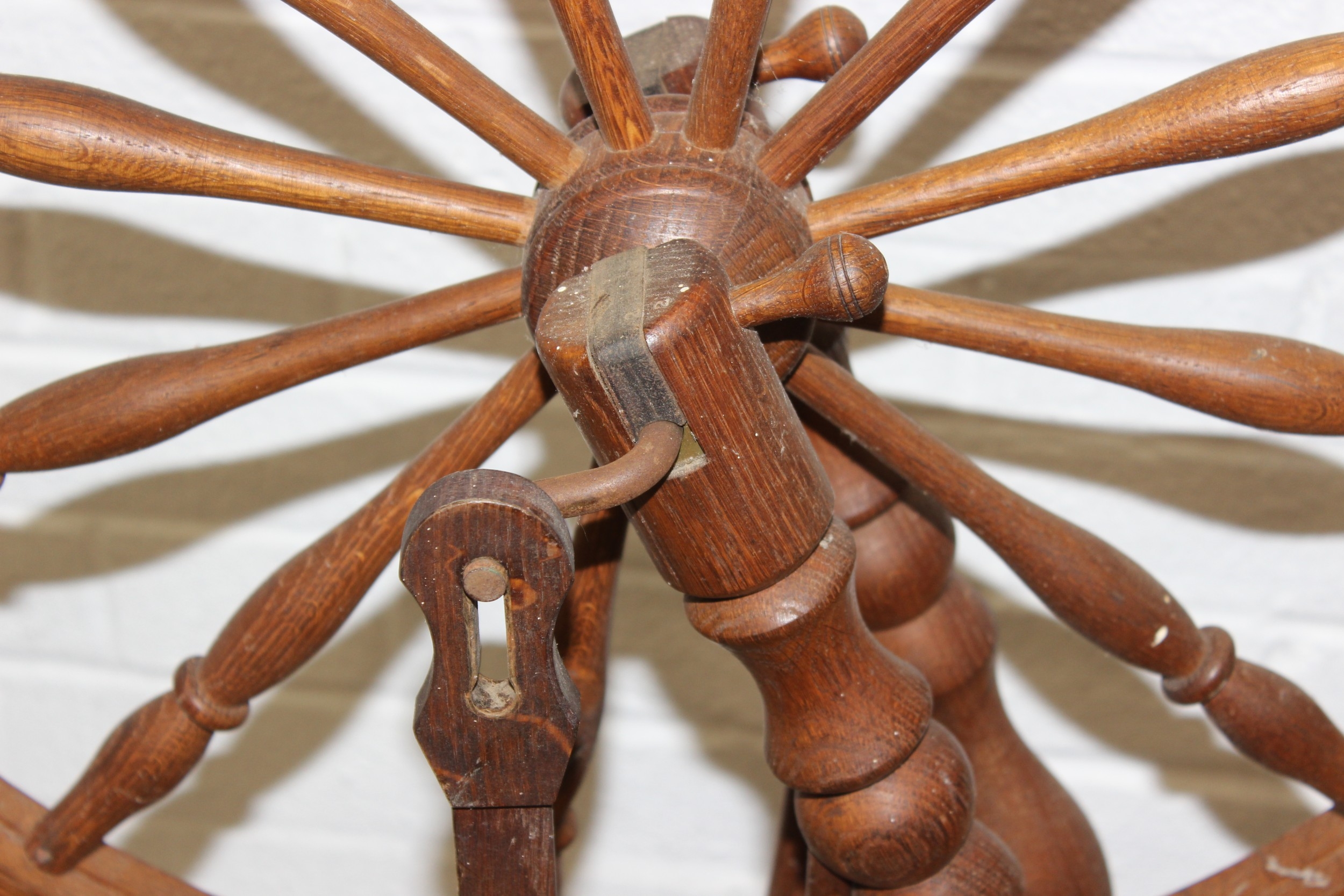 James Williamson (believed to be for Timbertops Thurmaston), a vintage oak or elm spinning wheel, stamped 83 S02, 98cm tall