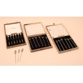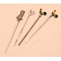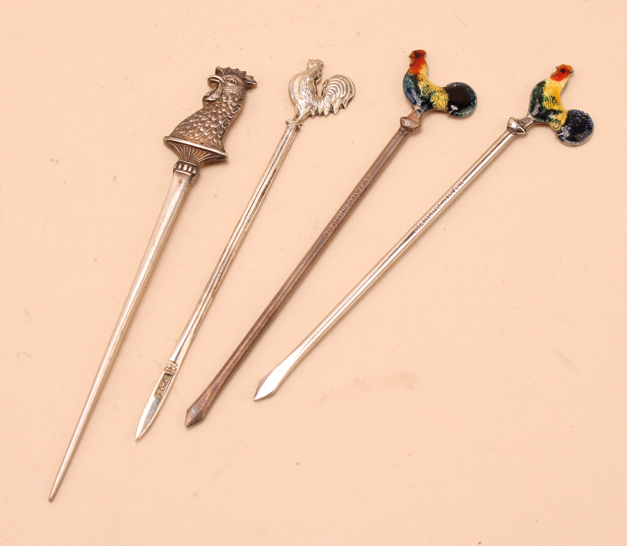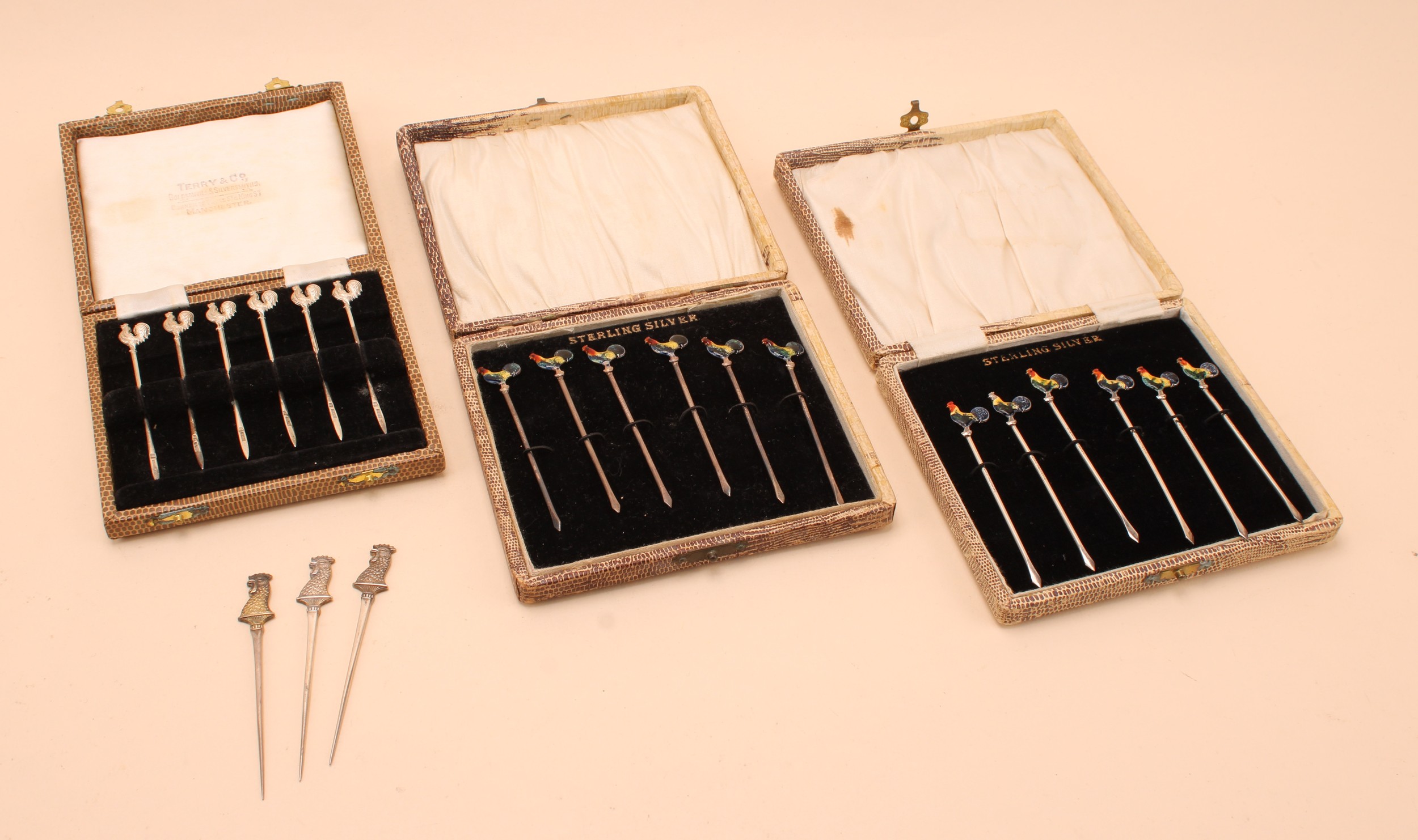 A set of six Elizabeth II silver cocktail sticks or toothpicks, the terminals as cockerels, 7cm, Birmingham 1955, 12.5g, boxed; a set of 1930s silver cocktail sticks, the enamelled terminals as cockerels, marked 'Sterling', 7.5cm, 17.5g, boxed; another set similar, 17g; three George V silver toothpicks, silver gilt cockerel terminals, Sheffield 1933, 8cm, 15.7g