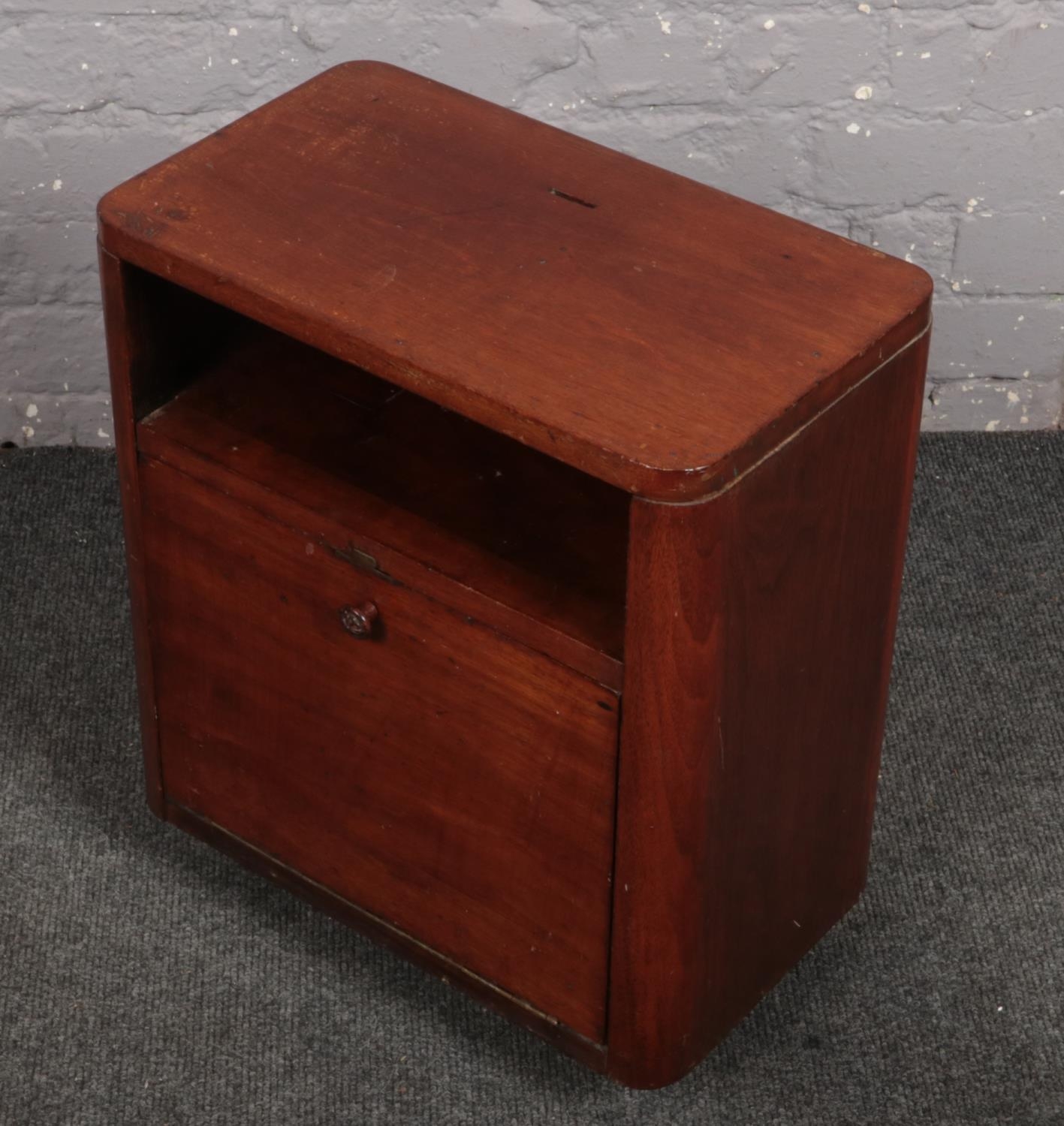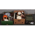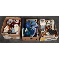 Three boxes of miscellaneous to include art glass, books, Le Creuset jug, ceramics, mahogany bedside cabinet etc.