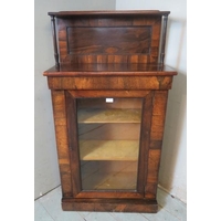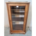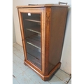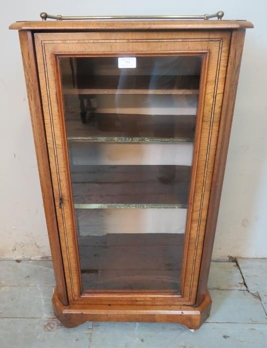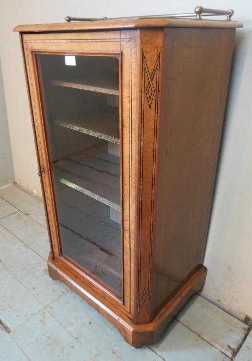 A Victorian walnut parquetry inlaid music cabinet with brass gallery rail and glazed door opening onto three shelves.